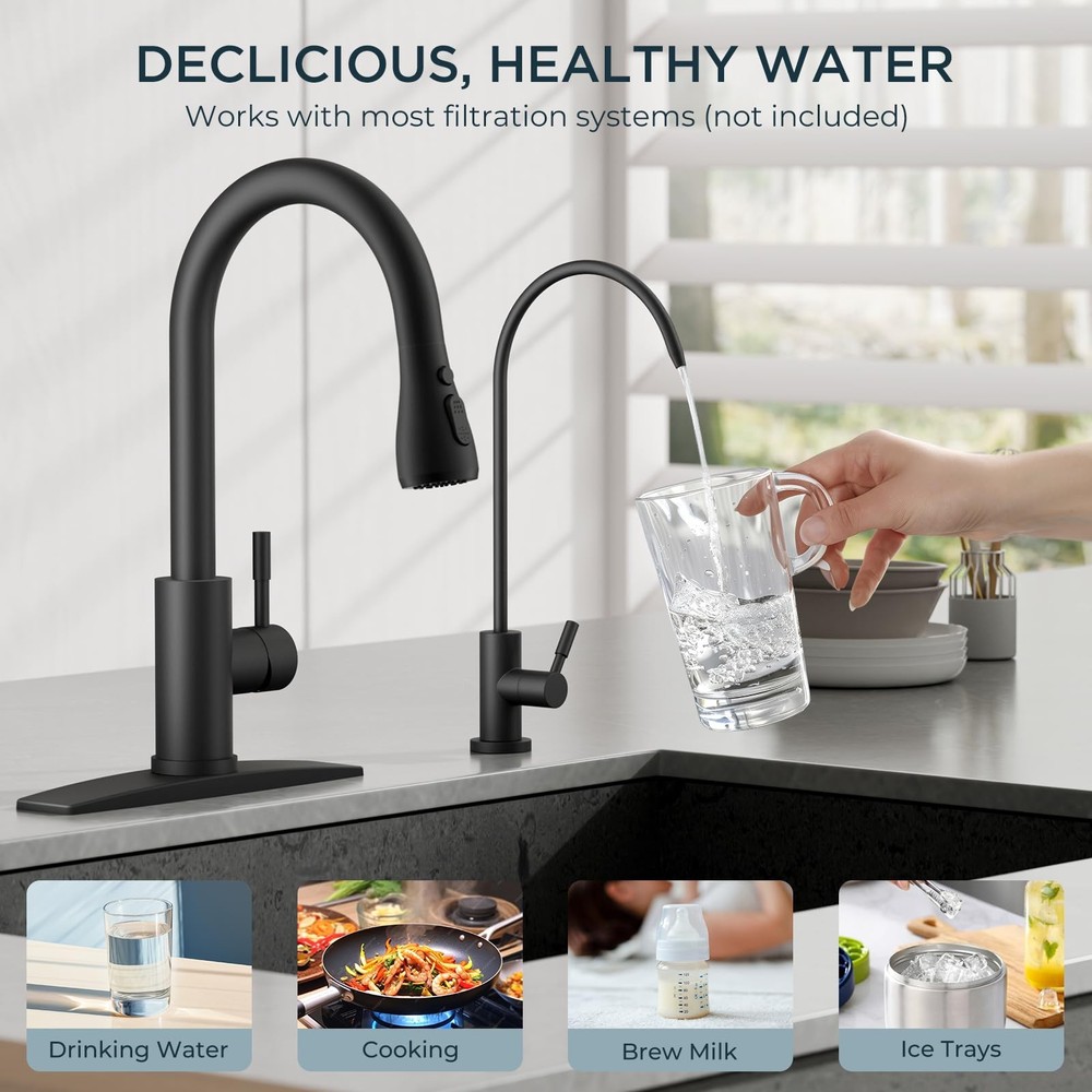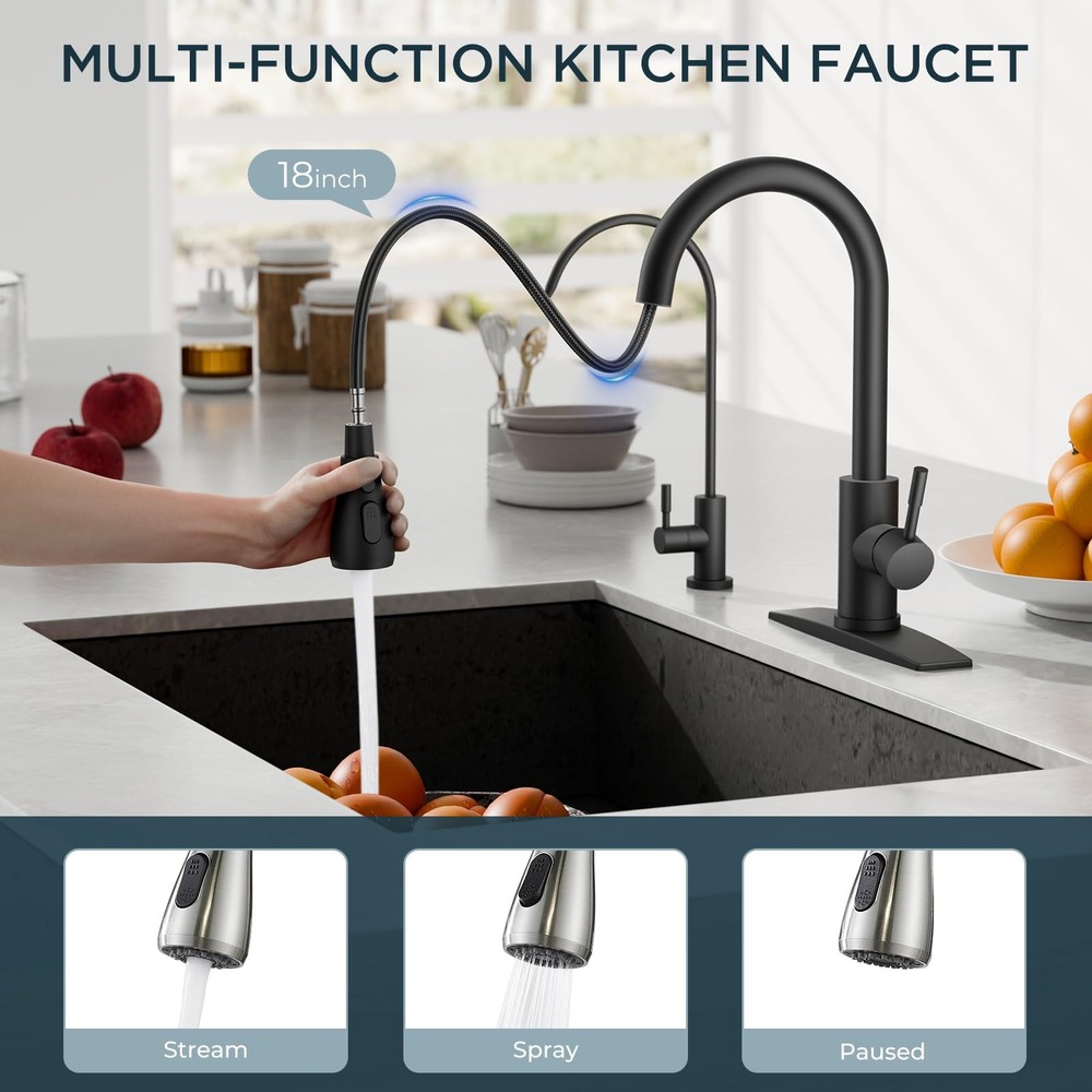 Product Name: Kitchen Faucet and Water Filter Faucet Combo 1. Perfect Match: Create an elegant transitional style and redefine the functionality of your kitchen with this faucet combo, featuring a kitchen faucet and a matching water filter faucet. 2. Made with lead-free stainless steel, the versatile kitchen faucet with a 3-function pull-down sprayer, which to switch from an aerated stream or spray for everyday cleaning. 3. The drinking water faucet demands and connects to a most of under-counter purification systems and filtration systems (Not included, Sold Separately). 4. The high-arc spout is perfect for filling glasses, pitchers, and reusable water bottles. 【Cost-Efficient Set】The Kitchen Faucet and Water Filter Faucet Combo is designed to complement any kitchen style while enhancing functionality. Made from lead-free stainless steel, the set includes a 3-function pull-down sprayer and a matching filter faucet that eliminates the need for bottled water, providing a value-added solution for any home 【Reassuring Material】The kitchen faucets are crafted from food-grade SUS 304 stainless steel and lead-free waterways prevent contaminants. The premium ceramic cartridge ensures long-lasting leak-free performance with over 500,000 cycles of testing 【Pull Down Kitchen Faucet】 This bar kitchen faucet with pull down sprayer offers three mode settings (Stream, Spray, Pause) for effortless rinsing and water control. Its 18 inch retractable hose and 360° rotating sprayer ensure efficient coverage of your sink 【Drinking Water Faucet】This non-air gap filter faucet is compatible with most under-counter Reverse Osmosis and filtration systems (not included). It offers easy installation and provides purified water anytime and encouraging healthier hydration 【Quick Setup】This bar sink faucet features quick-connect technology with a drop-in base for 1 or 3 holes. The water filter faucet includes two quick connector sizes (1/4" and 3/8") to accommodate various installation needs. Installation can be completed in under 30 minutes without professional assistance
