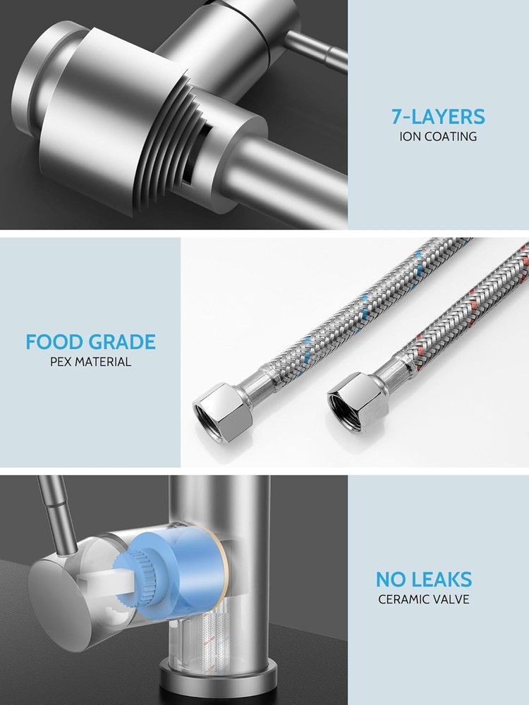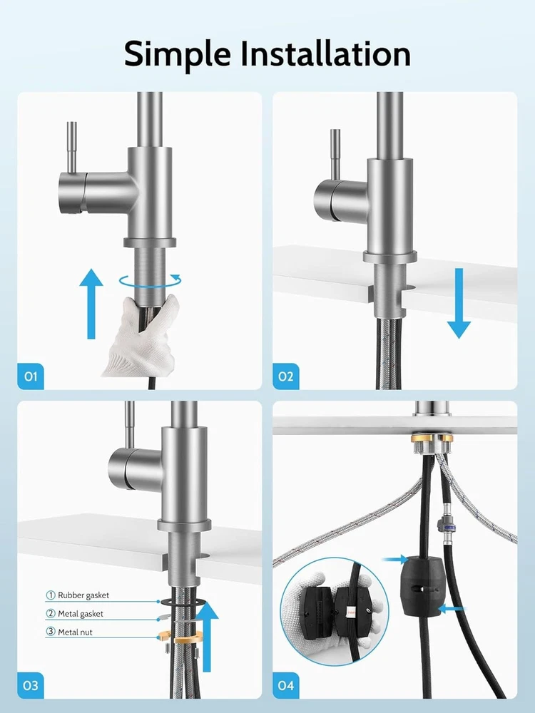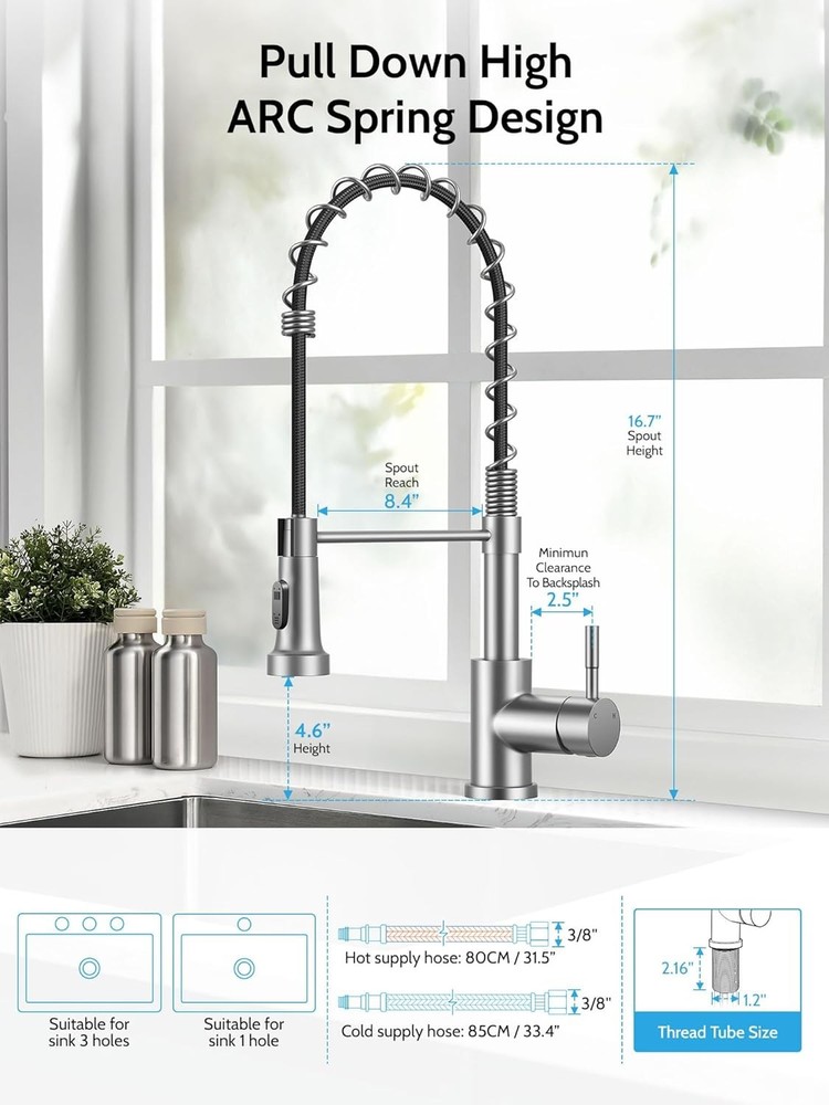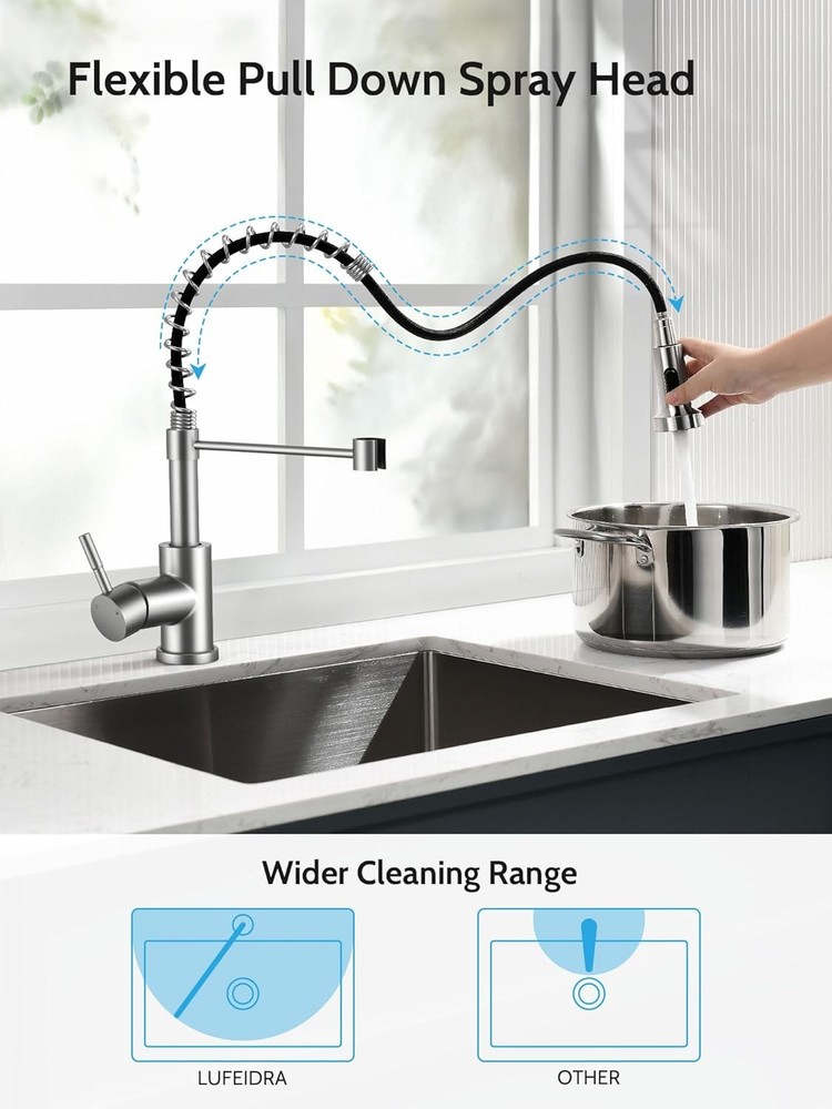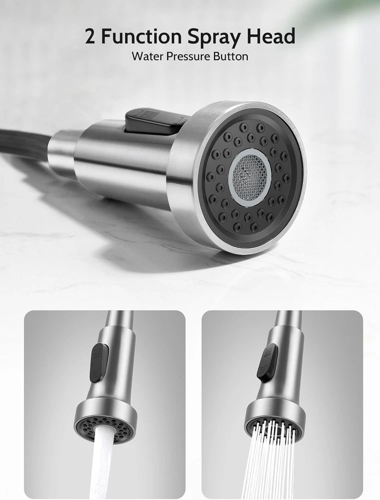 Easy to Install :Installation of kitchen faucets can be completed in 10 minutes, when you have prepared.We can also provide installation videos to help you finish install our brushed nickel kitchen faucets with pull down sprayer better and faster Pull Down Sprayer Design:Use flexible pull-down nozzles up to 17 inches in length. This means that you can expand your cleaning range, while the rotatable faucet body ensures that you can rotate 360 degrees. Dual Mode Sprayer:brushed nickel kitchen faucet with pull down sprayer possess two water modes. The stream mode is used for filling water quickly and accurately into the container without sputtering. The spray mode rinse the dishes for large area Stable and Widely Used : matte brushed nickel kitchen sink faucets with sprayer is suitable for both single hole sink and three hole sinks, fit for RV, Camper, Farmhouse, Bathroom , Outdoor, wet bar, travel trailer, Grifos De Cocina