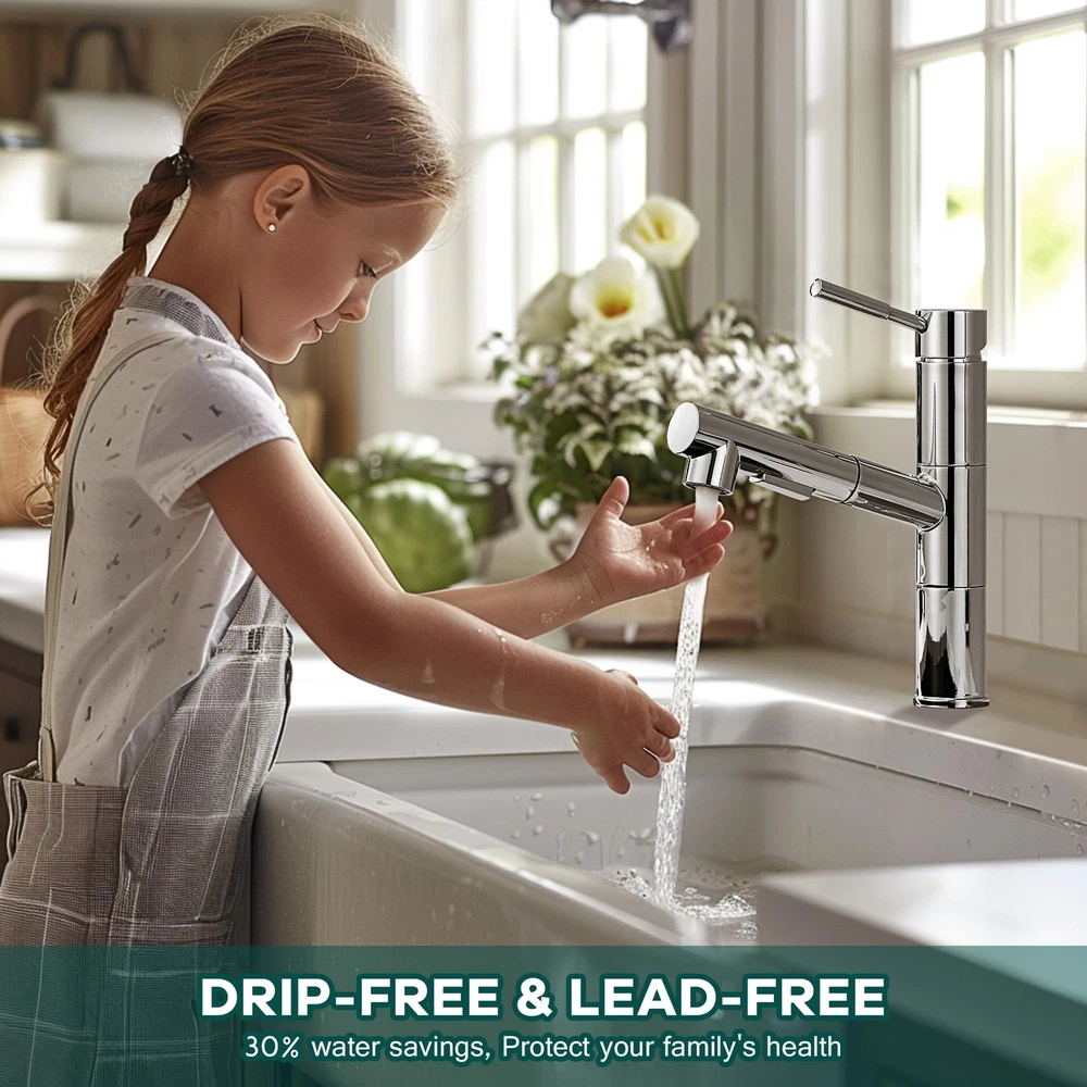 Kitchen Faucets, Chrome Kitchen Faucet with Pull Down Sprayer, Modern Stainless Steel Kitchen Sink Faucet Commercial RV Kitchen Faucet with Deck Plate 2 Modes Spray Spot Resist Product Details Color: Chrome Brand: FROPO MPN: YG-KF-058C UPC: Does not apply EAN: Does not apply Brand: FROPO Recommended Uses For Product: Bar, Bathroom, Kitchen, Outdoor Mounting Type: Deck Mount Finish Type: Polished Material: Stainless Steel Color: Chrome Number of Handles: 1 Hole Count: 1 Handle Type: handle Valve Type: Cartridge Valve Brand: FROPO Recommended Uses For Product: Bar, Bathroom, Kitchen, Outdoor Mounting Type: Deck Mount Finish Type: Polished Material: Stainless Steel Color: Chrome Number of Handles: 1 Hole Count: 1 Handle Type: handle Valve Type: Cartridge Valve Handle Material: Stainless Steel Spout Height: 5.75 Inches Spout Reach: 7 Inches Warranty Type: limited Handle Location: Center Spout Design: Low Arc Hose Length: 19 Inches Is Electric: No Manufacturer: FROPO Product Dimensions: 8"D x 1.75"W x 9"H Part Number: YG-KF-058C Item Weight: 4.44 pounds Item model number: KF-105CP Finish: Polished Batteries Included?: No Batteries Required?: No Date First Available: April 17, 2024 NO WATER LEAKAGE: The pull out kitchen faucet main body and internal piping are made of solid brass with tight joints that won't leak. The rv kitchen faucet can save 30% water. Two SPRAY MODES : The pull-out sprayer on the kitchen sink faucet with TWO spray setting modes (STREAM and SPRAY) for a steady, gentle, splash-free water flow, both of which can be used for different washing requirements. DURABLE FINISH: Our stainless steel kitchen faucet have a 5-layer surface coating that is rust and fingerprint resistant and easy to clean, simply scrub the pull down kitchen faucet with a damp cloth for a clear and neat look. AFTER SALE SERVICE: Feel free to contact us if you have any questions about our kitchen faucet with pull down sprayer, we will solve the problem perfect.