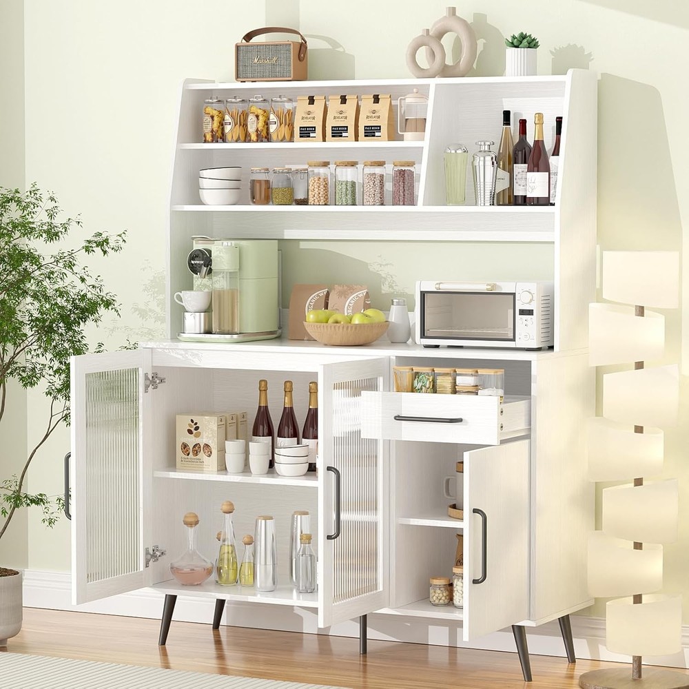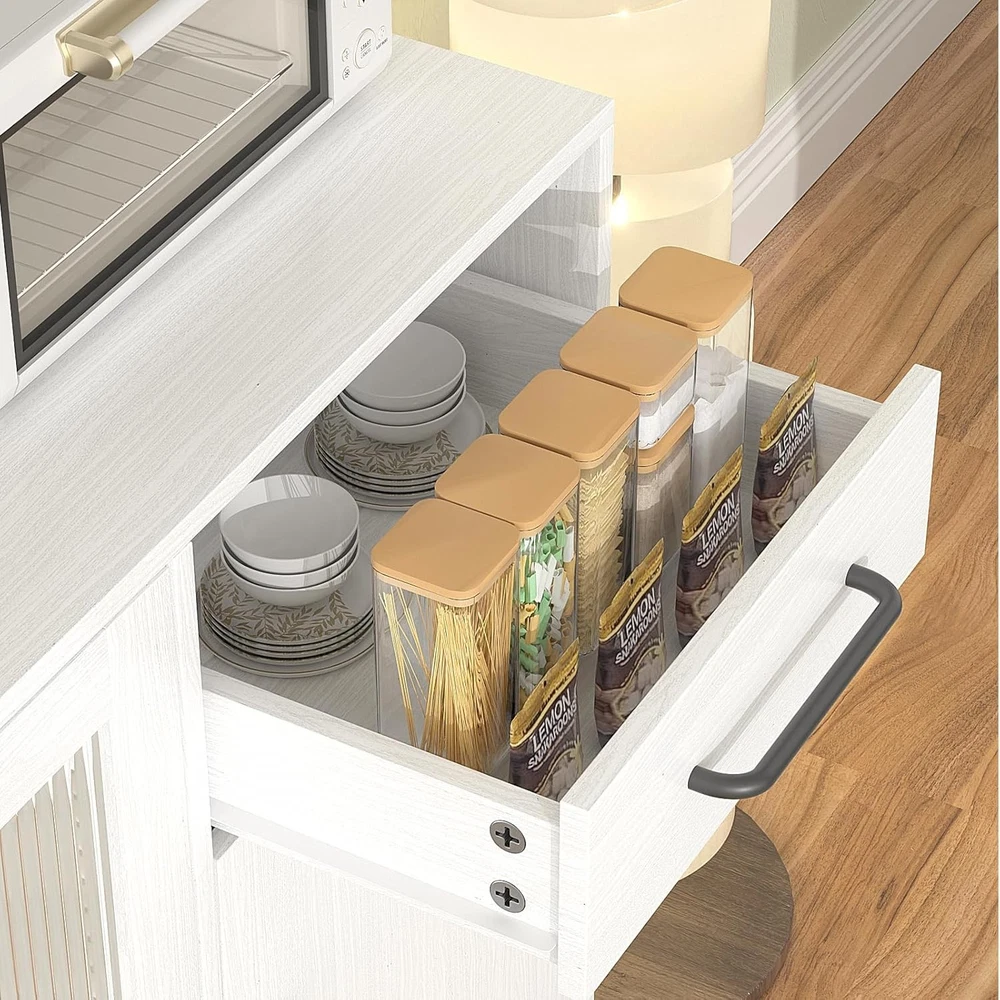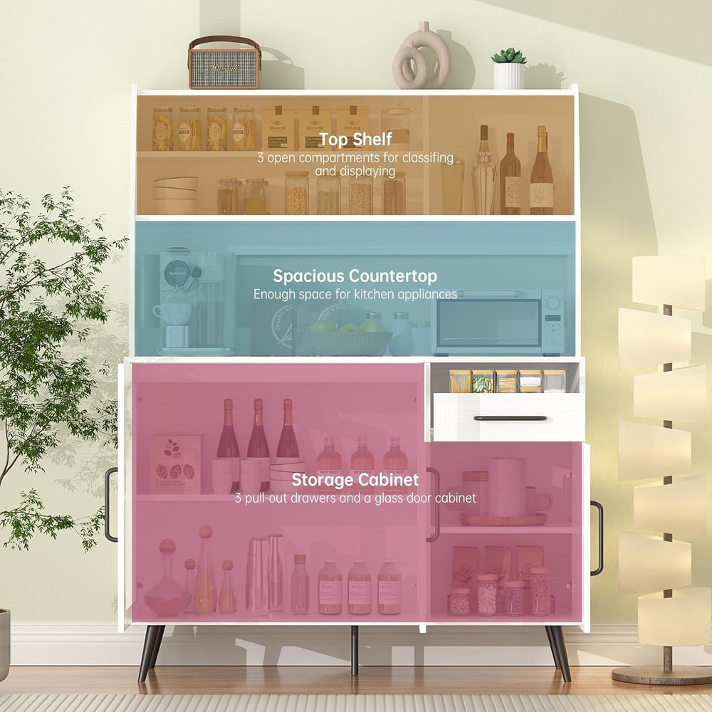 Kitchen Hutch Pantry Cabinet, Freestanding Kitchen Storage Cabinet with 2 Glass Doors, Versatile Storage with Drawer & Shelves, Cupboard for Dinning Room, Living Room Product Description About this item PLENTY OF STORAGE SPACE: The wide countertop provides plenty of room for kitchen utensils, such as a microwave and coffee maker, and the top shelf with 3 open compartments is perfect for sorting and storing bottles, cups, jars, or wine. The drawers can hold a variety of cutlery and jars etc. Keep your knives, forks, spoons, and plates free from dust. MULTIFUNCTIONAL STORAGE CABINET: With its streamlined design and ample storage space, this cabinet will fit well into any decoration themes in your home. It can be widely used as a kitchen pantry, a buffet in the dining room, a storage cabinet in the living room,m or a console in the entryway. STURDY AND DURABLE: High-quality materials and reinforced structure enhance the weight-bearing capacity of the sideboard to ensure durability, with an anti-tipping device for safety and reliability. MODERN DESIGN AND MAINTENANCE: White finish and black stainless steel hardware create a timeless design. To maintain its appearance, simply wipe with a damp cloth and avoid abrasive cleaners. EASY TO ASSEMBLE: Detailed assembly instructions and all parts are included in the package, please check the panels are broken and missing according to the list before installation, if you have encountered any problems, please contact us, and we will help you as soon as possible. Perfect for enhancing your kitchen's functionality while adding a touch of sophistication. Buy it and enjoy a clutter-free space! Upgrade your home organization! Freestanding Kitchen Storage Cabinet with 2 Glass Doors Spacious Countertop: Perfect for placing kitchen appliances, providing a convenient workspace. Open Shelves: The top shelves feature 3 open compartments ideal for organizing bottles, mugs, jars, or liquor. Organized Drawers: Equipped with 4 drawers, including 3 on the right, designed to neatly store your tableware. Keep your knives, forks, spoons, and plates dust-free and easily accessible.
