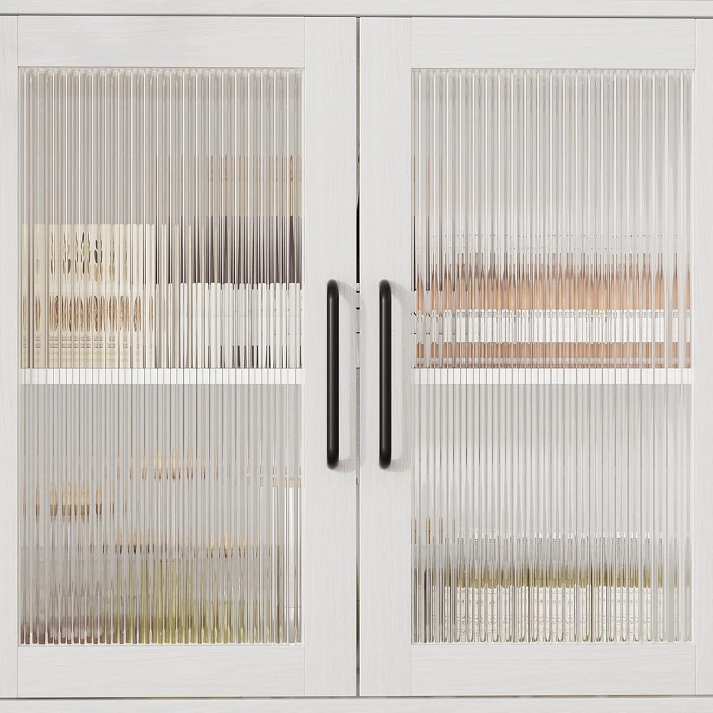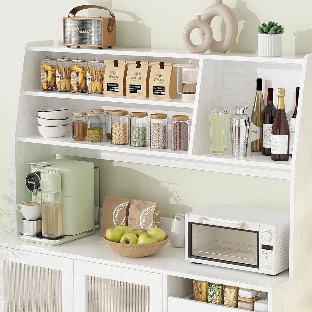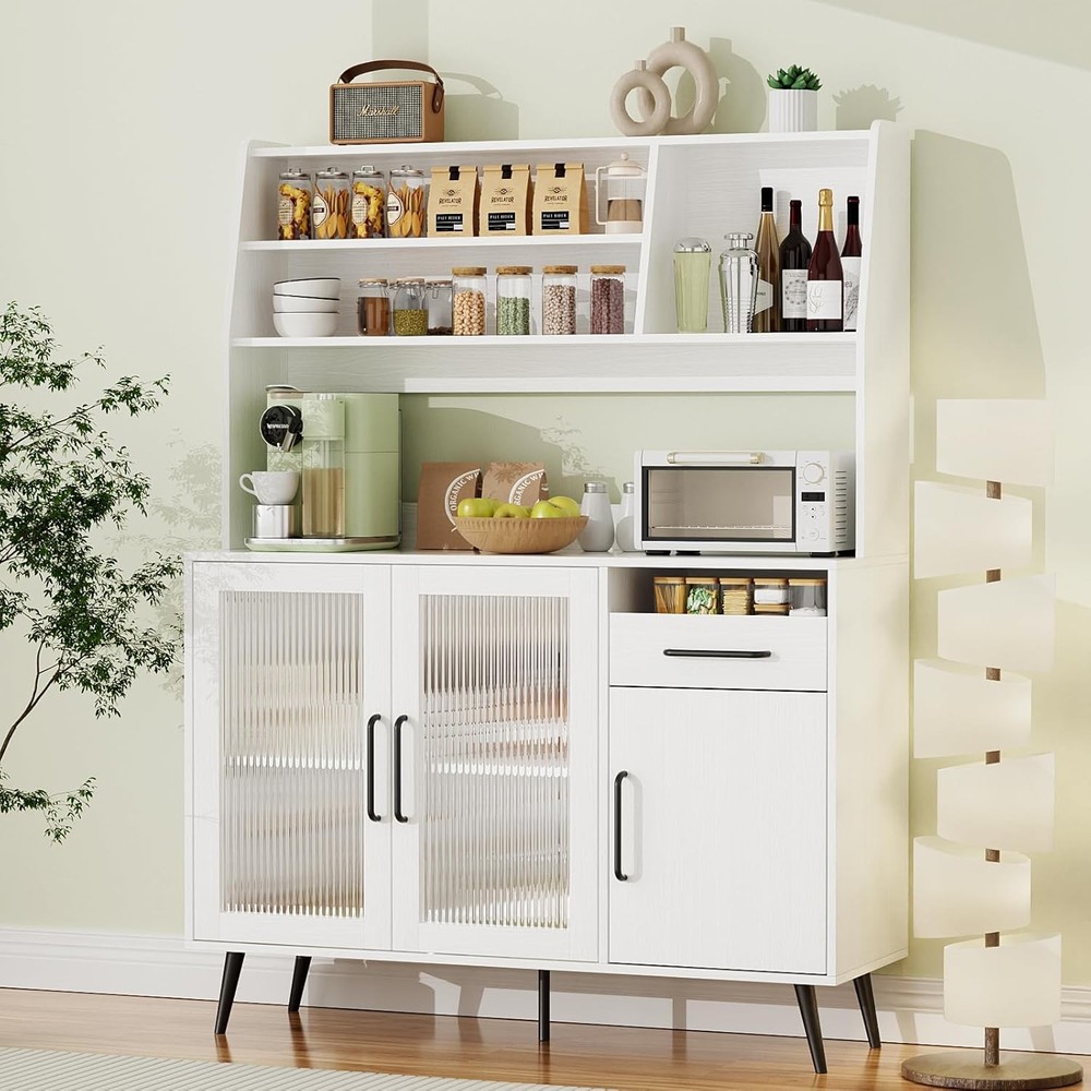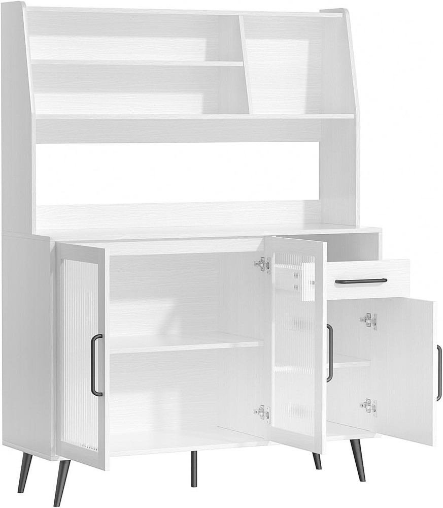 Kitchen Hutch Pantry Cabinet, Freestanding Kitchen Storage Cabinet with 2 Glass Doors, Versatile Storage with Drawer & Shelves, Cupboard for Dinning Room, Living Room Product Description About this item PLENTY OF STORAGE SPACE: The wide countertop provides plenty of room for kitchen utensils, such as a microwave and coffee maker, and the top shelf with 3 open compartments is perfect for sorting and storing bottles, cups, jars, or wine. The drawers can hold a variety of cutlery and jars etc. Keep your knives, forks, spoons, and plates free from dust. MULTIFUNCTIONAL STORAGE CABINET: With its streamlined design and ample storage space, this cabinet will fit well into any decoration themes in your home. It can be widely used as a kitchen pantry, a buffet in the dining room, a storage cabinet in the living room,m or a console in the entryway. STURDY AND DURABLE: High-quality materials and reinforced structure enhance the weight-bearing capacity of the sideboard to ensure durability, with an anti-tipping device for safety and reliability. MODERN DESIGN AND MAINTENANCE: White finish and black stainless steel hardware create a timeless design. To maintain its appearance, simply wipe with a damp cloth and avoid abrasive cleaners. EASY TO ASSEMBLE: Detailed assembly instructions and all parts are included in the package, please check the panels are broken and missing according to the list before installation, if you have encountered any problems, please contact us, and we will help you as soon as possible. Perfect for enhancing your kitchen's functionality while adding a touch of sophistication. Buy it and enjoy a clutter-free space! Upgrade your home organization! Freestanding Kitchen Storage Cabinet with 2 Glass Doors Spacious Countertop: Perfect for placing kitchen appliances, providing a convenient workspace. Open Shelves: The top shelves feature 3 open compartments ideal for organizing bottles, mugs, jars, or liquor. Organized Drawers: Equipped with 4 drawers, including 3 on the right, designed to neatly store your tableware. Keep your knives, forks, spoons, and plates dust-free and easily accessible.