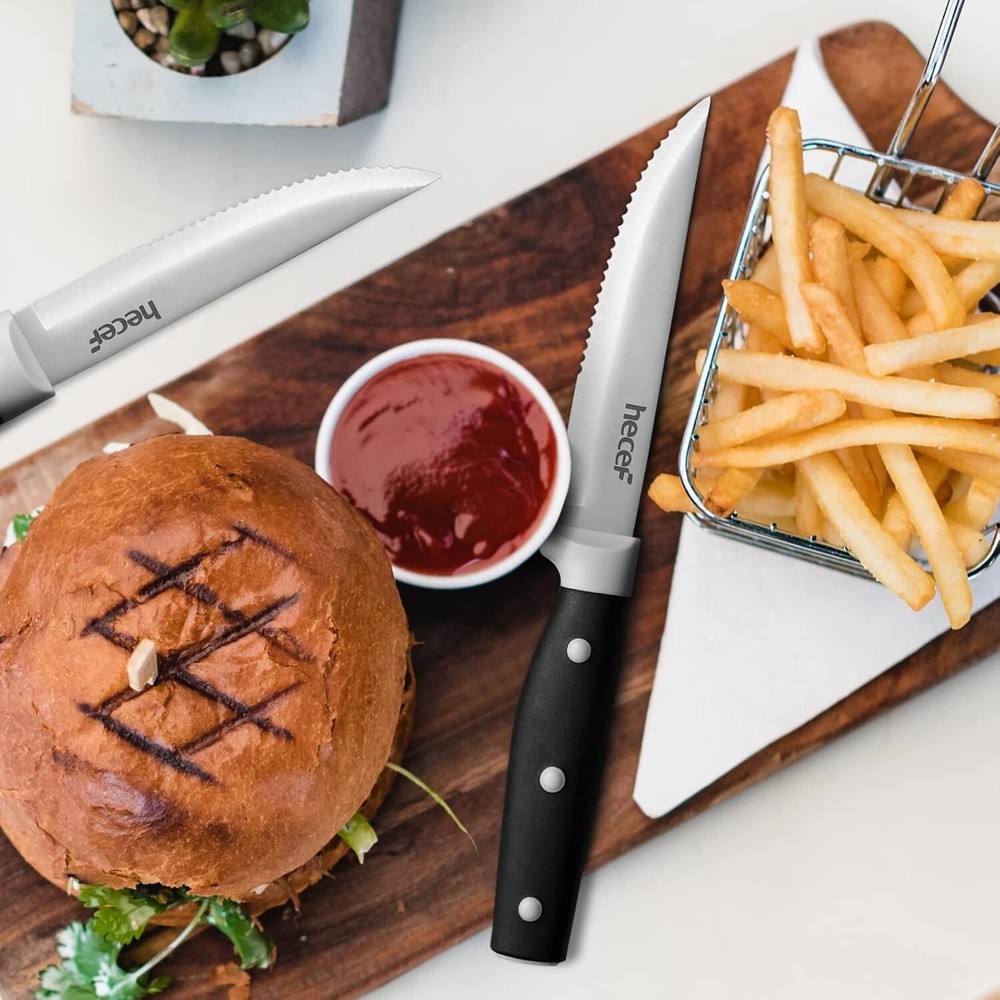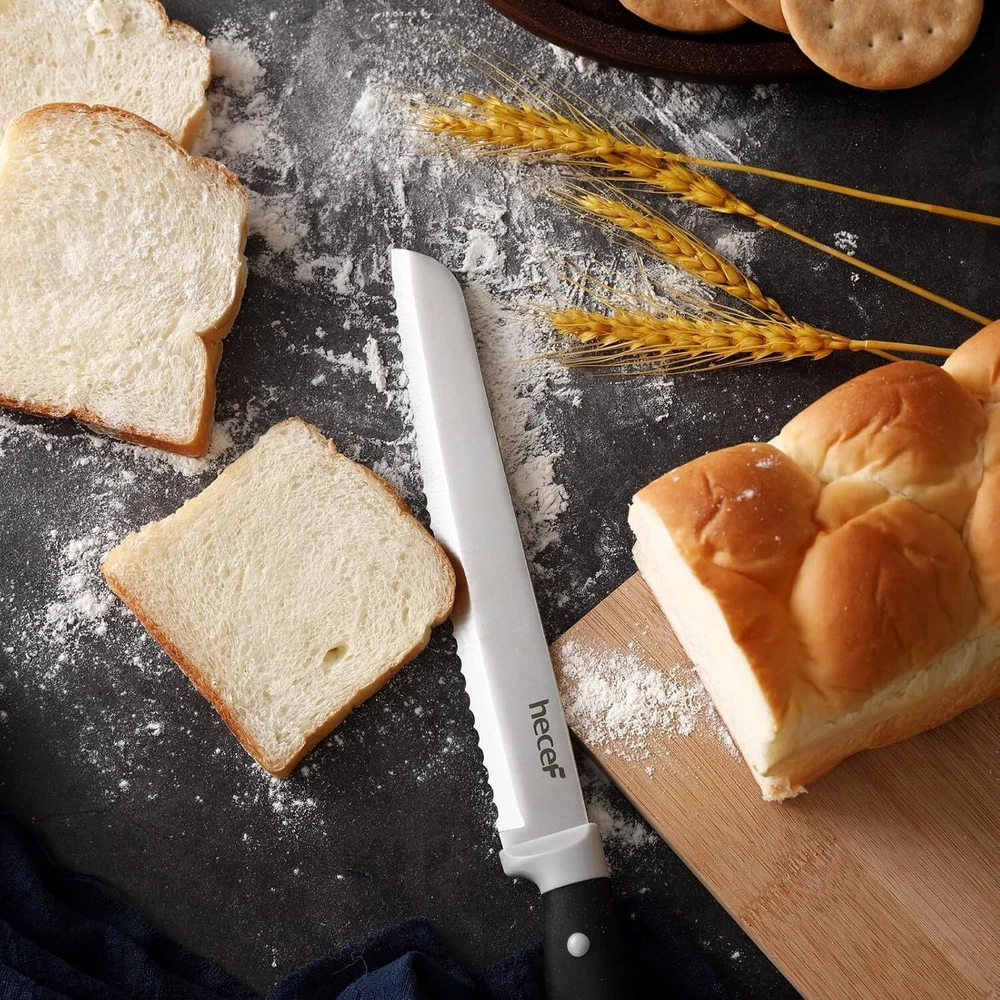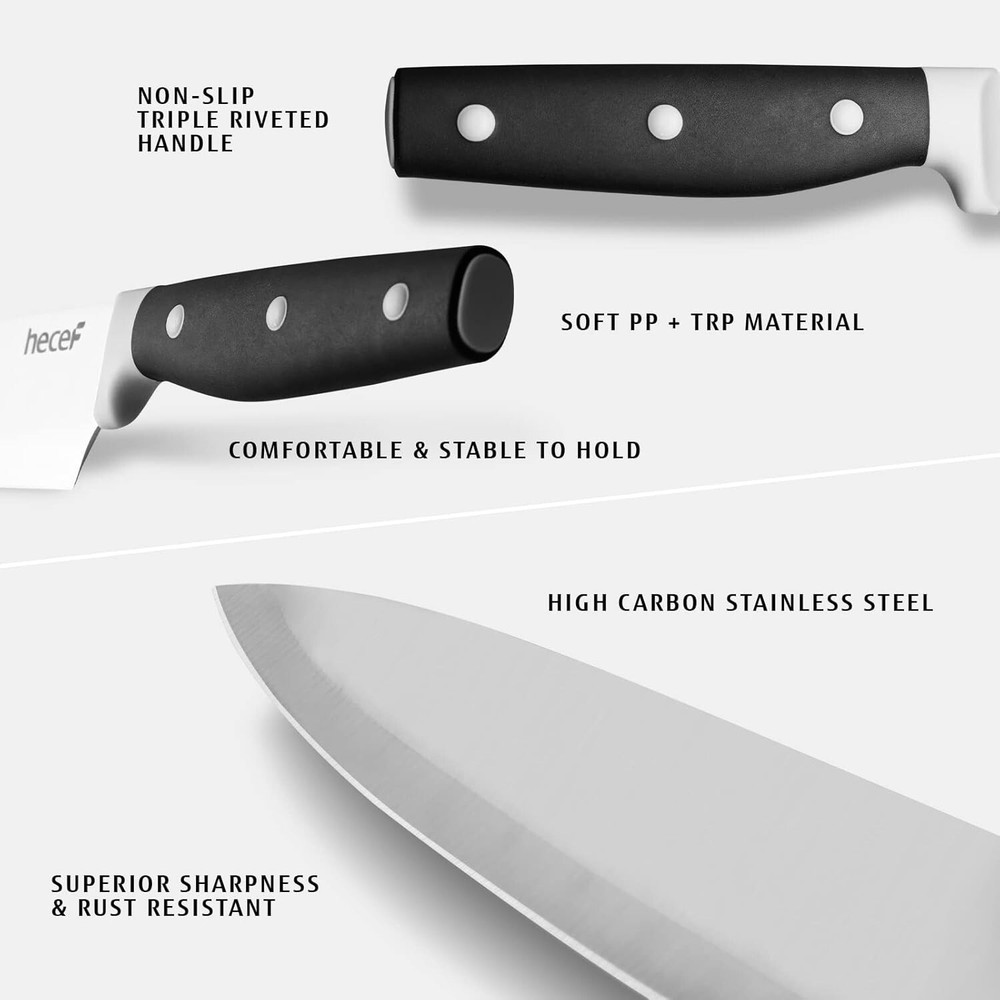 Kitchen Knife Block Set, 14 Pieces Knife Set with Wooden Block & Sharpener Steel & All-purpose Scissors, High Carbon Stainless Steel Cutlery Set (Black) Description: Space-saving Wooden Block: The block is made by pine wood with stylish non-stick black coating, which is odour and stain resistance. A ventilation design was added to the bottom of the knife block, ensuring the water from the blade can be evaporated quickly after cleaning, which strongly protect the blade from being rust and for a long-lasting use. Also, all the knives can be stored in the block, releasing the countertop and saving space for your cooking. Stylish & Ergonomic Handle: Injected with PP+TPR material, this triple riveted handle is sturdy that will never take apart and ensures good kitchen experience. Meanwhile, the color of handles are specially designed to match with our knife block and most of the kitchen. High Carbon Stainless Steel: The knife set is fabricated from quality X30Cr13 stainless steel with a Rockwell hardness of 52±2 for improved corrosion resistance and remarkable durability. Each knife has been precisely constructed to ensure superior grip feeling. Satin Finish: The knife set has been polished with a premium technology that makes it look high-end and more durable to prevent stain attached. After using, please hand wash by water and wipe clean. For longer life, it is recommended not to put in the dishwasher. Decent Choice: This knife set comes with exquisite package. Surprise someone with this delightful kitchen knife set, watching their face light up as they unwrap their unique box. This set can be for New Home, Birthdays, or many other holiday events.