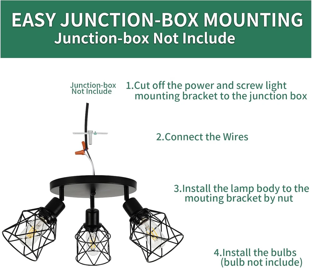 Store New Arrivals Add to Favorite View Feedback Contact Kitchen Light Fixtures Ceiling Mount, Black Ceiling Light Fixtures 3-Light Adjustable Semi Flush Mount Ceiling Light, Multi-Directional Ceiling Lights for Kitchen Hallway Dining Room(E26 Base) Description Item model number QLXDD0028B-3 Light Source Type Incandescent, LED, CFL, Halogen Style Industrial Number of Items 1 Power Source ac Fixture Type Removable Number of Light Sources 1 Control Method App Theme Industrial, Farmhouse Batteries Included? No Lighting Method Downlight Specification Met UL Controller Type Push Button Unit Count 1.0 Count Room Type Kitchen, Living Room, Dining Room Assembly Required Yes Switch Type Push Button Product Dimensions 3.7"L x 3.7"W x 4"H Material Metal Installation Type Flush Mount Model Name Ceiling Light Fixtures Finish Type Brushed Specific Uses For Product Home Indoor/Outdoor Usage Indoor Brightness 800 lumen Country of Origin China Light Color Up to your bulb Water Resistance Level Not Water Resistant Batteries Required? No Item Weight 3.34 pounds Light fixture form Close to Ceiling Special Features Adjustable Special Feature Adjustable Part Number QLXDD0028B-3 Shade Color Black Mounting Type Ceiling Mount Color Black Wattage 60 watts Bulb Base E26 Shape Rectangular with rounded corners Voltage 110 Volts Recommended Uses For Product general room lighting in indoor living spaces Shade Material Metal Finish types Brushed Included Components Shade Size 3-Light-Cage ✅【Farmhouse Light Fixtures Ceiling Mount】This 3 lights farmhouse flush mount light fixture features a solid black canopy and metal unique cage shade, which embodies the charming charm of retro and modern. The flush mount industrial light fixture can rotate 350 degrees and adjust the different shapes of black kitchen ceiling light fixture for your home decoration style. It perfectly combines classic and modern styles. ✅【High Quality & Dimension】This light fixtures ceiling mount is made of sturdy material, not easy to crack, solid and enduring to bear long-time usage! The ceiling light for hallway with anti-oxidant, non-fading. The top plate diameter: 9.84 inch; Height: 10.76 inch; Wide: 21.96. Flush mount ceiling light fixture with clear guidance and installation video easy to install. ✅【UL Listed & E26 Standard Light Socket】The flush mount ceiling light comply with UL standard for safety to use. The kitchen light fixtures is compatible with E26 base bulb (Bulb NOT INCLUDED, Max 60W), such as incandescent, LED, CFL and halogen bulbs. This hallway light fixtures ceiling also compatible with dimmer bulbs and dimmer switch (not included). ✅【Wide Application】This farmhouse light fixtures ceiling uses rustic style design. The elegant semi flush mount ceiling light can be used as kitchen ceiling lights fixtures, farmhouse light fixtures, dining room light fixture. The black flush mount light fixtures with an open geometric cage design that allows the light to reach the entire area and exude a comforting country glow. ✅【Outstanding Service】 We promise 100% return and policy, if you have any question about the flush mount ceiling light, please let us know by E-mail, we will work with you to resolve the issue within 24 hours online. Product Description WILON Multi-Directional Semi Flush Mount Ceiling Light Fixture Our semi flush mount ceiling light is uniquely shaped in black with a modern design to provide bright lighting for your family. The 3 light flush mount ceiling light will be an antique lighting decoration for your household, such as the kitchen, bedroom, living room, dining room, entryway, etc. Black Ceiling Light Fixtures 3-Light Adjustable Semi Flush Mount Ceiling Light The video showcases the product in use. The video guides you through product setup. The video compares multiple products. The video shows the product being unpacked. If you have any questions about the track lighting fixtures, please let us know anytime via 's message box, we will reply within 24 hours. You can adjust any lighting direction you want. 350 Degrees Adjustable Light Fixture Modern Design Black Ceiling Light 100% Super Quality and Very Easy Installation The hallway light fixtures ceiling are simple and elegant, with a wide range of lighting 1 FOR KITCHEN ISLAND 2 FOR LIVING ROOM 3 FOR BEDROOM 4 FOR DINING ROOM 5 FOR HALLWAY WILON Light Fixtures for Bedroom Living Room Kitchen Farmhouse Hallway Details of kitchen light fixtures Size: 12.4*12.4*10.76 inch Color: Matte Black Voltage: 110-130V; Frequency: 60W MAX. Light bulb: 3 * E26 (NOT including light bulb) Compatible with E26 Base 60W Max. Bulbs Compatible with incandescent, LED, CFL, and halogen bulbs (Not Included, each bulb's maximum wattage is 60W). Also, a dimmable is available when the semi-flush mount ceiling light fixtrues has a compatible dimmer switch (No Included). ABOUT US We offer the best prices around on high quality products. Our E-store includes media such as books, movies, music and games while offering electronics, toys, sporting apparel, clothing, tools, general home, garden items and more. SHIPPING We are always working hard to ensure your package arrives as soon as possible. Please understand that some factors like weather, high postal traffic, and the performance of shipping companies are outside of our control. We offer free shipping to the lower 48 states and ship within 2 business days of payment, usually sooner. We do not accept P.O. Boxes. Please provide a physical address. For shipping outside of the continental USA, we only use eBay's Global Shipping Program.The item is shipped to KY and then sent to the rest of the world. International customers are responsible for all duties and taxes. Continue to check out in order to calculate costs for shipping the item to your country. Messages regarding eBay's Global Shipping Program MUST be directed at eBay EXCLUSIVELY. RETURNS We offer a 30-Day Return Policy on items which you are not completely satisfie