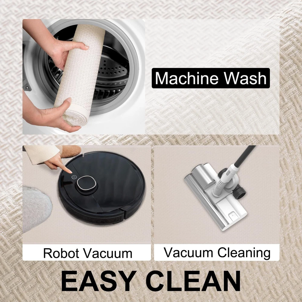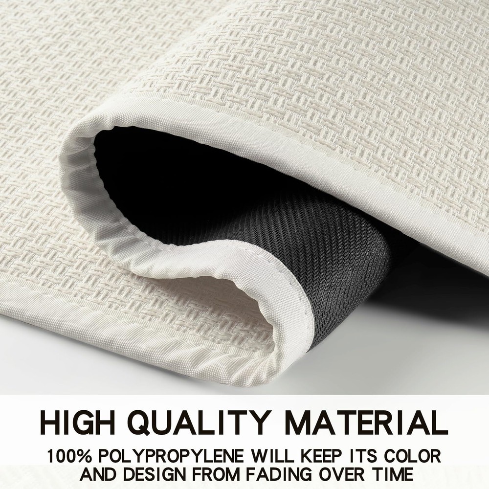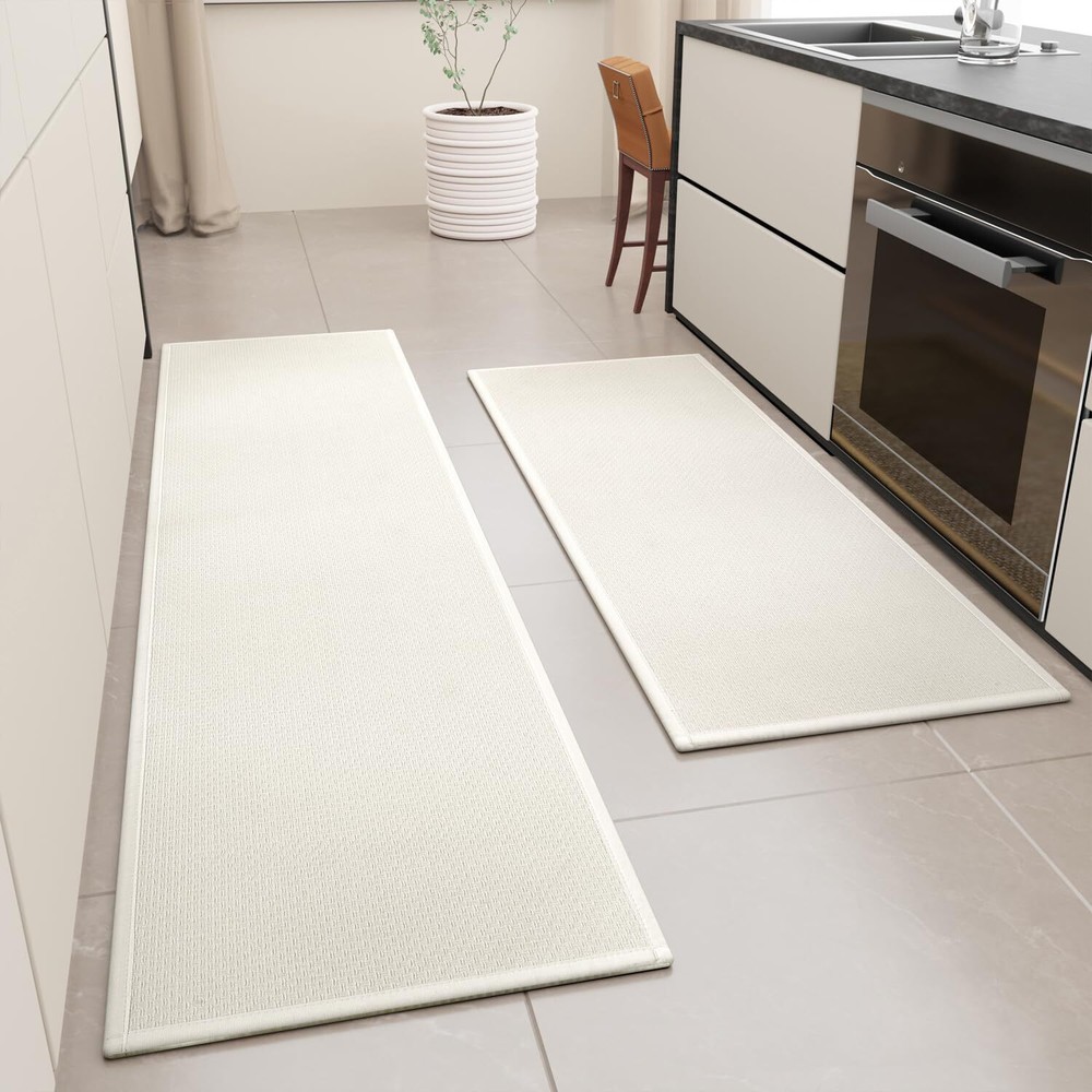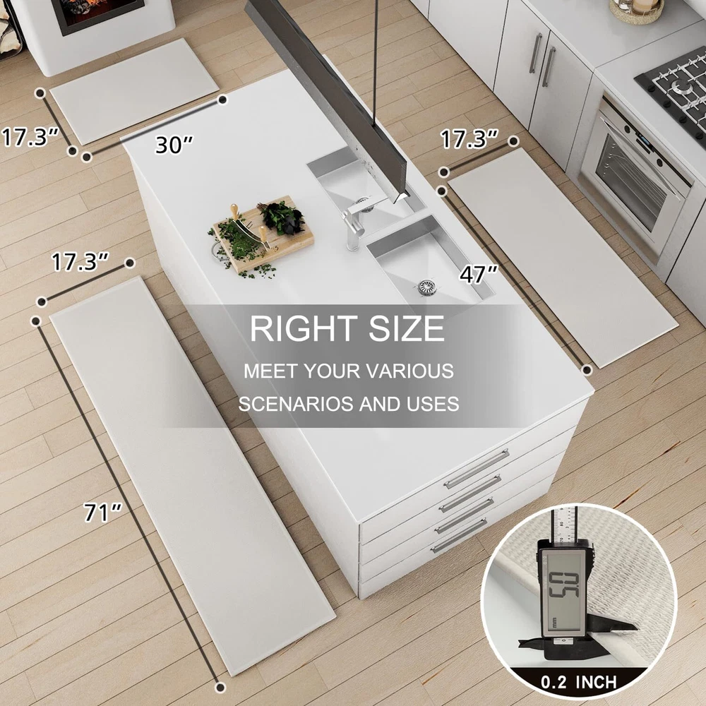 NON-SLIP KITCHEN MAT: The Back Is Made of Rubber, Increase Resistance And Anti-Slip, The Grip Effect Keeps You Standing Firmly In The Kitchen Mat Without Sliding. Provides Safety For Your Family. It Works Well On Hardwood Floors,Tile,Linoleum And Other Slick Surfaces, You Can Feel Safe To Use. HIGH-QUALITY AND DURABLE: As a Rug Used In High Traffic Cooking Areas, They Will Protect Your Flooring From Scratches, Scuffs, and Spills, Also the Cushioned Rug Protctect The Floor From The Dropping Sharp Tableware or Fragile Bowls. The Soft Surface of The Kitchen Mat Will Be The Best Protective Layer. PROTECT YOUR FLOOR: Kitchen Mats Are Made of 100% Polyester with Super Absorbent Surface & Stain-Resistant, Which Solve The Oily And Dirty Water Stains Caused During The Cooking Process, Protect The Floor From Oil, Dampness, Sauces Or Food Particles.Rug And Mat Suitable For Kitchen. EASY TO CLEAN AND MAINTAIN: Vacuum Cleaners, Robot Cleaners And Washing Machines Are Friendly To It. The Mat Will Not Be Damaged or Deformed During the Machine Washing Process, A Clean Rug For Kitchen Can Be Obtained Without Taking a Long Time, Premium Material Can Be Repeatedly Cleaned And Durable. Attention: After cleaning, please air dry naturally and do not use a dryer! MULTI-PURPOSE: The Kitchen Rug Measures 17.3 "X47"+17.3 "X30" 2-Piece Set And is Widely Used For Home Decor, Farmhouses, Interior Front Doors, Porches, Living Rooms, Hallways And Any Space With Heavy Traffic. The Surface Has a Sturdy Woven Structure So You Don'T Have To Worry About Your Pet Scratching It, And The Padded Back Relieves Foot Fatigue.