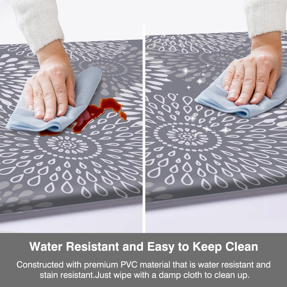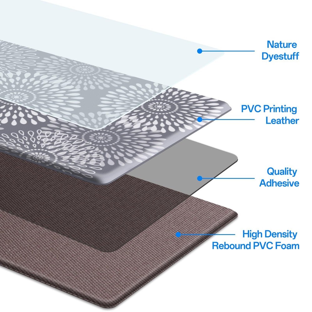 Anti Fatigue Kitchen Mats for Floor:kitchen rugs help provide a comfortable space,provides support to help relieve pressure on your feet;the floor mat non slip washable also has a slow-rebound feature to protect dishes from breaking if dropped while you are cleaning or cooking Kitchen Accessories:This kitchen mat keeps the kitchen clean very well;It is constructed with premium PVC material that is water resistant and stain resistant;kitchen mat is designed to be a kitchen helper saving your time and energy,just wipe with a damp cloth to clean up Versatility:The classic pattern and color compliment any kitchen decor;The blend of function and fashion make the foam mats perfect for home or commercial use;The PVC foam kitchen floor mat may be used on multiple surfaces (tile, wood, ceramic, marble, etc) Non-slip Backing:'s kitchen mats and rugs typically consists of a textured or patterned surface on the underside that effectively adheres to various flooring types,ensuring safety and stability (WARNING: Please place the kitchen rugs on DRY FLAT SURFACES.) Premium Material:Kitchen rugs sets of 2 are made from high-quality,premium PVC materials that is scratch and fade resistant and withstand heavy traffic, ensuring long-lasting performance while being friendly on the environment