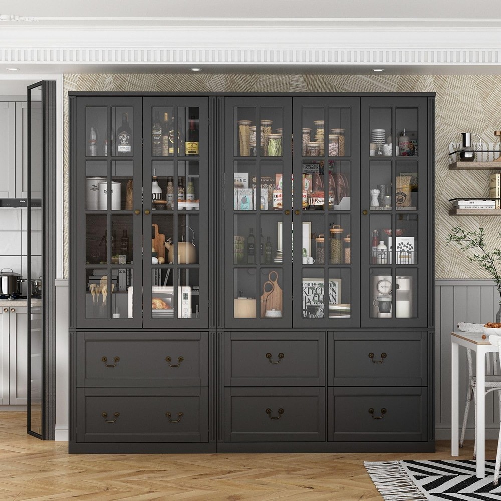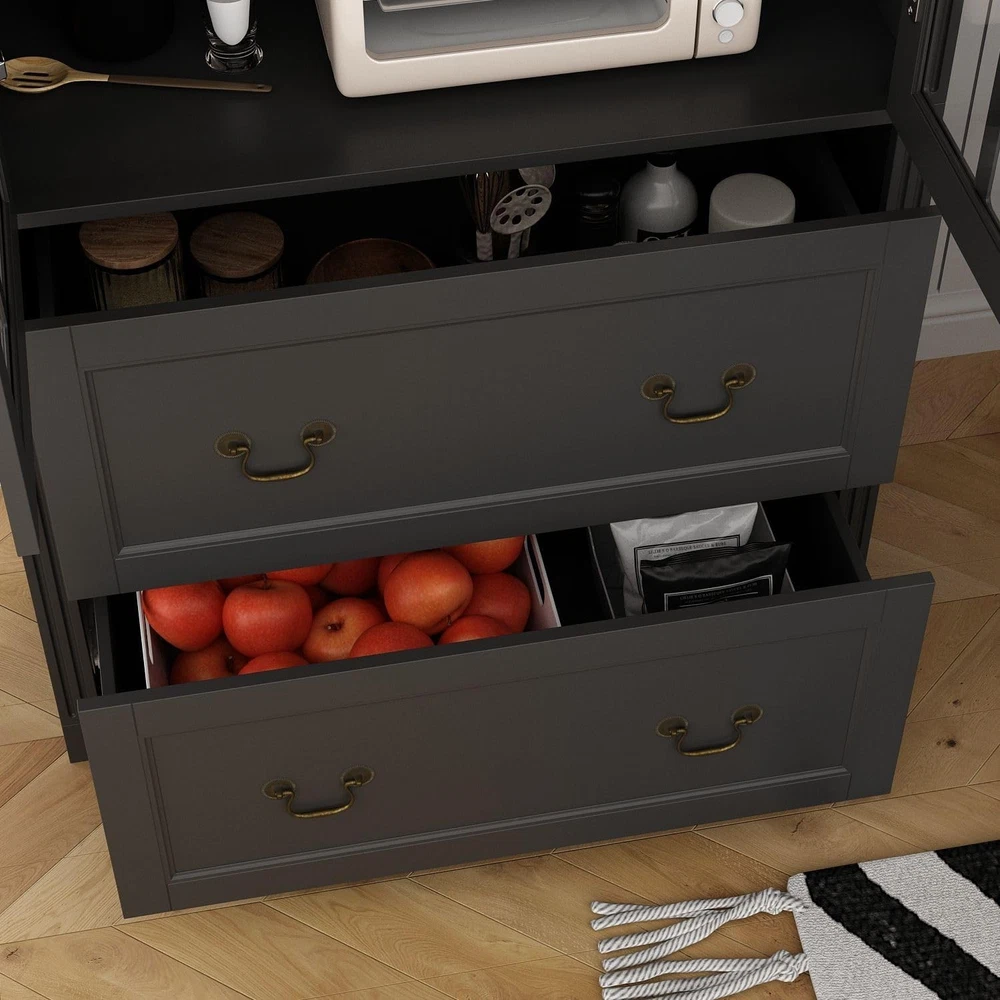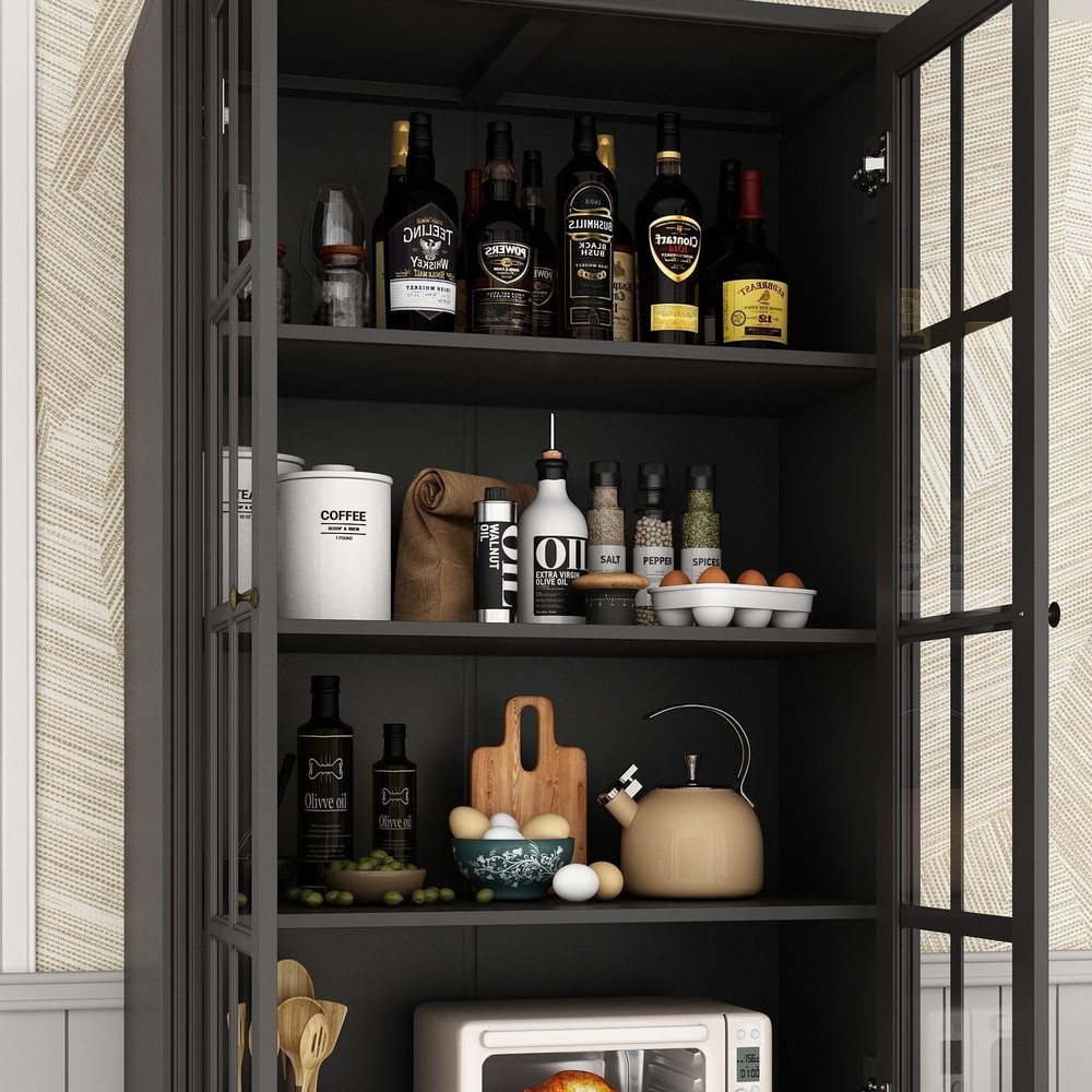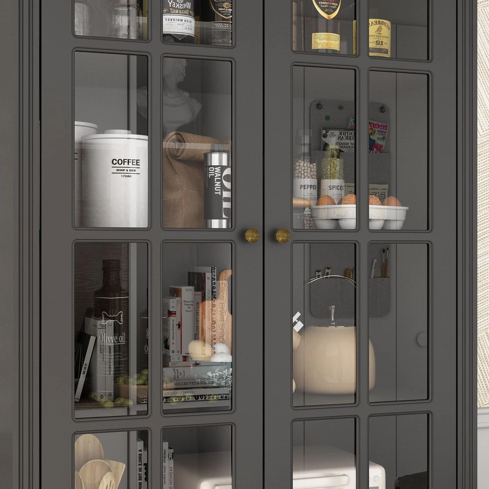 Absolutely love this chic cabinet! The cross-design glass doors and distressed handles give it such elegant charm while fitting perfectly in my kitchen. It holds so much with four spacious shelves and two deep drawers—finally organized all my pantry items!