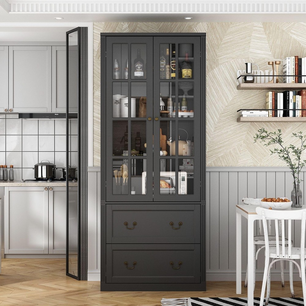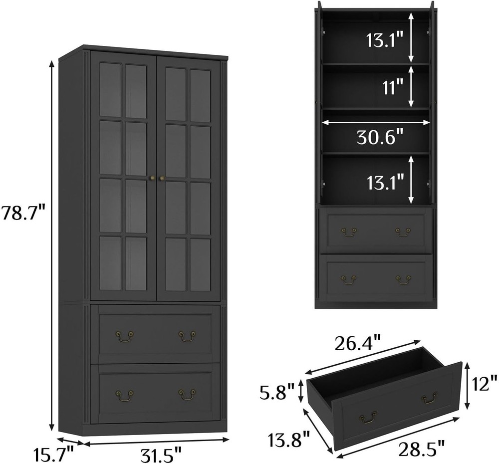 Product Description About this item • Fashion & Chic - The cross design on the doors and distressed handles for the drawers bring classic and elegance, compact construction and sleek steam-lined design makes it really modern and attractive.This pantry cabinet would suit most of your home themes and can be placed in your living room, kitchen, hallway, entryway and so on. • Ample Storage - The kitchen storage cabinet features 4 tier storage shelves and 2 spacious drawers. Each drawer is 13.8 inch depth and will be enough for storage organization. The laminates for shelves are adjustable to fit your items well. • Stable & Durable - This pantry cabinet is made of quality MDF board, the painted surface is really polish, wear-resistant and easy to clean. The tempered glass doors with hinges are really sturdy and protect your items away from ash and dirt. Equipped with anti-dumping device, preventing your family from collapsing. • 2-Person Assembly - To make sure the stability, this item is divided into a large number of pieces. Please follow the instructions step by step with all your caution. Every piece is labeled and all hardwares are included with instructions. Overall Dimension: 31.5”(W) x 15.7”(D) x 78.7”(H). Please check the size image from the description if you’d like to know the size of inner space. • Before Assembly - Before diving into assembly, make sure to check the hardware/screws/boards list from the instruction. Please follow the instructions step by step and assemble the item gently in case there will be damage due to the violent installation. Pantry Cabinet with 2 Drawers & Glass Doors, Kitchen Storage Cabinet with Adjustable Shelves, Pantry Storage Black 15.7"D x 31.5”W x 78.7”H On Aug 13, 2025 at 20:28:24 PDT, seller added the following information: