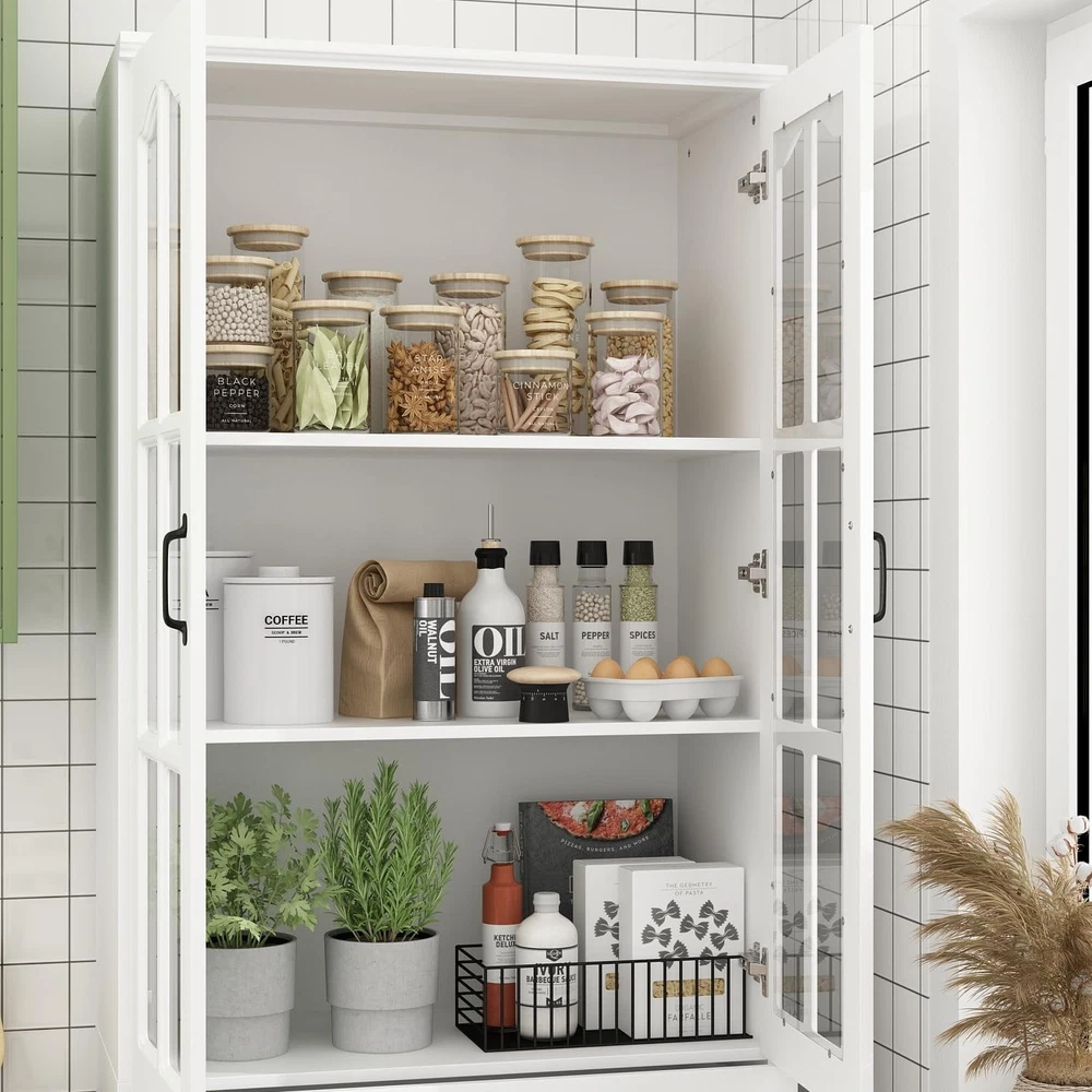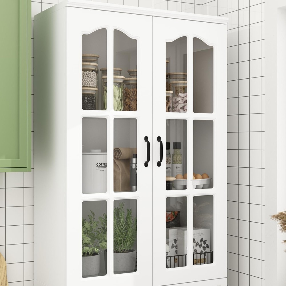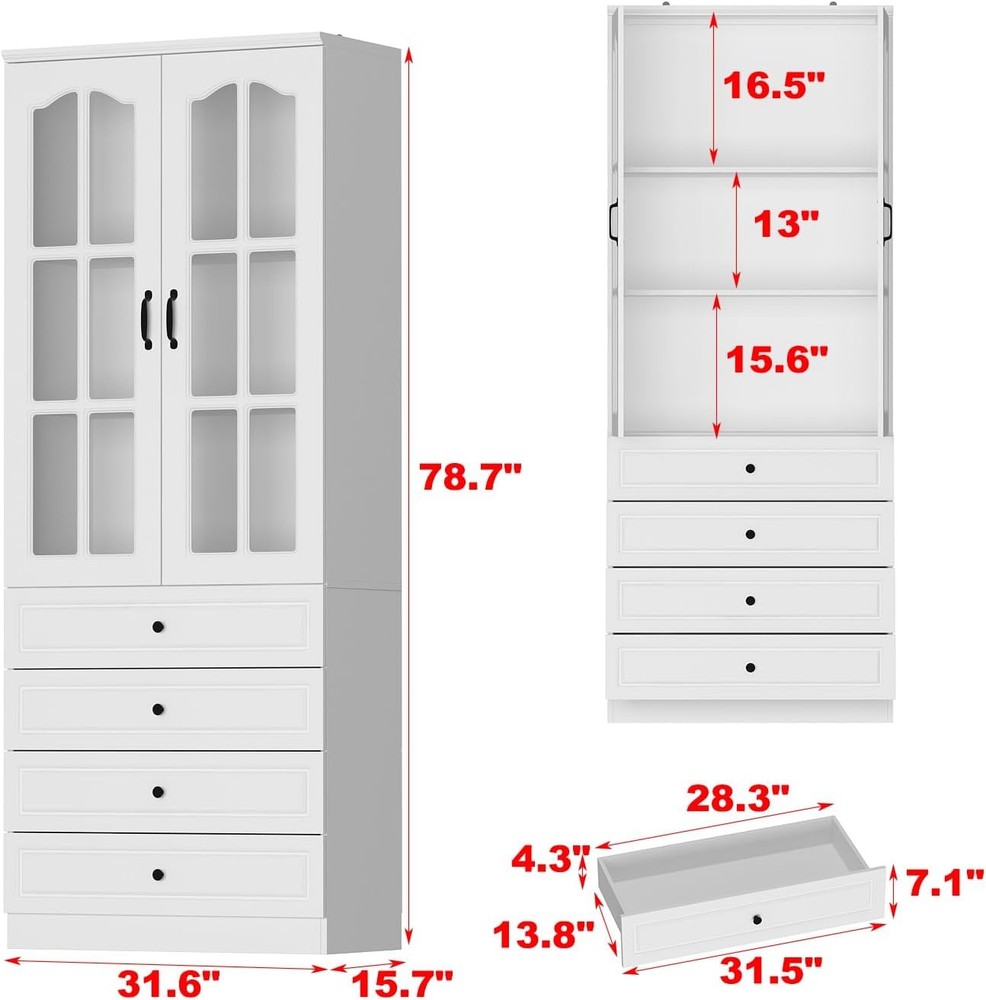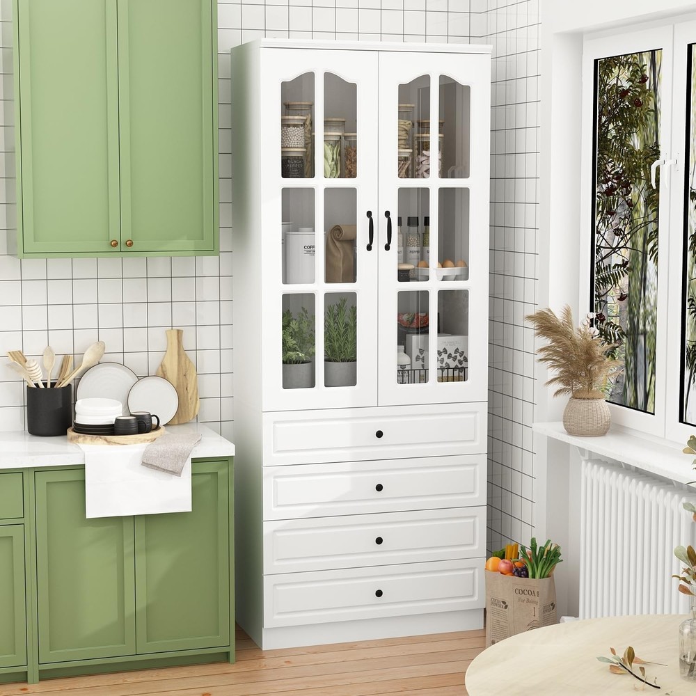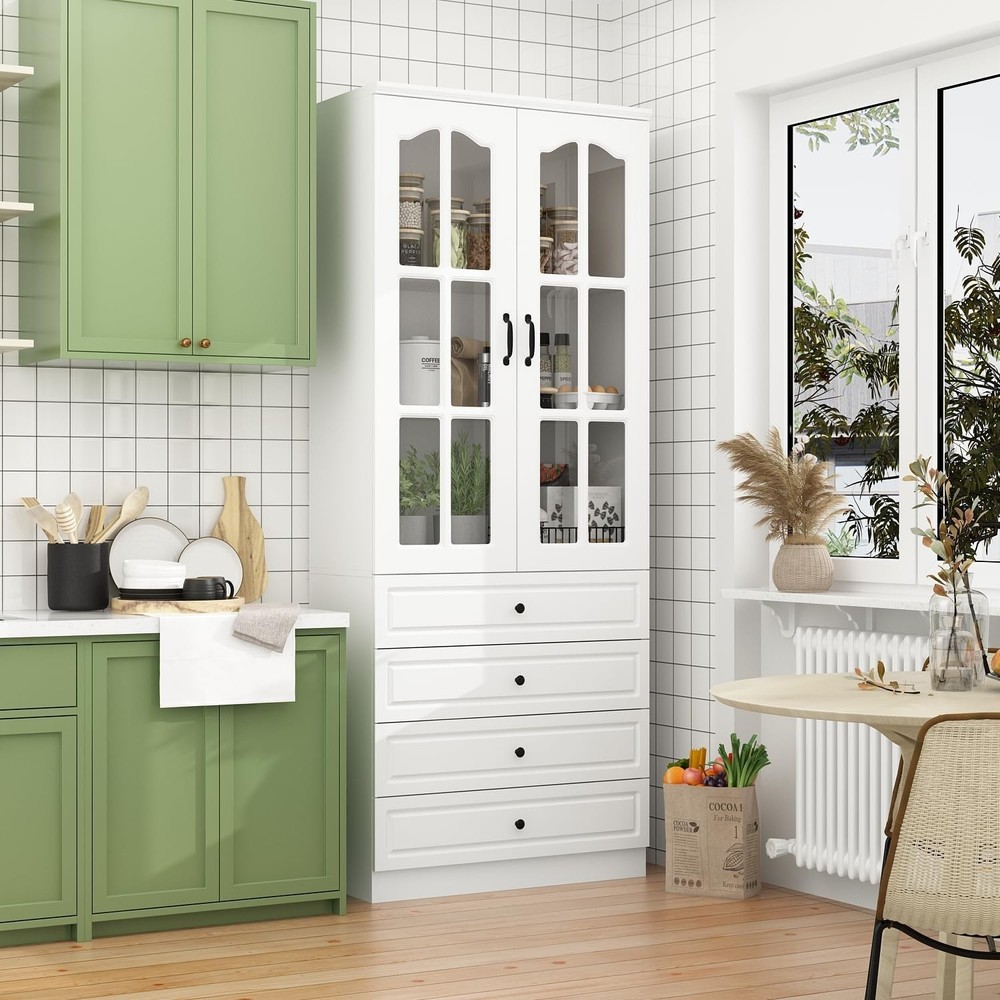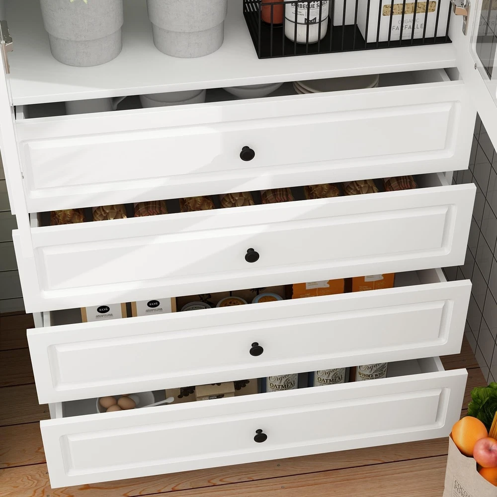 Product Description About this item • Modern Design - This white storage cabinet is in modern style. It features rectangular borders on the front of the drawers. And the glass doors are designed in the shape of arches. And matching with matte black handles, the whole cabinet looks elegant and chic. • Storage Space - The pantry cabinet possesses ample storage space. It has 4 spacious drawers (13.8”D x 28.3”W x 4.3”H) that is suitable to store dishes and some tools like scissors. And the cabinets with 2 glass doors has 3-tier shelves to store food and condiments. • Multi-Use Cabinet - This modern pantry cabinet boasts both practical function and decorative and display functions. It features arch shape glass doors looks nice and can display the decorations stored in the cabinet. The glass doors also make it easier for you to find things. It will fit in your kitchen, living room and hallway. • Sturdy Structure - The kitchen storage cabinet is mainly made of quality MDF and glass. And with sturdy bottom and anti-tipping device, this cabinets is very stable and safe to use. It’s also easy to clean. You can wipe with a damp cloth to clean it. • Assembly Tips - The pantry cabinet includes installation manual and necessary accessories in the package. Please make sure that all parts have been received and are in good condition before your assembly process. Kitchen Pantry Cabinet with 2 Glass Doors and 4 Drawers, Modern Pantry Storage Cabinet with Shelves with Black Handles, for Living Room White 15.7”D x 31.5”W x 78.7”H On Aug 13, 2025 at 20:25:55 PDT, seller added the following information: