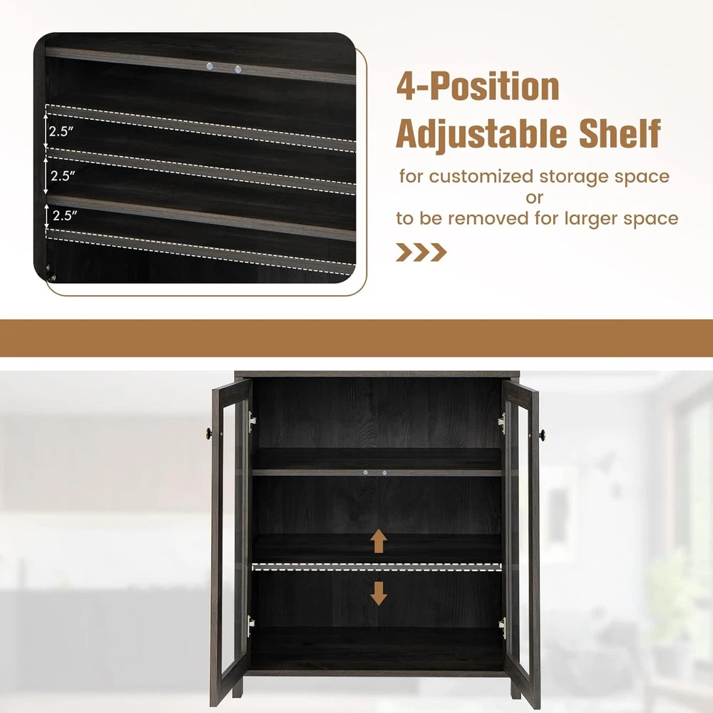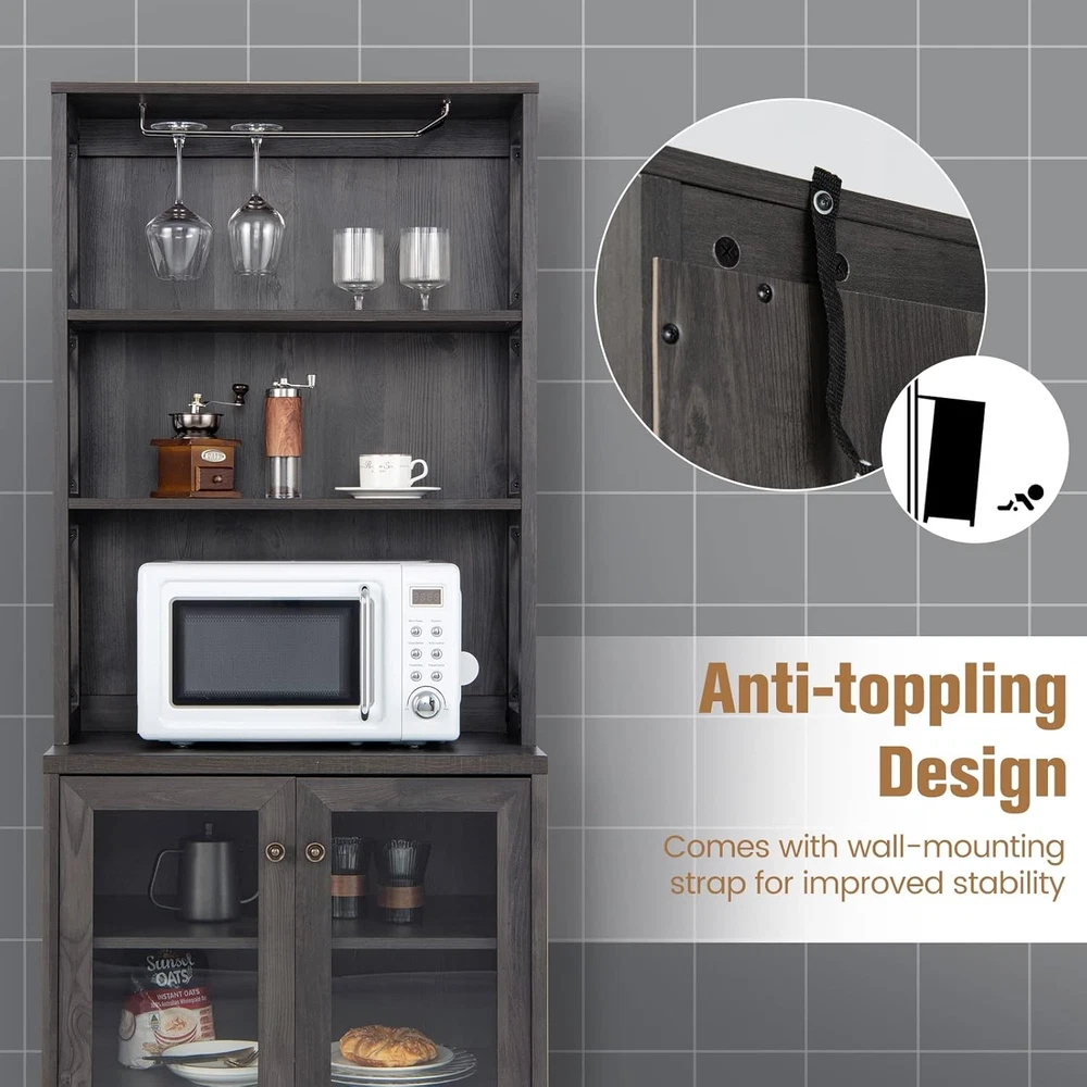 Product Description About this item [Organization You Need to Handle the Day]: Look at this kitchen storage cabinet! The 2 open shelves, the spacious countertop and the cabinet with 3 tier shelves inside, all of which can save you from the mess after preparing a meal for your family. As the kitchen hutch greatly expands the storage space, you can say goodbye to clutters! [Details that Do Matter]: If you are comparing cabinet with others, it’s time to focus on the details! Nowhere to hold the fragile glasses? Hang them on the stemware rack at the top! What about the power cord of the microwave oven? There’s a cable hole to help you handle it! Moreover, the second shelf in the cabinet can be adjusted to 4 positions. And then... [Relax! It’s Tall Yet Stable]: Not like those wobbly tall cabinets with potential safety hazard. The pantry cabinet comes with an anti-toppling device--a kit of strap and expansion bolts to help you anchor the buffet cabinet to the wall. And there are foot pads at the base to serve as floor protector. [A Matching Style Also Matters]: if you don’t want to give your kitchen a makeover. The rustic wood grain, understated color and cross pattern decorations make the buffet with hutch a very presence of the farmhouse style, and somehow it just goes well with different decorations. Thus, feel free to add this buffet sideboard to your kitchen, dining room and living room! [Quality We Care]: The kitchen hutch storage cabinet is made of premium engineered wood and transparent tempered glass, thus to serve you for long without doubt. What’s also worth mentioning is that the anti-collision rubber pads fitted on the interior shelf reduce the “clang” sound and the damage to the glass of each closing. On Aug 14, 2025 at 20:26:15 PDT, seller added the following information: