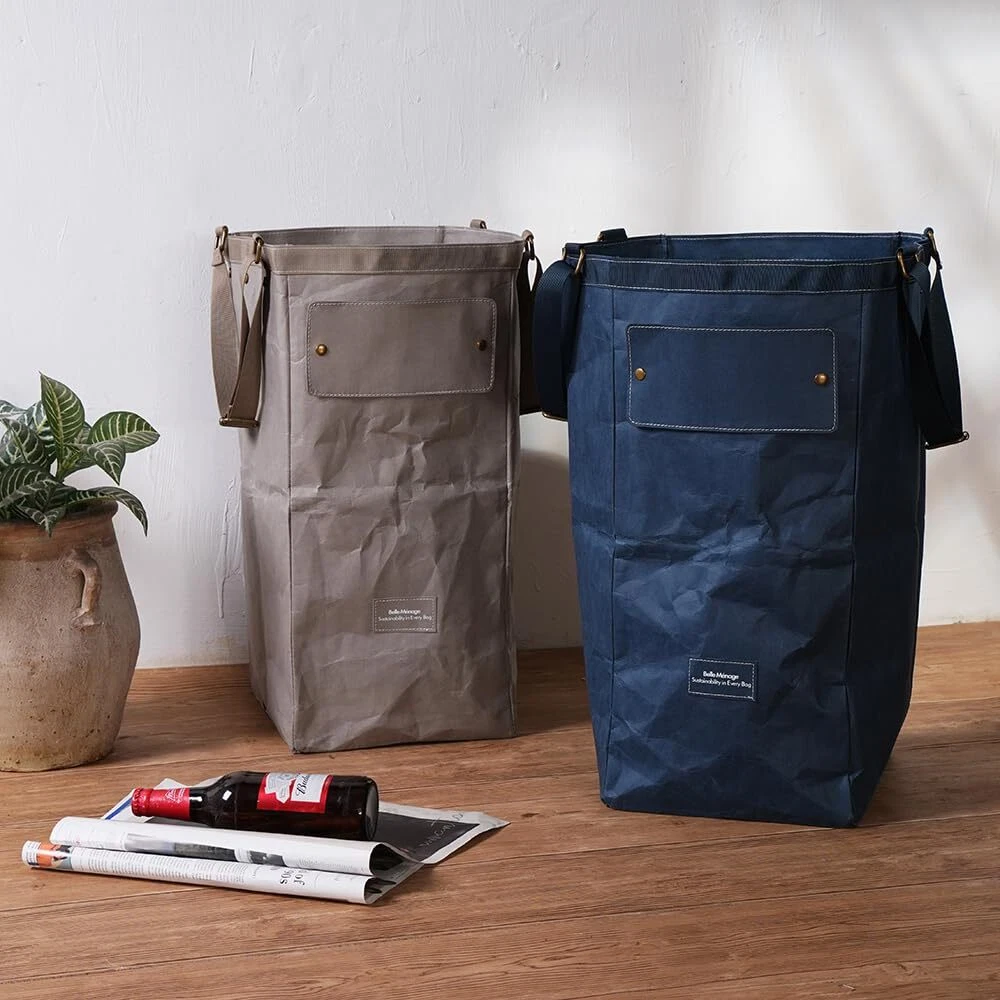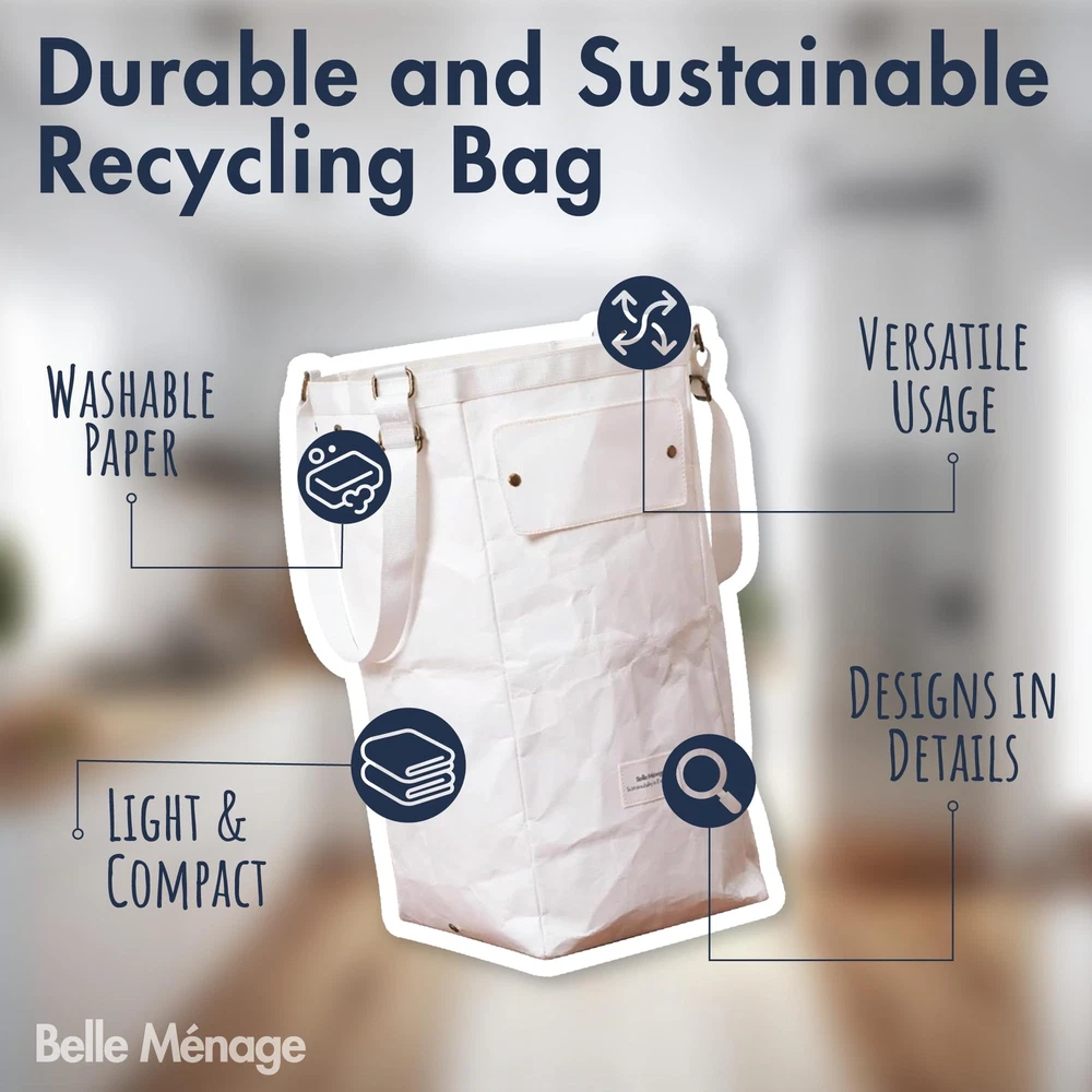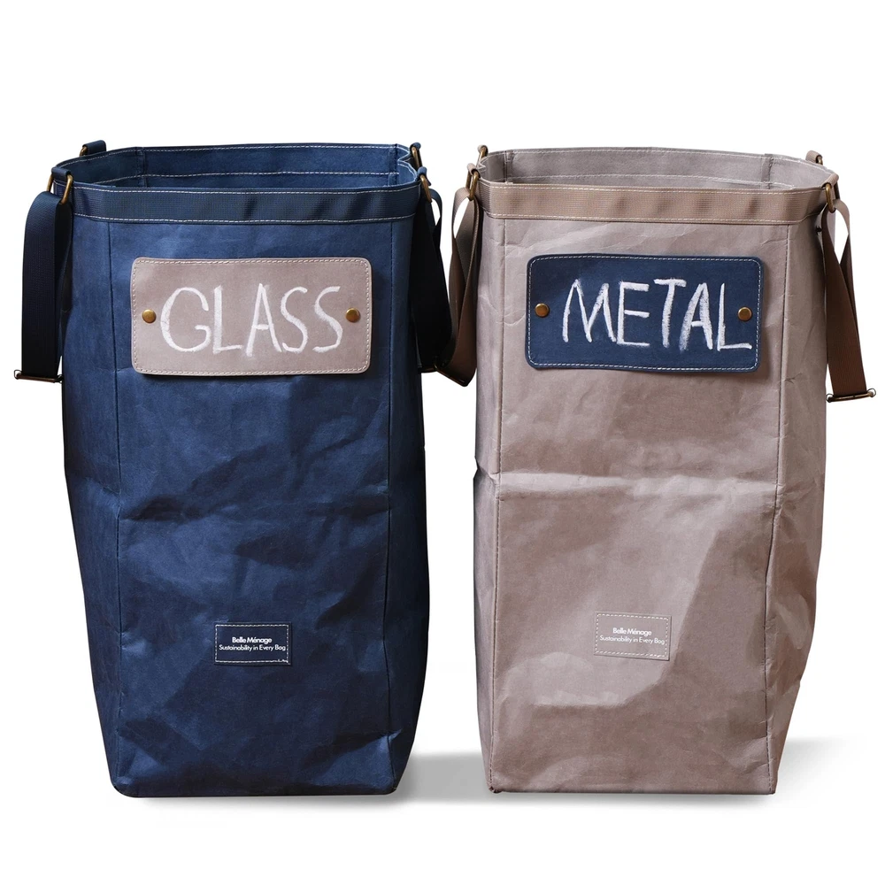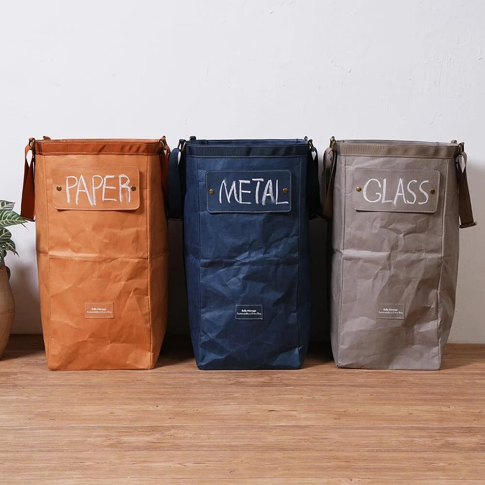 Washable Paper: Also known as vegan leather, washable paper is made from wood pulp & resins and is biodegradable. The production involves fewer harsh chemicals compared to traditional leather or synthetic materials. Versatile Usage: By blending sustainability and aesthetics, our paper bags transcend their role as mere storage solutions and become versatile, practical additions to your home. They serve kitchen garbage and recycling bin combo, indoor recycling bags, toy storage for kids’ room, adapting to your changing needs. Light & Compact: Effortlessly compact, when not in use, our recycling bin can be folded and stored away flatly, taking minimal space. Designs in Details: Our recycle bins come with adjustable handles allow you to easily carry the bag on your shoulder. Additionally, each bag comes with a convenient label and chalk, inviting you to personalize and make notes as you see fit. Furthermore, the rim of the bag is reinforced with matching fabrics to make them more durable. How to Clean: Wipe the bag with wet towels or gently cleanse it with warm water and mild soap or detergent. Dry it with a towel or hang it upside down to let the small laundry basket dry naturally. Please avoid machine washing.