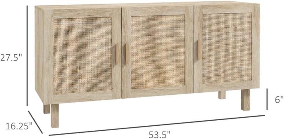 Product Description About this item Specification: - Color: Natural - Materials: Particleboard - Overall Dimensions: 53.5" L x 16.25" W x 27.5" H - Door Size: 17.75" W x 21.75" H - Shelf Height (middle): 9.8" - Weight Capacity: 66 lbs. (Overall), 11 lbs. (Each shelf) Unique woven rattan wicker doors with natural finish for a Boho look, Adjustable shelves allow you to store larger items 2-tiers give you lots of space to store accessories, utensils, dry goods, plates, linens, or books Anti-tipping strap on the back you can secure to the wall for safety, Can be placed in your kitchen, living room, dining room, or office for added storage space Easy Assembly, Elevated base so it's easy to clean under and items stay dry if there's a spill Features: - Unique woven rattan wicker doors with natural finish for a Boho look - 2-tiers give you lots of space to store accessories, utensils, dry goods, plates, linens, or books - Adjustable shelves allow you to store larger items - Anti-tipping strap on the back you can secure to the wall for safety - Can be placed in your kitchen, living room, dining room, or office for added storage space - Elevated base so it's easy to clean under and items stay dry if there's a spill - Assembly required Specification: - Color: Natural - Materials: Particleboard - Overall Dimensions: 53.5" L x 16.25" W x 27.5" H - Door Size: 17.75" W x 21.75" H - Shelf Height (middle): 9.8" - Weight Capacity: 66 lbs. (Overall), 11 lbs. (Each shelf) Package Includes: 1 x Storage Cabinet 1 x Manual On Aug 17, 2025 at 19:26:51 PDT, seller added the following information: