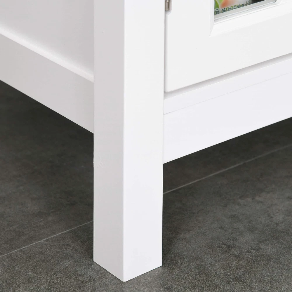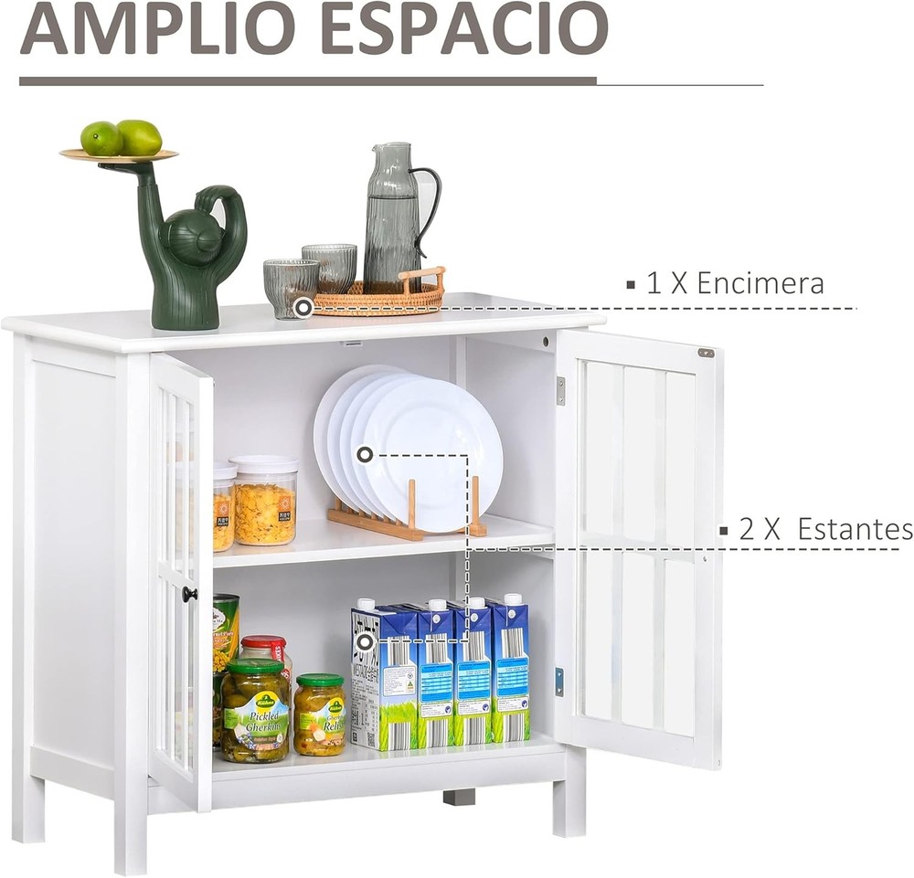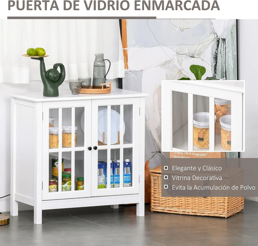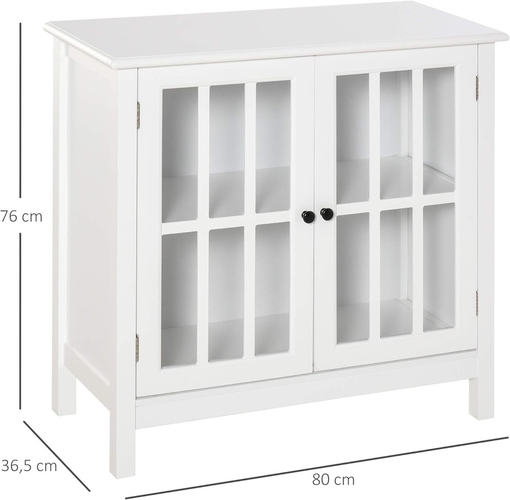 Product Description Add storage space to your home without sacrificing elegance and harmony. This HOMCOM sideboard features a beautiful design with framed glass doors and white MDF frame that will easily match the rest of your furniture and decoration. It features a spacious countertop and a large divided interior space with a central shelf. Ideal for use as an auxiliary cabinet, console for your TV or as a sideboard for the kitchen or home entrance. Features: - Multifunctional furniture that offers extra storage space in any corner of your home - Its design makes it ideal as auxiliary furniture in the dining room, kitchen, living room or other small spaces that need extra storage - For use as buffet, storage cabinet or TV console - Framed glass doors allow you to visualize your interior while protecting dishes or various items from dust accumulation - Framing doors simulating a window frame, adds elegance and modernity to the whole - Made of MDF made of wood and glass, it is a sturdy and easy to maintain furniture - Includes safety anti-roll device to attach to the wall and prevent overturning or wobbling - Assembly required ● Important Note:We do not ship to the Canary Islands, Ceuta and Melilla, or to the Azores and other islands of Portugal Specifications: - Colour: white - Material: MDF and glass - Total measurements: 80x36.5x76 cm (LxWxH) - Interior dimensions of the cabinet: 68,5x30,5x30/28,5 cm (LxWxH) - Maximum load: 50 kg (total) and 10 kg (shelf) - Reference: 838-063 - 1 x Sideboard - 1 x Instruction Manual On Aug 12, 2025 at 00:14:05 PDT, seller added the following information: