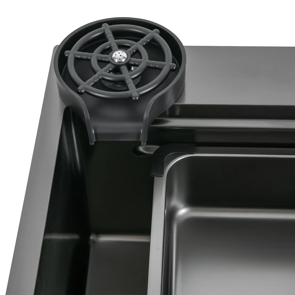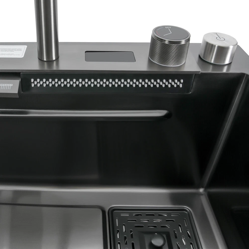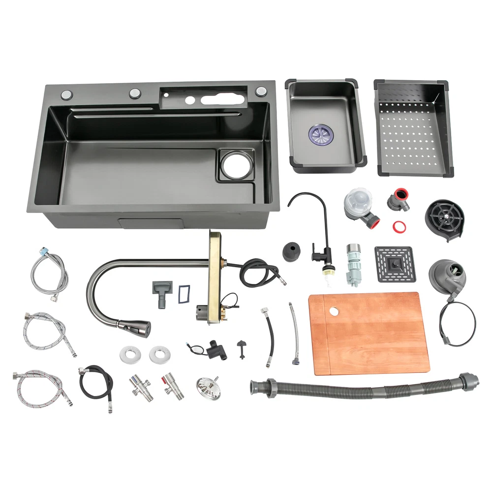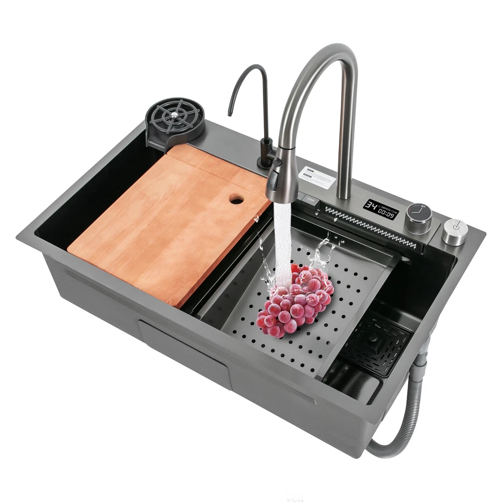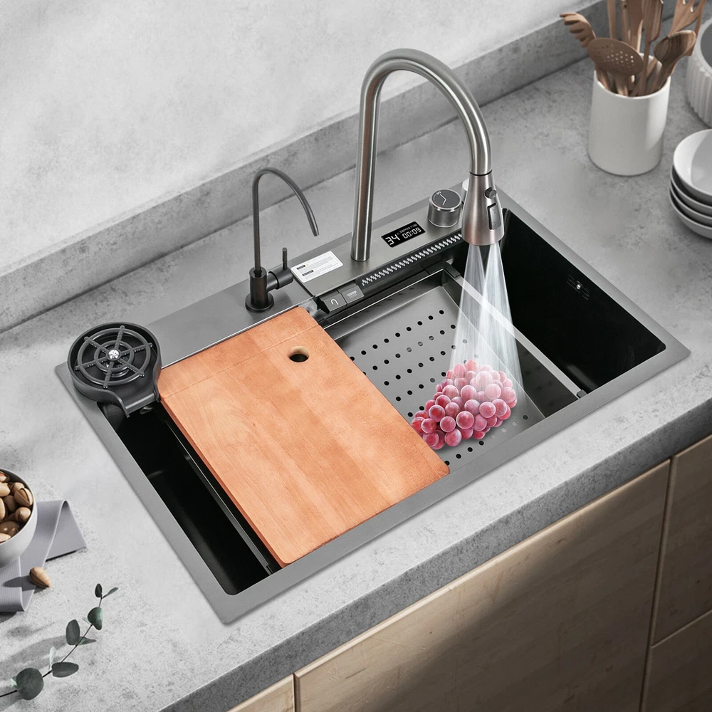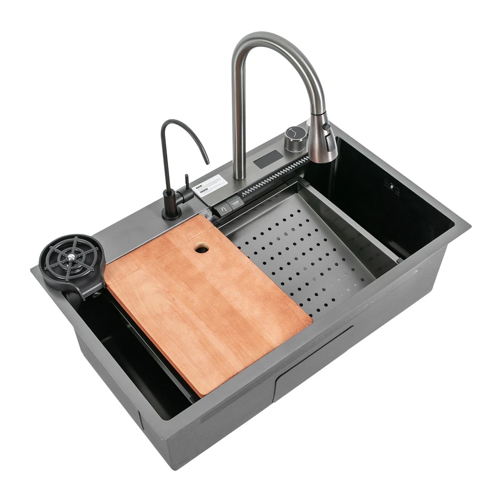 πππ Welcome to Interview888 πππ Welcome to our store~ Description This 201 stainless steel sink adopts a nano-electroplating process, with exquisite workmanship, which is wear-resistant and corrosion-resistant. Its enlarged and deepened sink not only alleviates splashing problems but also increases space utilization for washing large quantities of cookware. It can not only be used as a traditional sink but also can hold a cutting board for chopping vegetables and meat. With it, you can enjoy a more convenient and healthier life. Key Features Build to Last: The premium 201 stainless steel, as well as the exquisite nano-electroplating process, make this product wear-resistant, heat-resistant, corrosion-resistant, and not easy to rust and deform, ensuring a long service life. Large Sink Size: It is large (29.5*18.1*7.9 inches) and can accommodate a large number of plates, dishes, and pots at once. Moreover, it prevents splashing when washing fruits and vegetables. Washing Assistant: The 360Β° pull-out faucet, three water dispensing modes, and the waterfall spout make the product a wide range of cleaning and more convenient to use. The smart temperature display allows you to easily monitor water temperature and improve the safety of use, and the hydroelectric design doesn't require an external power supply, which is energy-saving and efficient. Humanized Design: The anti-condensation coating prevents condensation in the sink and thus prevents moisture in the kitchen cabinets, and sound-deadening pads reduce noise. Additionally, the right-drain design effectively increases the utilization of cabinet space underneath the sink. Multi-functional: The double-rail design of this sink helps you achieve efficient cooking. It converts into a work platform with the flexibility to place the mobile cutting board and draining basket without taking up countertop space, which greatly saves your workspace and makes it easier and more efficient for you to wash vegetables and dishes. Quick Drainage: It has deflector slots at the bottom for good drainage, effectively preventing water from accumulating inside. It comes with a convenient knob, removable strainer, and a large-diameter drain that allows large amounts of water to drain quickly while preventing food debris from clogging the pipes. Easy Installation: The simple structure and complete set of mounting accessories allow for fast and accurate installation. In addition, different mounting methods can meet your different needs. Easy to Clean: The smooth surface and round corner allow you to easily clean it without leaving dead corners of dirt accumulation. Ideal Gift: This product is stylish and high-quality and can be used as an ideal housewarming, birthday, and holiday gift for parents, friends, and loved ones. Good Customer Service: We stand behind all our guests and look forward to assisting you with your purchase. It is our pleasure to answer your confusion and questions. The end of the story between us is not "we sell and you buy". Details High-pressure Cup Washer: With it, you can operate with one hand, cleaning cups faster and more convenient, while freeing your hands. Water Purification Faucet: The product comes with a separate water purification faucet, and you can connect it to a water purifier (not included) for clean water. Narrow Edge: This design saves space and meets a variety of installation methods. Drain Pipe: It can be bent freely to suit the installation position, reducing restrictions on use. Arcs Shape: The rounded and smooth edges not only add to the aesthetics of the product but also improve the safety of use. Application This product can be widely used in homes, restaurants, laundry rooms, basements, bars, kitchens, food trucks, dessert shops, coffee shops, hotels, garages, gardens, pet shops, etc. for cleaning tableware, vegetables, fruits, pets, etc. Specification Color: Black Style: Modern Shape: Rectangular Material: 201 Stainless Steel Process: Nano-electroplating Assembly Required: Yes Cold Water Pipe Length: 60cm/ 23.62 in Hot Water Pipe Length: 60cm/ 23.62 in Downpipe Length: 60cm/ 23.62 in Faucet Height: 40cm/ 15.7in Sink Size: 75*46*20 cm/ 29.5*18.1*7.9 in Gross Weight: 12kg/ 26.46 lbs Package Size: 81*52*28 cm/ 31.89*20.47*11.02 in Package Included 1* Sink 1* Digital Pull-out Faucet 1* Cutting Board All Accessories for Installation Notes Please note that the main water outlet switch needs to be turned off after each use. Please do not let soft iron, hard or rusty objects contact with the sink for a long time. Please do not wash items in the sink with strong acids and bases. Please clean the sink after each use and wipe it dry. Please allow the slight color difference caused by the shooting light and the 1-3 cm error due to manual measurement, and make sure you do not mind before ordering. Payment Delivery details Terms of sales About us Contact us Payment We accept ebay payment γ Fees such as import duties, taxes are not included in the item price or shipping costs. These charges are the buyer's responsibility. Delivery details Shipping: 2-9 working days to: USA Terms of sales We maintain high standards of excellence and strive for hundred percent customer satisfaction. Feedback is very important to us. We hope that you contact us immediately before you give neutral or negative feedback, so that we can address your concerns. It is impossible to address issues if we do not know about them! About us Your satis faction is our ultimate goal. We work hard to earn your trust and future business. Our certified technicians have tested each item before shipping. The unit comes with 1 year limited warranty on all manufacturing defects. a) If you receive a defective item, you may return it or ask for a discount. Please contact us within 14 days after you receive the package. b) What you returned must be intact and in its original packaging as re? u. Customer is responsible for shipping costs of the returned item. c) We wi