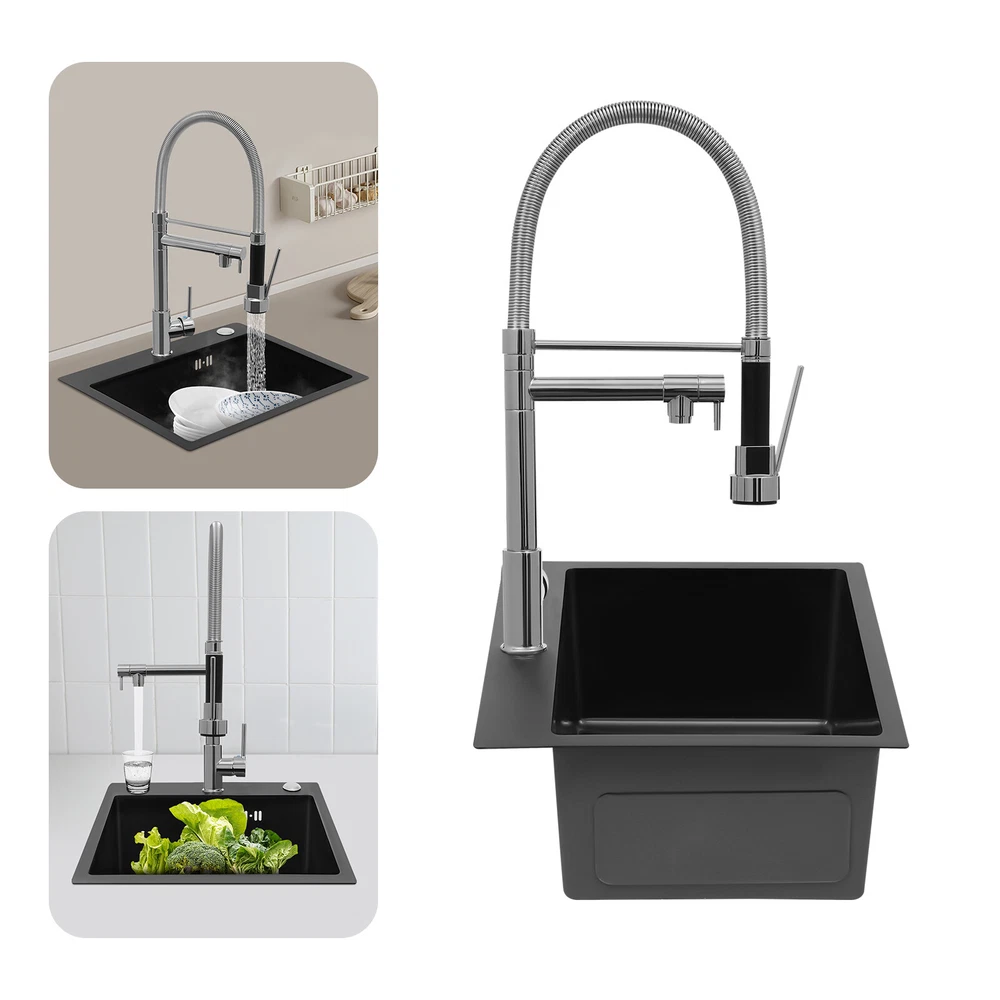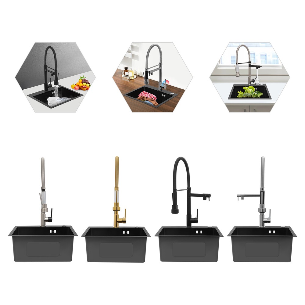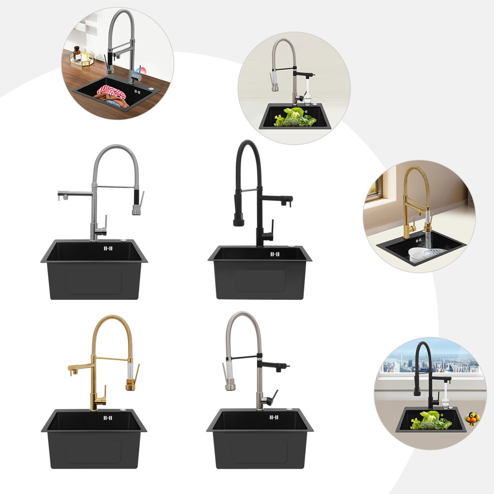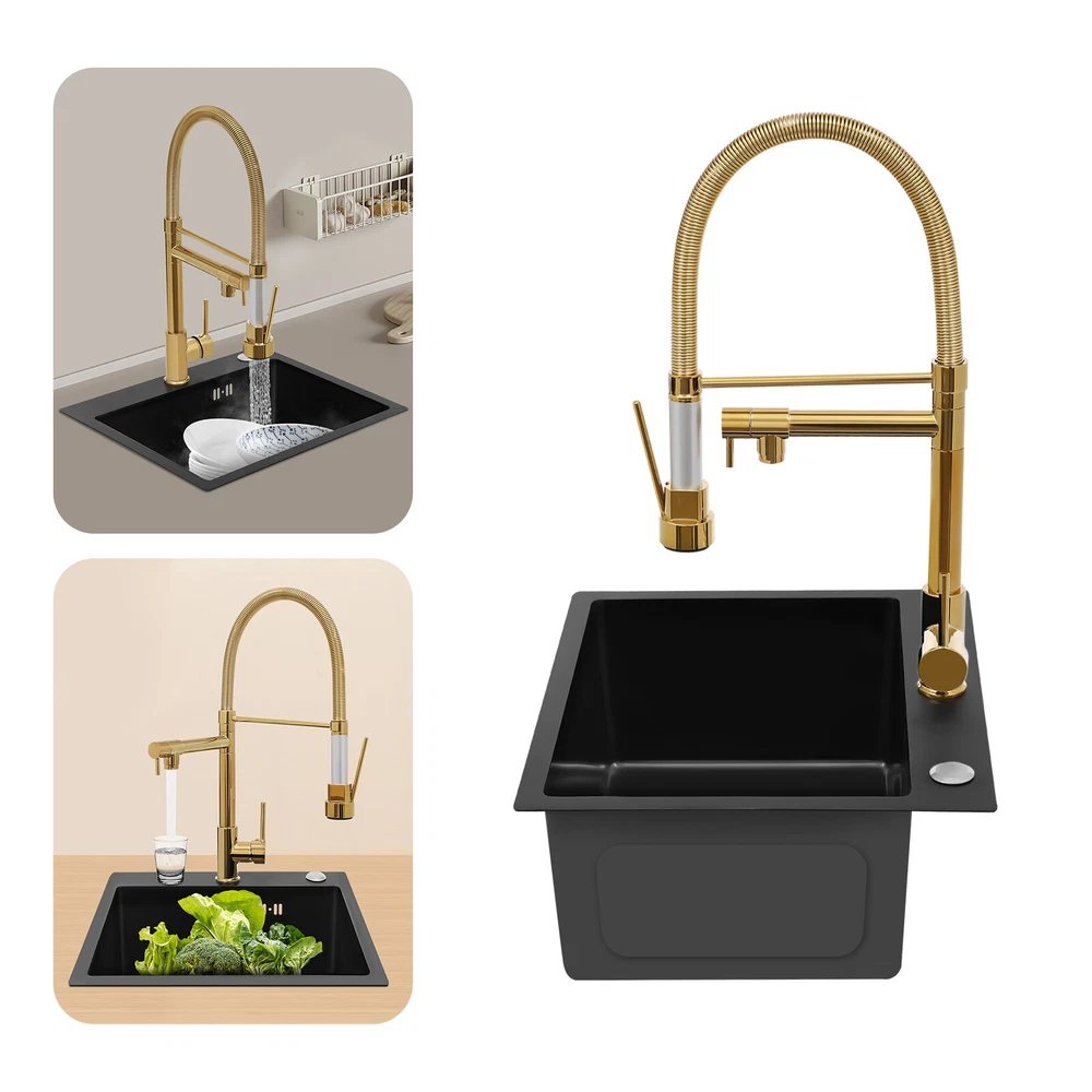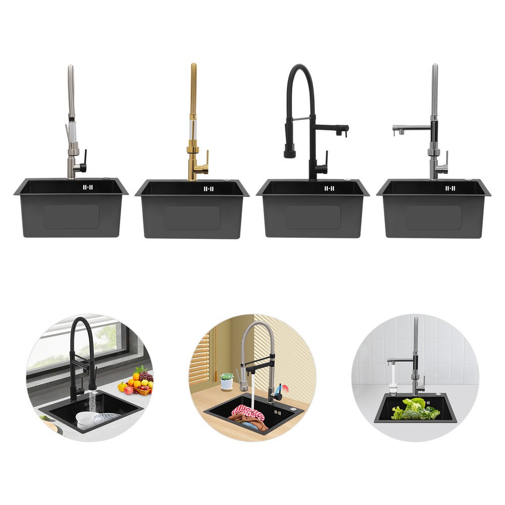 Specification Color: Titanium Gold/Black/Silver Material: Brass, Stainless Steel, Ceramic and Silicone Surface Treatment: Vacuum Plating/Electroplated/Brushed/Baking Paint Assembly Required: Yes Mount Type: Sink-mounted Interface: G1/2inch Rotation: 360° Fix Rod Length: 20.5cm/8.07in Installation Hole Diameter: 5cm/1.97inch Product Overall Height: 41cm/16.14inch Gross Weight: 2.5kg/5.5lbs Net Weight: 2kg/4.4lbs Package Size: 58.5*29.5*5.9cm/23.03*11.61*2.32inch Package Included 1* Kitchen Tap 2* Hoses 1* English Installation Manual Other Accessories for Installation Kitchen Sink Single Handle Stainless Steel Faucet with Pull Down Sprayer Description An excellent kitchen tap is not only an elegant gift of life like a spring, but also a flexible assistant in cooking and a creator of a clean environment. It not only gives you pure and healthy life enjoyment but also in the cooking of food kitchen territory and the pursuit of freshness and cleanliness in the bathroom space, weaving the double rhythm of convenience and elegance. Key Features Build to Last: The high-quality stainless steel and brass with a vacuum plating/baking paint/brushed/electroplated process ensures high rigidity and durability, making it ideal for kitchen and bathroom use. Thoughtful Design : It comes with a buckle design for continuous water dispensing, giving you the freedom to wash items without having to keep pressing the spray head, while the height-appropriate stand provides more comfort and safety. Hot and Cold Use: You can control the water temperature and water flow through a single handle, which is easy and convenient. Comfortable Experience: Its air bubbler can make the water flow more smoothly and reduce noise and water consumption, providing you with fine and uniform water without splashing. In addition, the spray mode and stream mode allow you to enjoy a comfortable washing experience. Enhance Your Relationship: The faucet with a pull-down sprayer and separate spout can be turned on at the same time. If your loved one or roommate prepares dinner or does the dishes with the sprayer, you can do what you want with the other sprayer, saving time and increasing intimacy. Compact Spring: The spring design makes the product more flexible to use, taking into account 360 degrees of rotation and 360 degrees of bending, which in turn facilitates you to change the curvature of the hose with less effort, and giving your kitchen tap a full range of washes. Easy to Clean: Thanks to its smooth surface and simple structure, you can clean it with a damp rag or water. Plus, the silicone spout makes it possible to clear clogs with a flick of your hand! Quality Service: We stand behind all our guests and look forward to assisting you with your purchase. It is our pleasure to answer your confusion and questions. The end of the story between us is definitely not "we sell and you buy" . Details Ceramic Valve Core: The sturdy and durable ceramic valve core can effectively prevent water leakage, improv e the stability of the faucet, and reduce the scale. Flexible Sprayer Stand&Faucet: They can be rotated 360° for convenient use and space-saving. Standard G1/2 Interface: The standard G1/2-inch interface makes this product suitable for most water supply systems. Practical Hoses: They provide you with easy access to a water source for hot and cold use. Application It is suitable for single and double sinks of different shapes in homes, restaurants, shopping centers, schools, companies, hotels, kitchens, clinics, hospitals, KTVs, subway stations, bathrooms, and more. It is suitable for washing pots and pans Specification Color: Titanium Gold/Black/Silver Material: Brass, Stainless Steel, Ceramic and Silicone Surface Treatment: Vacuum Plating/Electroplated/Brushed/Baking Paint Assembly Required: Yes Mount Type: Sink-mounted Interface: G1/2inch Rotation: 360° Fix Rod Length: 20.5cm/8.07in Installation Hole Diameter: 5cm/1.97inch Product Overall Height: 41cm/16.14inch Gross Weight: 2.5kg/5.5lbs Net Weight: 2kg/4.4lbs Package Size: 58.5*29.5*5.9cm/23.03*11.61*2.32inch Package Included 1* Kitchen Tap 2* Hoses 1* English Installation Manual Other Accessories for Installation Notes Please install it in strict accordance with the instructions and pay attention to the safety precautions inside. Please allow the slight color difference caused by the shooting light and the 1-3cm error due to manual measurement. Please make sure you do not mind before you order. Payment Delivery details Terms of sales About us Contact us Payment We accept ebay payment 。 Fees such as import duties, taxes are not included in the item price or shipping costs. These charges are the buyer's responsibility. Delivery details Shipping: 2-9 working days to: USA Terms of sales We maintain high standards of excellence and strive for hundred percent customer satisfaction. Feedback is very important to us. We hope that you contact us immediately before you give neutral or negative feedback, so that we can address your concerns. It is impossible to address issues if we do not know about them! About us Your satis faction is our ultimate goal. We work hard to earn your trust and future business. Our certified technicians have tested each item before shipping. The unit comes with 1 year limited warranty on all manufacturing defects. a) If you receive a defective item, you may return it or ask for a discount. Please contact us within 14 days after you receive the package. b) What you returned must be intact and in its original packaging as re? u. Customer is responsible for shipping costs of the returned item. c) We will cover the cost of shipping back t with the shipping rate indicated in the registration page. We will send you a new unit or refund the full payment you paid. Thank you. Contact us Business Hour Business Hour: Monday To Friday: 8:30 AM to 5:00 PM (Beijing China time) Due to time zones, our reply to your questions may not be immediately. But within above working 