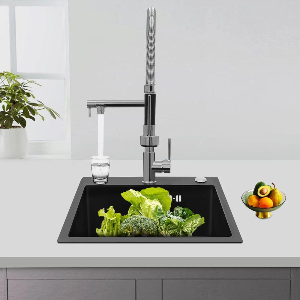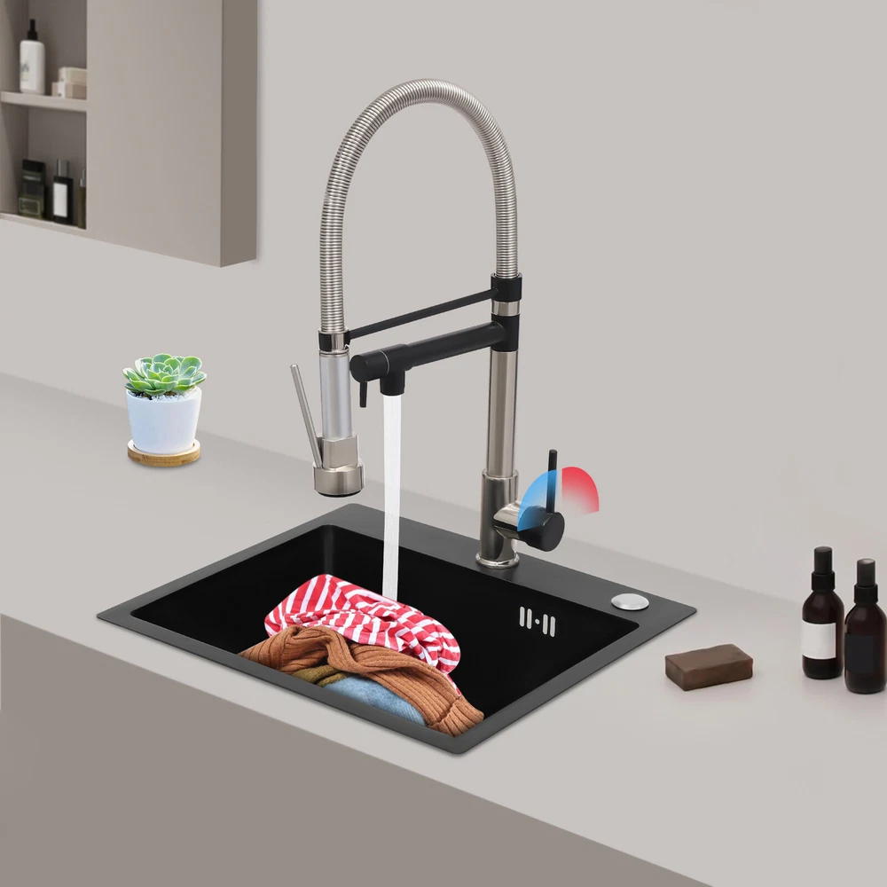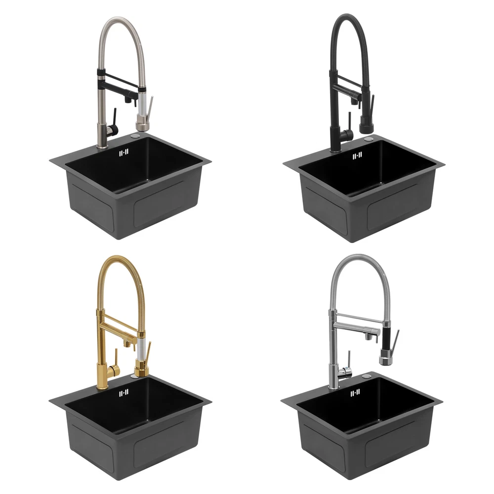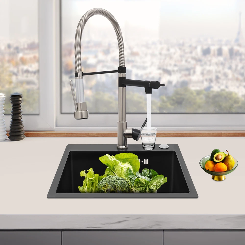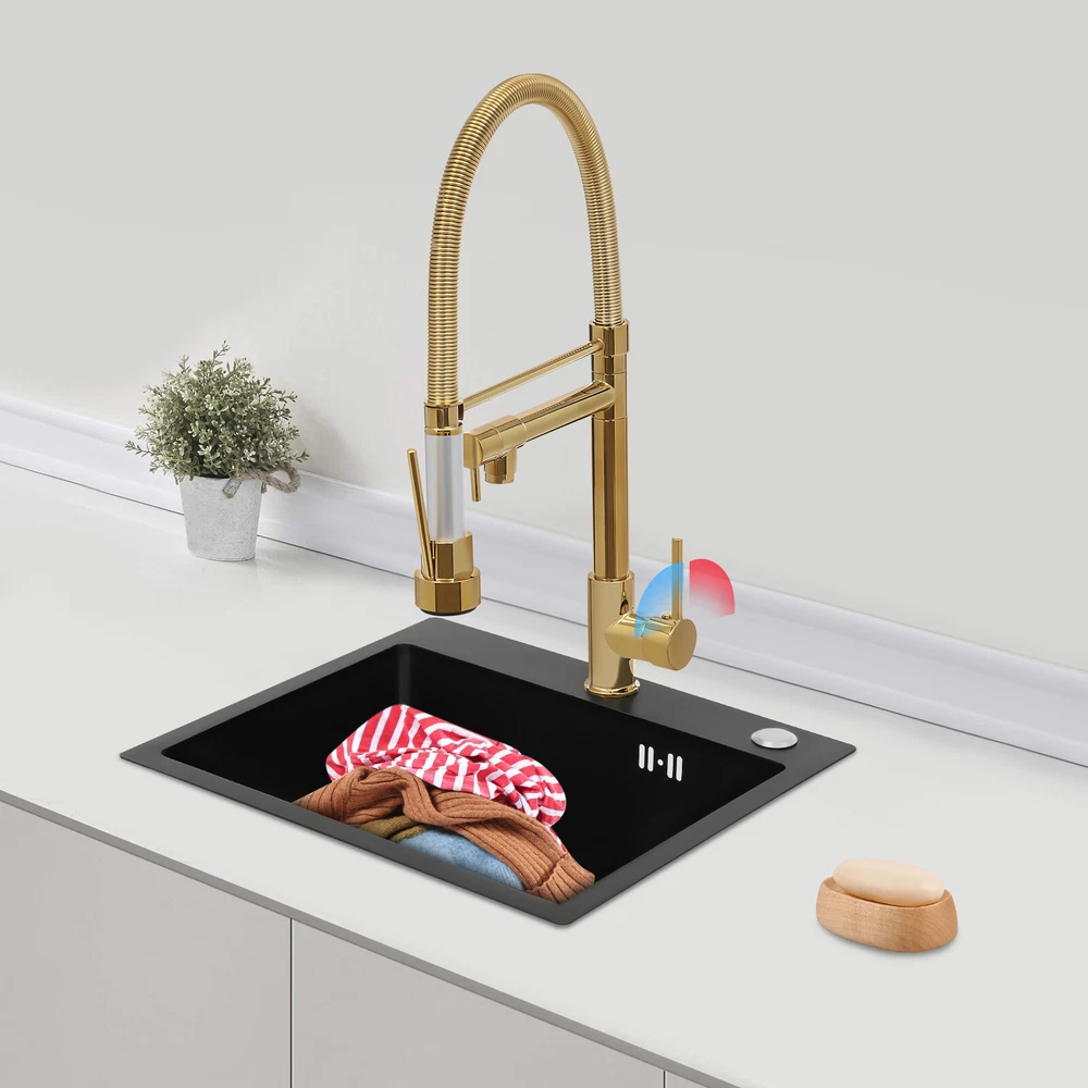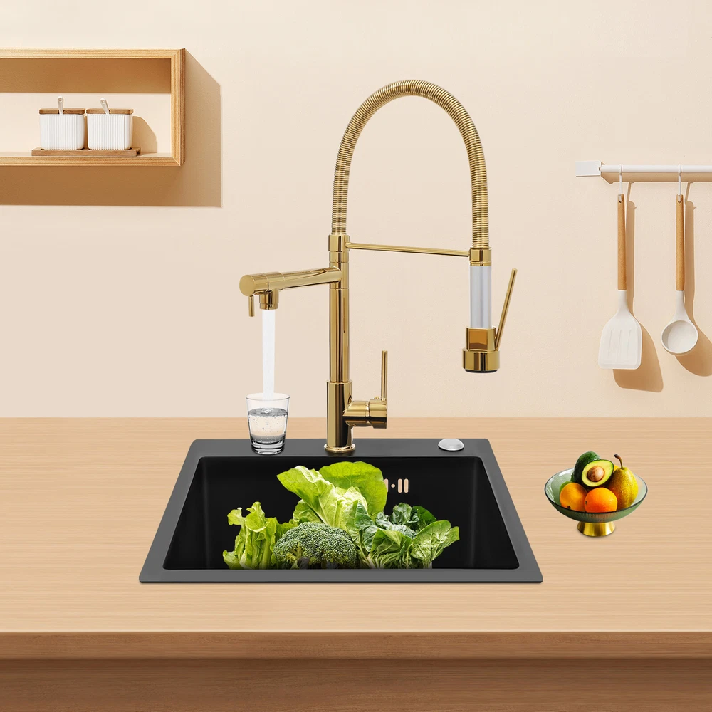 Specification Color: Titanium Gold/Black/Silver Material: Brass, Stainless Steel, Ceramic and Silicone Surface Treatment: Vacuum Plating/Electroplated/Brushed/Baking Paint Assembly Required: Yes Mount Type: Sink-mounted Interface: G1/2inch Rotation: 360° Fix Rod Length: 20.5cm/8.07in Installation Hole Diameter: 5cm/1.97inch Product Overall Height: 41cm/16.14inch Gross Weight: 2.5kg/5.5lbs Net Weight: 2kg/4.4lbs Package Size: 58.5*29.5*5.9cm/23.03*11.61*2.32inch Package Included 1* Kitchen Tap 2* Hoses 1* English Installation Manual Other Accessories for Installation Kitchen Sink Single Handle Stainless Steel Faucet with Pull Down Sprayer Description An excellent kitchen tap is not only an elegant gift of life like a spring, but also a flexible assistant in cooking and a creator of a clean environment. It not only gives you pure and healthy life enjoyment but also in the cooking of food kitchen territory and the pursuit of freshness and cleanliness in the bathroom space, weaving the double rhythm of convenience and elegance. Key Features Build to Last: The high-quality stainless steel and brass with a vacuum plating/baking paint/brushed/electroplated process ensures high rigidity and durability, making it ideal for kitchen and bathroom use. Thoughtful Design : It comes with a buckle design for continuous water dispensing, giving you the freedom to wash items without having to keep pressing the spray head, while the height-appropriate stand provides more comfort and safety. Hot and Cold Use: You can control the water temperature and water flow through a single handle, which is easy and convenient. Comfortable Experience: Its air bubbler can make the water flow more smoothly and reduce noise and water consumption, providing you with fine and uniform water without splashing. In addition, the spray mode and stream mode allow you to enjoy a comfortable washing experience. Enhance Your Relationship: The faucet with a pull-down sprayer and separate spout can be turned on at the same time. If your loved one or roommate prepares dinner or does the dishes with the sprayer, you can do what you want with the other sprayer, saving time and increasing intimacy. Compact Spring: The spring design makes the product more flexible to use, taking into account 360 degrees of rotation and 360 degrees of bending, which in turn facilitates you to change the curvature of the hose with less effort, and giving your kitchen tap a full range of washes. Easy to Clean: Thanks to its smooth surface and simple structure, you can clean it with a damp rag or water. Plus, the silicone spout makes it possible to clear clogs with a flick of your hand! Quality Service: We stand behind all our guests and look forward to assisting you with your purchase. It is our pleasure to answer your confusion and questions. The end of the story between us is definitely not "we sell and you buy" . Details Ceramic Valve Core: The sturdy and durable ceramic valve core can effectively prevent water leakage, improv e the stability of the faucet, and reduce the scale. Flexible Sprayer Stand&Faucet: They can be rotated 360° for convenient use and space-saving. Standard G1/2 Interface: The standard G1/2-inch interface makes this product suitable for most water supply systems. Practical Hoses: They provide you with easy access to a water source for hot and cold use. Application It is suitable for single and double sinks of different shapes in homes, restaurants, shopping centers, schools, companies, hotels, kitchens, clinics, hospitals, KTVs, subway stations, bathrooms, and more. It is suitable for washing pots and pans Specification Color: Titanium Gold/Black/Silver Material: Brass, Stainless Steel, Ceramic and Silicone Surface Treatment: Vacuum Plating/Electroplated/Brushed/Baking Paint Assembly Required: Yes Mount Type: Sink-mounted Interface: G1/2inch Rotation: 360° Fix Rod Length: 20.5cm/8.07in Installation Hole Diameter: 5cm/1.97inch Product Overall Height: 41cm/16.14inch Gross Weight: 2.5kg/5.5lbs Net Weight: 2kg/4.4lbs Package Size: 58.5*29.5*5.9cm/23.03*11.61*2.32inch Package Included 1* Kitchen Tap 2* Hoses 1* English Installation Manual Other Accessories for Installation Notes Please install it in strict accordance with the instructions and pay attention to the safety precautions inside. Please allow the slight color difference caused by the shooting light and the 1-3cm error due to manual measurement. Please make sure you do not mind before you order. Payment Delivery details Terms of sales About us Contact us Payment We accept ebay payment 。 Fees such as import duties, taxes are not included in the item price or shipping costs. These charges are the buyer's responsibility. Delivery details Shipping: 2-9 working days to: USA Terms of sales We maintain high standards of excellence and strive for hundred percent customer satisfaction. Feedback is very important to us. We hope that you contact us immediately before you give neutral or negative feedback, so that we can address your concerns. It is impossible to address issues if we do not know about them! About us Your satis faction is our ultimate goal. We work hard to earn your trust and future business. Our certified technicians have tested each item before shipping. The unit comes with 1 year limited warranty on all manufacturing defects. a) If you receive a defective item, you may return it or ask for a discount. Please contact us within 14 days after you receive the package. b) What you returned must be intact and in its original packaging as re? u. Customer is responsible for shipping costs of the returned item. c) We will cover the cost of shipping back t with the shipping rate indicated in the registration page. We will send you a new unit or refund the full payment you paid. Thank you. Contact us Business Hour Business Hour: Monday To Friday: 8:30 AM to 5:00 PM (Beijing China time) Due to time zones, our reply to your questions may not be immediately. But within above working 