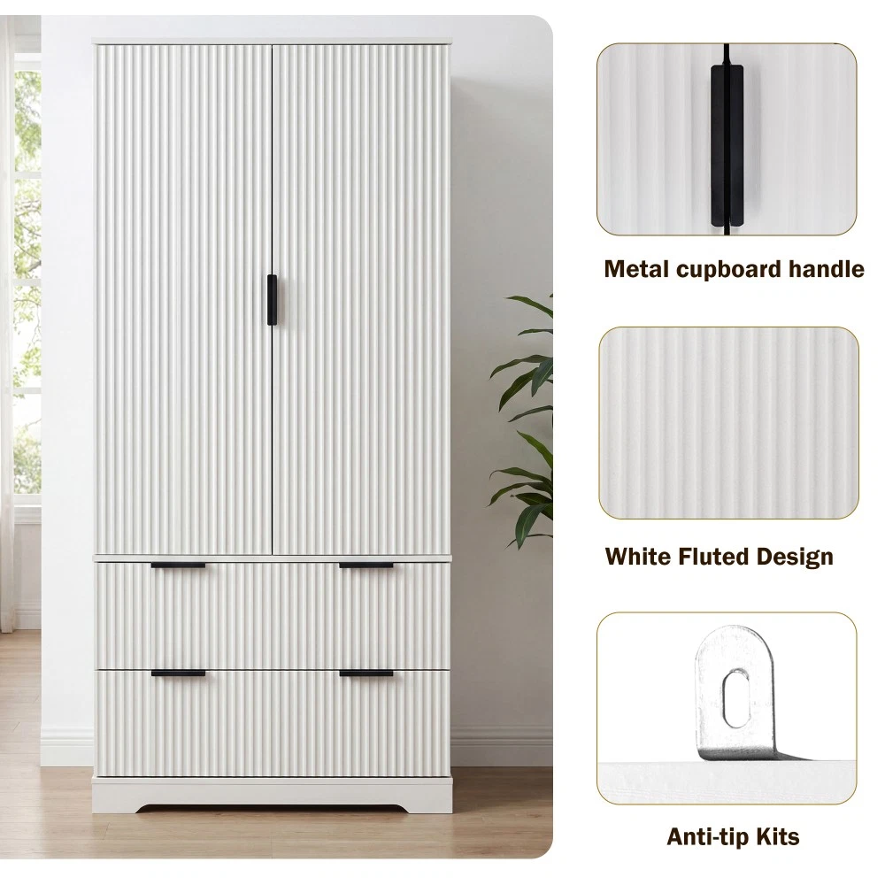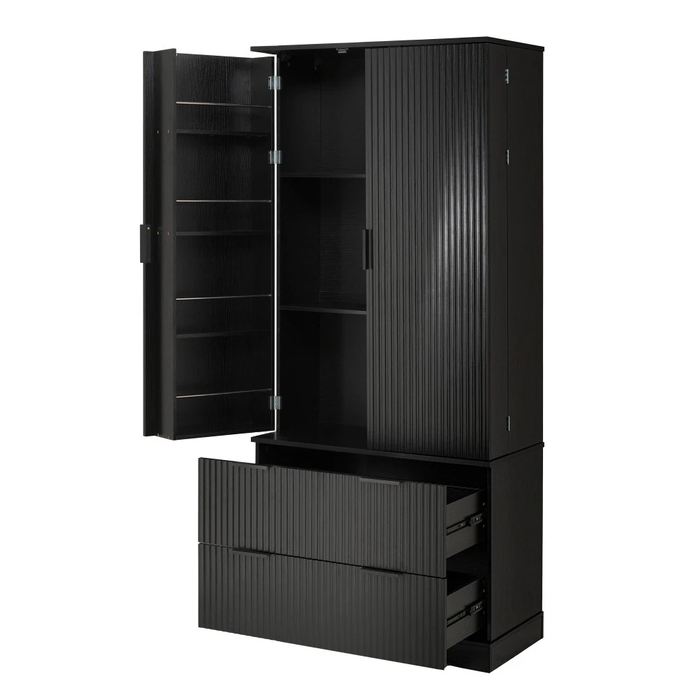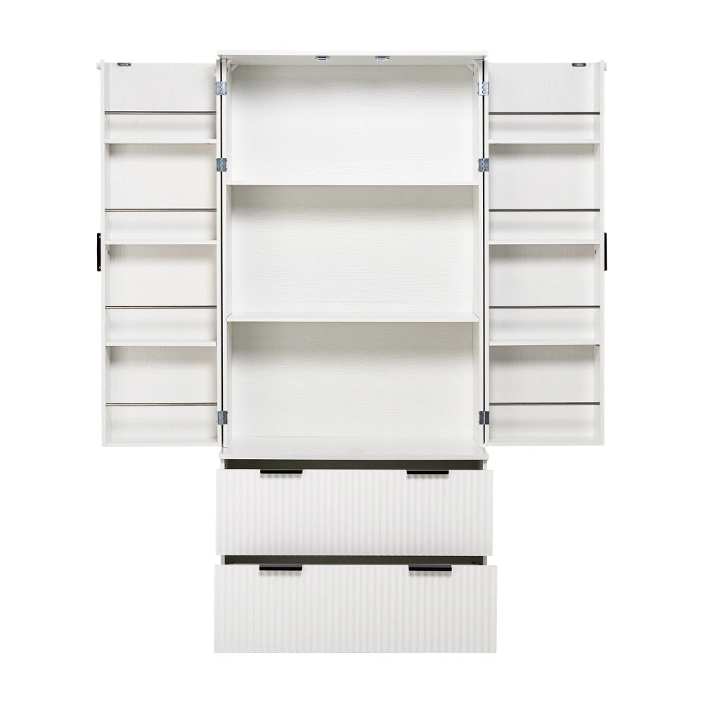 72" Modern Fluted Kitchen Pantry Cabinet - 2 Drawers & 8-Door Spice Rack (Black/White) Freestanding Storage Cabinet | Fluted Texture | Spice Racks | Metal Handles | 1-Year Warranty & 30-Day Free Return Elevate your home storage with our 72" fluted pantry cabinet, blending French-inspired elegance with exceptional functionality. Crafted from high-quality MDF, this freestanding cabinet features 2 large drawers, 3 upper shelves, and built-in door spice racks—perfect for organizing kitchens, bathrooms, offices, entryways, or dining rooms. Choose between sleek black or classic white to complement your interior style. Style 1: Black 72" Fluted Kitchen Pantry Cabinet Product Specifications Category Details Origin China Color/Finish Black (High-Gloss Protective Laminate) Material Premium MDF with Protective Laminate, Metal Handles Assembled Dimensions 31.49" L x 15.75" W x 71.65" H Product Weight 117.70 lbs Package Dimensions 51.97" L x 18.90" W x 9.45" H Package Weight 127.16 lbs Storage Configuration 2 Large Deep Drawers, 3 Upper Shelves (3rd Shelf Adjustable), 8-Door Built-In Spice Racks Assembly Requirement Yes (Recommended for 2 Adults; Numbered Accessories & Detailed Instructions) Key Features Chic French-Inspired Design : This black pantry cabinet combines vintage French charm with modern functionality, featuring vertical fluted stripes that add visual depth and lengthen proportions. Sleek metal handles enhance refinement, durability, and ease of use, making it a stylish centerpiece for both traditional and contemporary interiors. Maximized Spacious Storage : Designed for versatility, the cabinet offers 3 upper shelves and 2 deep lower drawers—blending open and concealed storage. Store dishes, small appliances, daily essentials, or bathroom supplies, eliminating clutter and keeping your space tidy. Perfect as a kitchen pantry, hallway organizer, or bathroom storage unit. Built-In Door Spice Racks : Integrated spice racks on both cabinet doors optimize storage for condiments, jars, and small items, maximizing every inch of space. The smart design prevents items from shifting when opening/closing doors, keeping your spices organized and easily accessible without rummaging through crowded cabinets. Easy-to-Clean & Durable : The high-gloss protective laminate surface resists stains, fingerprints, and moisture. A simple wipe with a damp cloth removes dust and spills, saving you time on household chores while maintaining a pristine look for years to come. Straightforward Assembly : All accessories are clearly numbered, and detailed installation guides are available on the product page. We recommend two adults for assembly; our customer support is ready to assist if you encounter any challenges. Style 2: White 72" Fluted Kitchen Pantry Cabinet Product Specifications Category Details Origin China Color/Finish White (Smooth, Easy-to-Clean Finish) Material Durable MDF, Metal Handles Assembled Dimensions 31.49" L x 15.75" W x 71.65" H Product Weight 117.70 lbs Package Dimensions 51.97" L x 18.90" W x 9.45" H Package Weight 127.16 lbs Storage Configuration 2 Large Deep Drawers, 3 Upper Shelves (3rd Shelf Adjustable), 8-Door Built-In Spice Racks Assembly Requirement Yes (Recommended for 2 Adults; Numbered Accessories & Detailed Instructions) Key Features Elegant French Refrigerator-Inspired Design : Add timeless charm to your home with this white pantry cabinet, featuring a classic French refrigerator-inspired look and fluted texture. The elegant silhouette seamlessly complements kitchens, dining rooms, living rooms, or bathrooms, blending style and functionality effortlessly. Versatile Spacious Storage : Equipped with 3 upper shelves and 2 roomy lower drawers, this cabinet provides ample storage for dishes, small kitchen appliances, everyday essentials, or bathroom toiletries. The mix of open and concealed storage offers flexible organization options to suit any room’s needs. Adjustable Built-In Spice Racks : Each cabinet door features integrated spice racks, perfect for storing condiments, jars, and small items. The 3rd upper shelf is adjustable, allowing you to customize the space for taller items—transforming door space into functional storage and keeping essentials within reach. Sturdy Construction & Easy Maintenance : Crafted from durable MDF, this cabinet is built to withstand daily use. Sleek metal handles add a modern touch, while the smooth finish resists dirt and stains, making it easy to clean with a simple wipe—ensuring long-lasting durability and aesthetics. Multi-Room Functionality : Beyond the kitchen, this cabinet works beautifully as a bathroom storage unit, office organizer, entryway console, or dining room sideboard. Its stylish design and ample storage make it a versatile addition to any room in your home. Hassle-Free Assembly : All parts are numbered for clarity, and detailed installation instructions are provided on the product page. Two adults are recommended for assembly, and our customer service team is available to assist with any assembly challenges. Warranty & Return Policy Shop with confidence! Both black and white pantry cabinets come with a 1-Year Manufacturer Warranty , covering defects in materials and craftsmanship. If you’re not completely satisfied with your purchase, take advantage of our 30-Day Free Return Policy —no questions asked. Our dedicated customer support team is ready to assist you before and after purchase for a seamless experience. Upgrade your home storage with a cabinet that combines French elegance, durable construction, and versatile functionality. Choose your preferred color and order today to enjoy a clutter-free space with peace of mind!