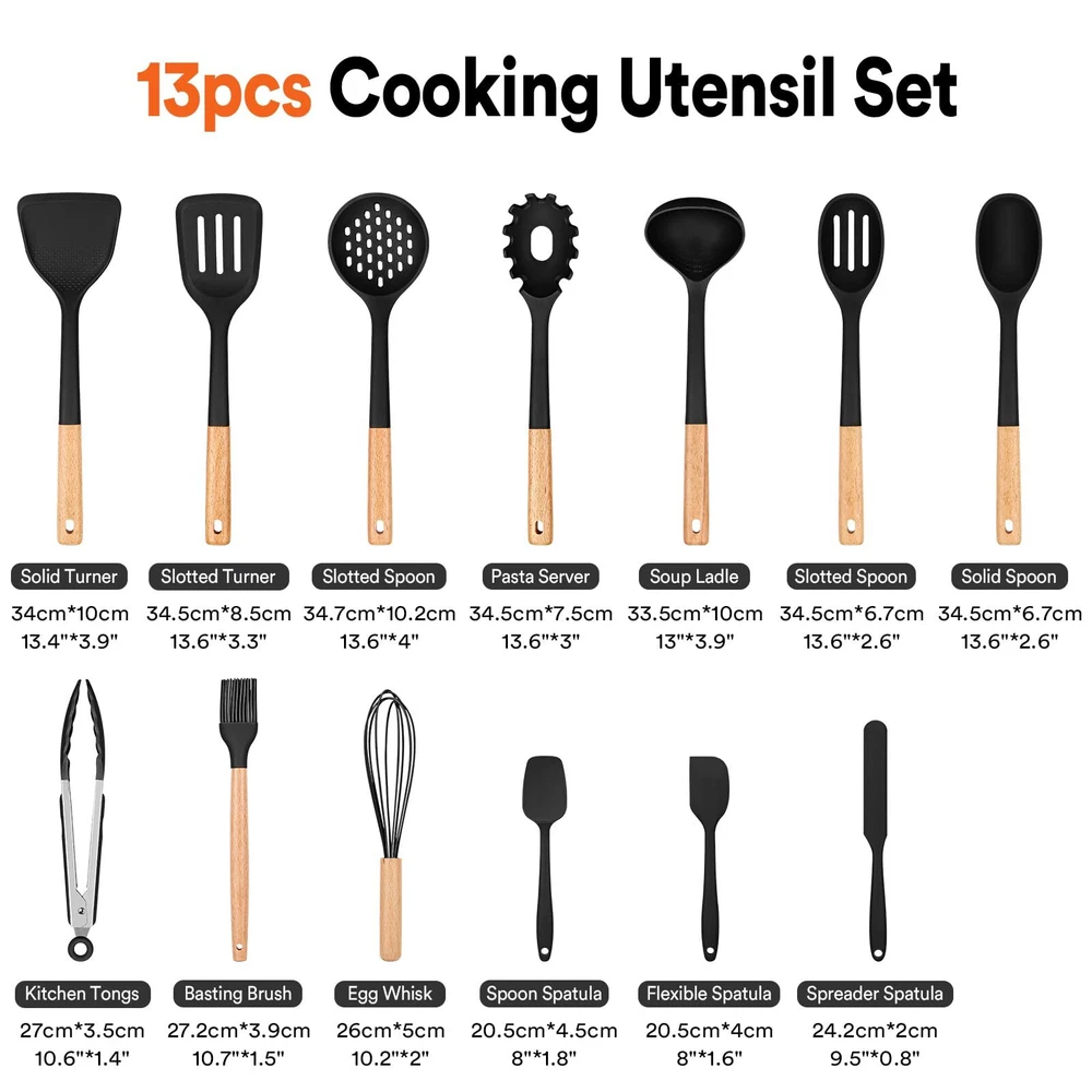 Versatile and Comprehensive: From the everyday kitchen spoons to the oil brush.This kitchen utensils set includes a wide range of silicone cooking utensils, gadgets, and essentials, providing you with everything you need for a variety of cooking tasks Nonstick and Heat-Resistant: The silicone coating on these utensils ensures easy food release and effortless cleaning, while the heat-resistant (up to a whopping 446°F ) to properties allow for safe and comfortable handling on high-temperature stovetops and grills Vintage Wooden Handle: Each wooden handle is made of solid wood which is anti scalding. Smooth and comfortable, precise control while cooking. The wooden spoon and spatula set adds a touch of elegance to your kitchen Odorless BPA-Free, Food-Grade Silicone: Made from durable and food-grade materials, this kitchen utensils set is built to withstand daily use and provide long-lasting performance in your kitchen Convenient Storage: This kitchen utensils set features a hanging hole design for easy and organized storage. Keep your kitchen counter tops clutter-free while having all your essential tools within reach