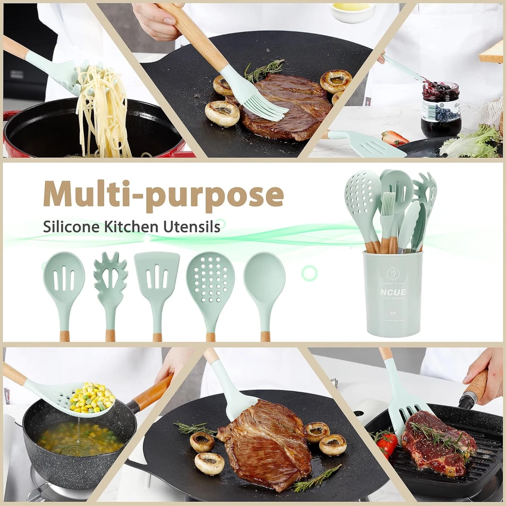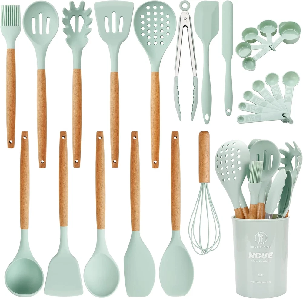 Store New Arrivals Add to Favorite View Feedback Contact Kitchen Utensils Set, 26 Pcs BPA Free Non-Stick Silicone Cooking Kitchen Utensils Set with Holder, Wooden Handle Heat Resistance Silicone Spatula Spoon Kitchen Gadgets Utensils Set (Light Green) Description Item model number NC26P Color Light Green Material Silicone Is Dishwasher Safe Yes Item Weight 3.11 pounds Handle Material Wood Recommended Uses For Product Serving, Flipping, Spreading Shape Rectangular, Trapezoid, Round Size small Product Dimensions 12.67"L x 4.5"W Material Type Free BPA Free Food Grade Silicone: This kitchen cookware set is made of food grade silicone and is BPA free. They will not react with food or drinks and will not produce any fumes. They will not bend or break like other cheap silicone kitchen utensils, so you and your family can enjoy the process of preparing food with confidence Heat and Scratch Resistant: All-around silicone added softness has a super heat resistance of up to 446°F/230°, so you don't have to worry about them melting if you accidentally leave them in the pan for a while. The silicone tip protects your pans and keeps the surface of your cookware from getting scratched or dented. Extend the life of all kitchen pans Easy to Clean And Quality Wood Handles: This set of quality kitchen silicone utensils is easy to clean, just wipe in warm water. The high quality wooden handle will not bend or rust and completely reduce heat transfer during cooking to avoid burning your hands. Practical hanging hole design allows for easy storage using hooks or wall hangings Complete Cooking Set: 26 silicone cooking utensils set including flexible spatulas, soup spoons, serving spoons, pasta servers, spatula turners, tongs, measuring cups and spoons and more. Meet your various kitchen needs, you don't need to spend a lot of money to buy each utensil individually. If you have any questions about our cutlery sets, please feel free to contact our customer service and we will be happy to help you Fine Gift: 26 different shapes of unique function cookware will be a good helper in your kitchen, it can be given as a gift to anyone who likes to cook, it is an ideal gift for friends and family at Christmas, Thanksgiving, wedding and housewarming party Product Description They will satisfy all your needs for cooking, would be your great companion in the kitchen. Each of them has its unique use. And the simple and modern design fits perfectly in any kitchen, easily matching the style of any other item or appliance. 100% PREMIUM BPA FREE NON-STICK FOOD GRADE SILICONE Does not react with food or drinks, or produce any harmful fumes. Soft silicone won't scratch your expensive pans. ABS Plastic Filter utensils Holder with small drainage holes in the bottom ensure no water stay. High temperature resistance up to 446°F/230°C. The soft silicone won't scratch non-stick pans or your larger pans. Meet your various cooking needs 26-Piece Kitchen Utensil Set With holder for neaty storage and drain easily ABOUT US We offer the best prices around on high quality products. Our E-store includes media such as books, movies, music and games while offering electronics, toys, sporting apparel, clothing, tools, general home, garden items and more. SHIPPING We are always working hard to ensure your package arrives as soon as possible. Please understand that some factors like weather, high postal traffic, and the performance of shipping companies are outside of our control. We offer free shipping to the lower 48 states and ship within 2 business days of payment, usually sooner. We do not accept P.O. Boxes. Please provide a physical address. For shipping outside of the continental USA, we only use eBay's Global Shipping Program.The item is shipped to KY and then sent to the rest of the world. International customers are responsible for all duties and taxes. Continue to check out in order to calculate costs for shipping the item to your country. Messages regarding eBay's Global Shipping Program MUST be directed at eBay EXCLUSIVELY. RETURNS We offer a 30-Day Return Policy on items which you are not completely satisfied with. You have the option for a full-refund or an exchange of the item. No returns are available on items shipped outside of the USA. PAYMENT We accept PayPal. CONTACT US This page content is yet to come Please ad us to your favorite seller and visit again later Thank You CUSTOMER SATISFACTION We try our very best to make sure every customer is completely satisfied. If there's a problem, message us! We're happy to help. WE ACCEPT Copyright © 2021 AutoDS. | All Rights Reserved