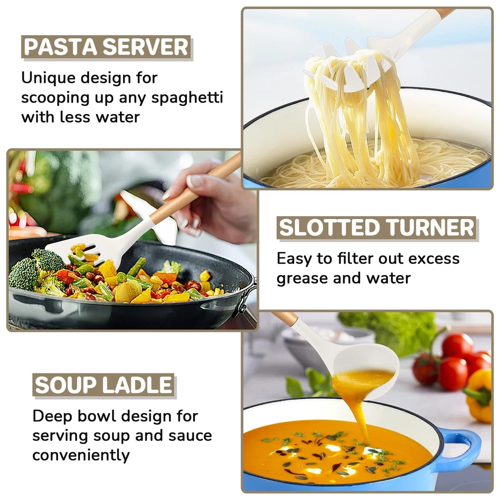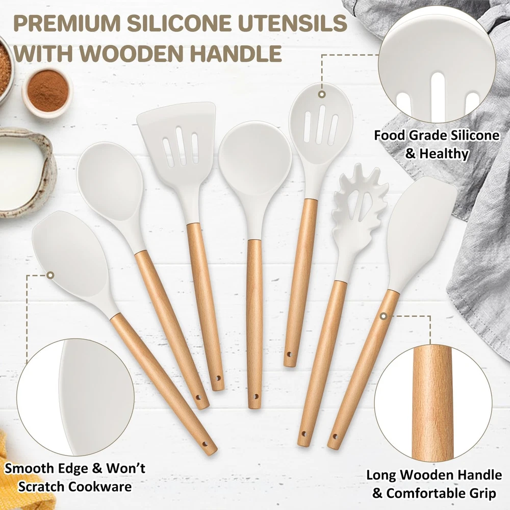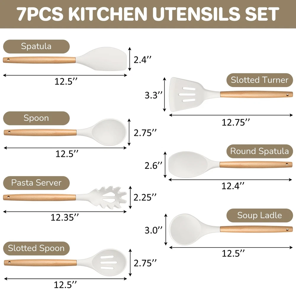 Silicone Kitchen Utensils Set of 7, made of food grade silicone and premium wood. No toxic substance leaching into food and won’t harmful to you and your families. The silicone heads are high heat resistant for no melting or deforming during. The silicone heads are strongly connected to wooden handles for not easily breaking off. Non-slip and ergonomic handles for comfortable grip. 7pcs kitchen cooking utensils for more convenient and practical in your cooking life. Specification List of Package: 7 pieces – pasta server, soup ladle, slotted turner, solid spoon, slotted spoon, spatula, spatula spoon Material: Silicone, wood Features: Nontoxic, heat proof, non scratch, non-stick, firmly connected Dimension (Length x Width) Pasta server – 12.35’’ x 2.25’’ Soup ladle – 12.5’’ x 3’’ Slotted turner – 12.75’’ x 3.3’’ Solid spoon – 12.5’’ x 2.75’’ Slotted spoon – 12.5’’ x 2.75’’ Spatula – 12.5’’ x 2.4’’ Spatula spoon – 12.4’’ x 2.6’’ Advantages Non Toxic – Made of food grade silicone and premium wood, ensuring nontoxic and healthy cooking. Heat Proof – Premium silicone heads are high heat-proof, no melting, no deforming or no bending when cooking. Long Ergonomic Handle – Long handle design keeps your hand away from the heat and wooden handles for better heat insulation to avoid burning your hand. Non Scratch – Soft silicone heads effectively avoid scratching your nonstick pans and pots’ surfaces. Easy Cleanup – Non-stick smooth surface helps easily clean by hands, make cleaning a breeze. Using Instructions 1. Please wash them with warm water before first using to wash off any residue left from manufacturing. 2. Please wash with soapy water and clean them with soft dishcloth or sponge to avoid scratching the surface. NOT DISHWASHER SAFE. 3. Please dry them immediately rather than air dry for a longer lifespan. 4. Please do not directly put the silicone kitchen utensils on the flame. FOOD GRADE SILICONE – kitchen utensils set is made of premium food grade silicone without any toxic substance and doesn’t react with food to affect its taste, Let you enjoy the pleasant and safe cooking experience HEAT RESISTANT – This cooking utensils set can withstand high temperature up to 446°F/230°C, No melting or deforming during cooking, Silicone head with high softness to keep your non-stick frying pans or stock pots from scratching, Extend their service life and long lasting for years, A great replacement of metallic cooking utensils ERGONOMIC WOODEN HANDLE – This silicone kitchen utensils’ handles are made of solid wood, Smooth surface without any sharp spurs to provide comfortable grip, Anti-scald wood handle effectively protects your hand from burning during heat transferring EASY CLEAN & STORE –Non-stick surface for easy food releasing to help clean easily, Hand wash recommended for better maintenance (No Dishwasher Safe), A utility hanging hole on the wooden handle for easily being hung neatly on the wall for convenient storage and drying faster after washing GREAT VALUE SET – The silicone cooking utensils set includes 1 X pasta server, 1 X soup ladle, 1 X slotted turner, 1 X slotted spoon, 1 X solid spoon, 1 X spatula, 1 X round spatula, 7 different shapes for meeting your daily basic cooking needs, Practical and versatile for turning, mixing, serving and more, A great helper in your kitchen