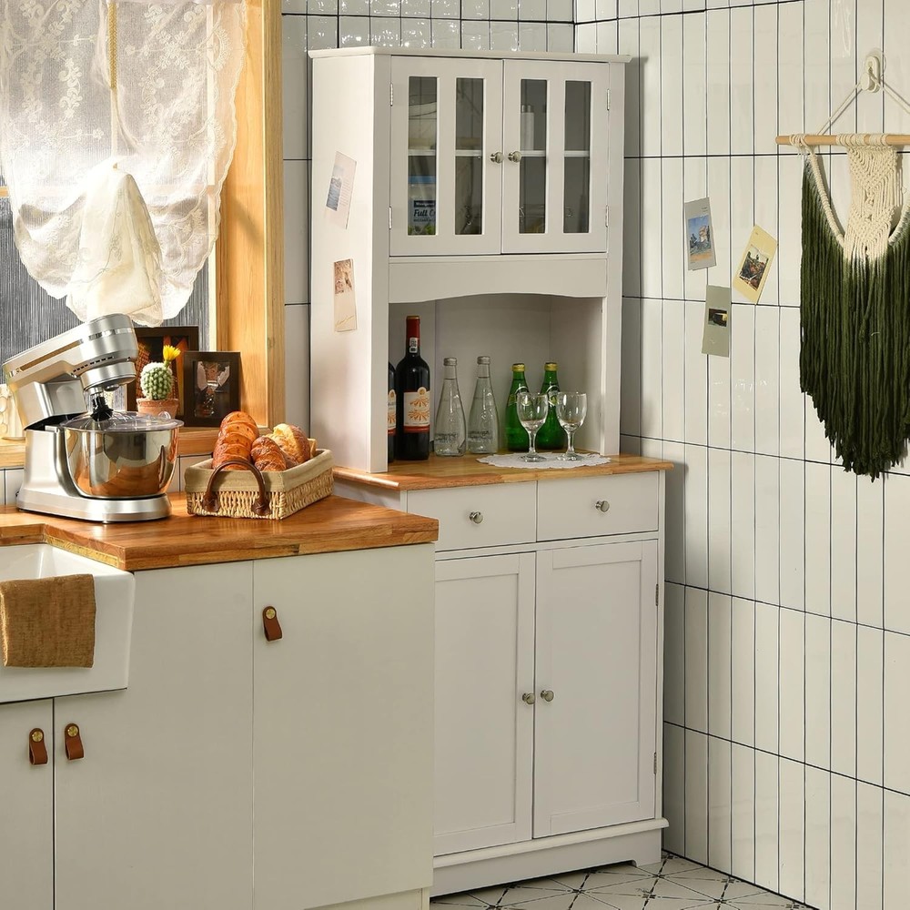 Kitchen Hutch Cabinet, Kitchen Cabinet with Framed Tempered Glass Doors, Flat Countertop and 2 Drawers, Kitchen Pantry Storage Cabinet with Adjustable Shelves, 27 x 16 x 67 inches (White) Product Description About this item - Let Me Stay in Your Kitchen - Nice to meet you here and let me introduce myself. My name is kitchen cabinet and my mission is to get your kitchen well organized by offering you with ample storage space! As can tell from the pictures left that I am not only decent in appearance but also function well. Would you give me a chance to stay in your kitchen? - Various Storage Space - This pantry cabinet gives you sufficient storage space to store multiple kitchen utensils and make them to be easily located when you need them. The flat rubber wood countertop could be used to place your microwave oven. The upper cabinet with tempered glass doors and the lower cabinet offer extra storage space for kitchenware and dinnerware. - Materials Self-statement - The majority of this kitchen hutch cabinet is made of P2 MDF, making it extra solid for daily use. The surface is waterproof for easy maintenance. The rubber wood countertop has great heat resistance, allowing you to prepare some food there. For extra stability, the kitchen hutch could be attached to the wall firmly with included expansion bolts. - Smart Design - 1. Adjustable Shelf: Both of the two shelves inside the two cabinets are adjustable in three positions for flexible storage. The distance between each position varies respectively that 1.5 inches in the upper cabinet while 2.5 inches in the lower large cabinet. 2. For better using the microwave oven on the countertop, we’ve left a hole to let the cables go through on the back panel. Our buffet cabinet would just serve its purpose well thanks to the smart details. - What Cares - Your 100% satisfaction means a lot to us and we will exert great effort to make things simple for you. Should you have any problem with this kitchen pantry storage cabinet, just feel free to contact us and we would be glad to offer you with feasible solution to make it settled.