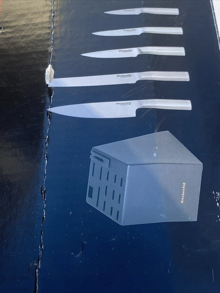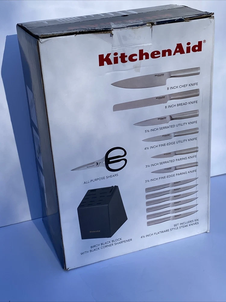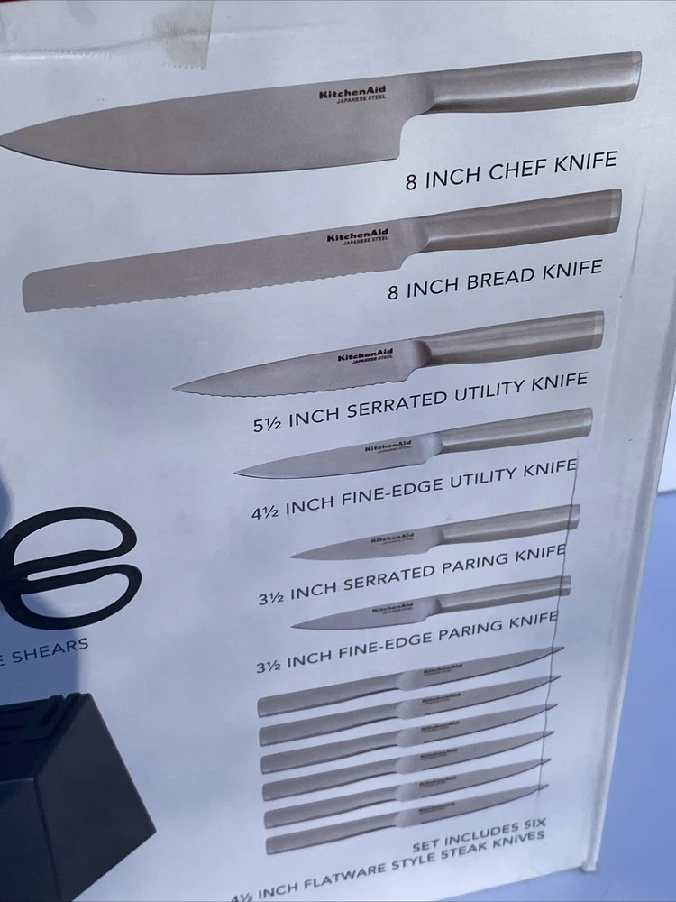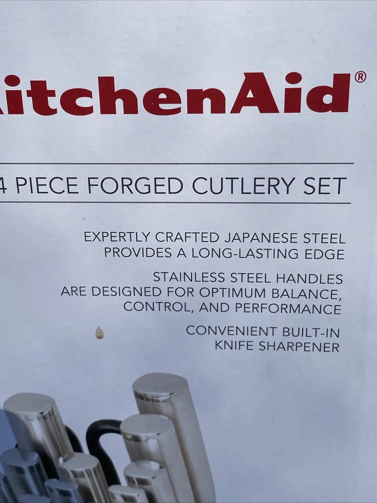 The KitchenAid 14 Piece Forged Cutlery Japanese Steel Knife Set is a high-quality set that includes 11 items in a stainless steel block with a sharpener. The knives are made of durable stainless steel, ideal for cutting vegetables, fruit, cheese, and meat. This set is designed with a modern stainless steel handle and is perfect for any kitchen.