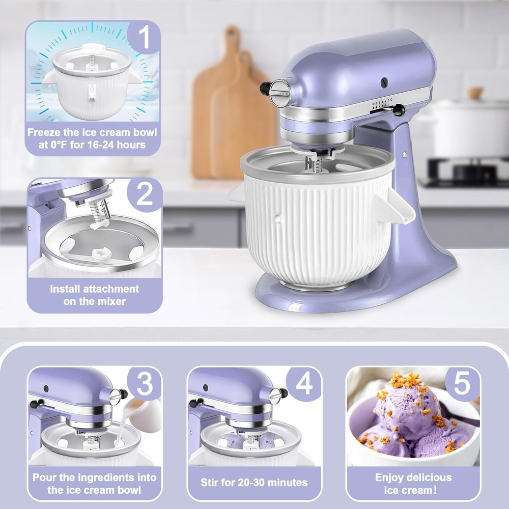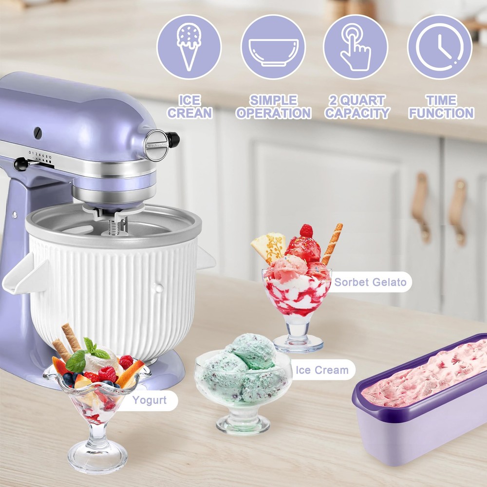 Indulge in the joy of homemade ice cream gelato maker with our exclusive ice cream maker attachment, designed specifically for Kitchenaid 4.5/5 Quart, 6 Quart, and larger Quart mixers. With kitchen aid ice cream attachment for kitchenaid stand mixer empowers you to create your own unique flavors, from indulgent chocolate to fruity freshness. For kitchen aid ice cream maker attachment for stand mixer unique dual-interface design allows easy switching between different mixer models. Simply pre-freeze the bowl, toss in your ingredients, and in just half an hour, you’ll be able to savor your homemade ice cream with a creamy texture and rich flavor. Perfect as a gift for any Kitchenaid fan, this icecream maker simplifies the ice cream making process, allowing you to whip up delicious treats in no time. Whether for a family reunion or a casual get-together, this ice cream maker attachment is your ultimate culinary companion. [Delight for Ice Cream Enthusiasts] This ice cream maker for kitchen aid accessories and attachments with 2 Ice Cream Containers for Homemade Ice Cream, exclusively designed for Kitchenaid 4.5/5 Quart, 6 Quart, and Larger Quart mixers, sets itself apart with unmatched compatibility. For the ultimate ice cream maker aficionado, it meets every culinary requirement with precision. Embark on a journey of sheer delight, crafting velvety and delectable ice cream with absolute ease [Experience the Joy of Homemade Ice Cream] With advanced freezing technology,simply place the bowl in the freezer for 16-24 hours,add your favorite ingredients,and start the mixer. In just 20-30 minutes,you can make up to 2.0 quarts of soft-serve ice cream, gelato,or sorbet with a creamy texture and rich flavor.The large capacity allows you to create enough delicious desserts to share with family and friends.Enjoy quick and easy ice cream making with 2 Ice Cream Containers for Homemade Ice Cream [Versatility of Ice Cream Maker] Not just for gelato,for kitchenaid ice cream maker attachment allows you to create a variety of frozen treats like slushies and icy desserts.Experiment with different flavors to surprise and delight your family and friends.Whether you’re at home or in a professional kitchen,for kitchen aid ice cream attachment meets all your frozen dessert needs.For best results,start the mixer before pouring the batter into the freezer bowl to avoid premature freezing [Premium Quality Materials] Experience premium quality with kitchenaid ice cream maker attachment, crafted from food-grade materials to ensure safety and pure flavor.The bowl features A and B ports,with Port A fitting 4.5QT mixers and Port B fitting larger mixers.Whether you’re at home or in a professional kitchen,this ice cream attachment for kitchenaid meets your needs with ease.Enjoy delicious ice cream while protecting your health with this reliable and high-quality tool [Enjoy Easy Cleaning & Quality Support] Dasher and drive assembly are dishwasher-safe on the top rack,while the freezer bowl should be hand-washed with mild water and detergent,then thoroughly dried before freezing.We offer 1-year-warranty for peace of mind for ice cream maker for kitchenaid mixer.If you encounter any quality issues,feel free to contact us for assistance.For kitchen aid ice cream attachment also a great-gifts,ensuring satisfaction and support for all your ice cream-making needs
