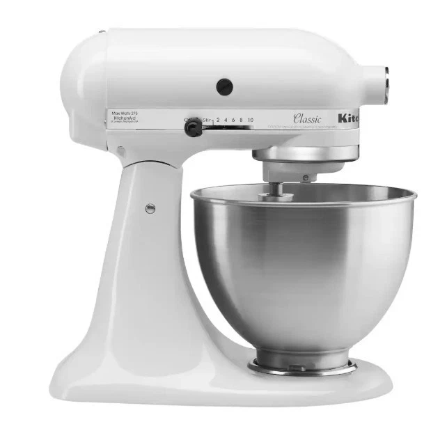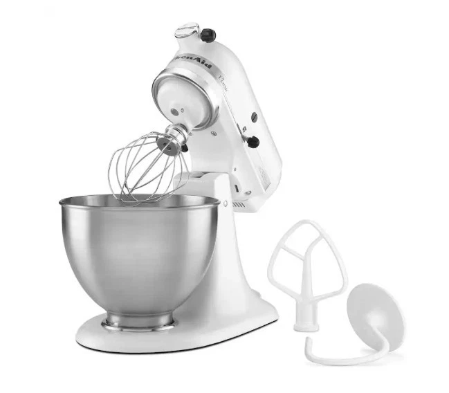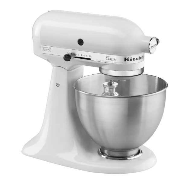 KitchenAid - Classic Series 4.5 Quart Tilt-Head Stand Mixer - K45SSWH - White Product Description Whether you’re preparing large batches of your favorite chocolate chip cookies (up to 8 dozen) or shredding chicken for Taco Tuesday with friends and family, the KitchenAid Classic Series 4.5 Quart Tilt-Head Stand Mixer is designed to handle it all. Built with long-lasting durability in mind, this tilt-head mixer offers 10 speed settings to gently knead dough, thoroughly mix ingredients, and whip with precision for a wide range of recipes. Available in multiple colors, it easily complements your kitchen décor and personal style. Expand your creativity in the kitchen with over 10 optional hub-powered attachments (sold separately), allowing you to do everything from grinding meat and making fresh pasta to creating veggie noodles, ice cream, and more. Based on using the flat beater; 28g dough per cookie. Attachments sold separately. Durable Construction for Consistent Results Crafted with a solid metal body and engineered for longevity, this mixer features 59 contact points around the bowl to ensure thorough and even mixing every time. 4.5 Quart Stainless Steel Bowl The stainless steel bowl provides enough capacity to mix up to 8 dozen cookies in a single batch. It is dishwasher safe for easy cleanup. Using the flat beater; 28g dough per cookie. Convenient Tilt-Head Design The tilt-head mechanism allows easy access to the bowl for adding ingredients and attaching accessories. The head locks securely in place during operation for stable mixing. 10 Speed Options for Versatile Tasks From low-speed stirring to higher speeds for whipping cream (up to speed 8), the mixer delivers consistent performance across a wide variety of cooking and baking needs. Attachment-Ready Versatility Compatible with 10+ hub-powered attachments, this stand mixer can be transformed into a multi-functional kitchen tool for making pasta, burgers, veggie spirals, ice cream, and more. Attachments sold separately. What’s Included KitchenAid Classic K45SSOB Stand Mixer Wire Whip Dough Hook Flat Beater Manuals & Guides User Manual