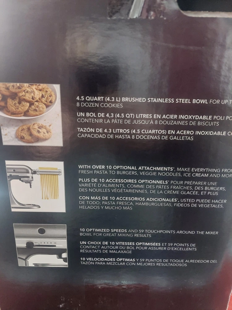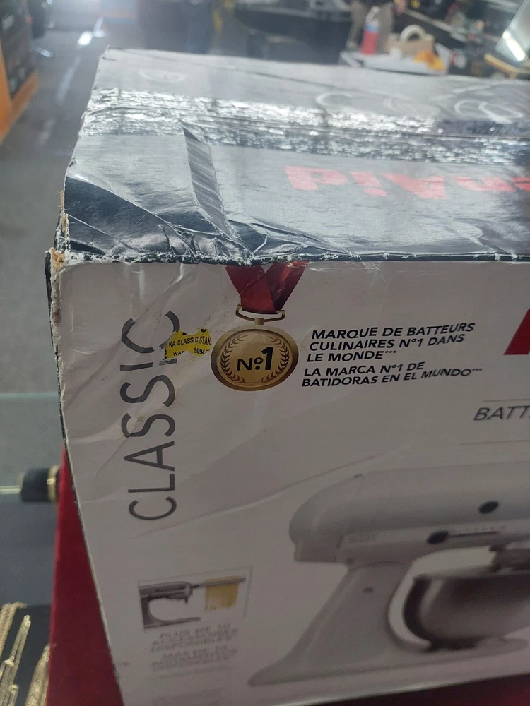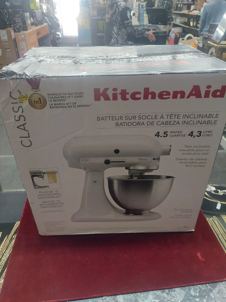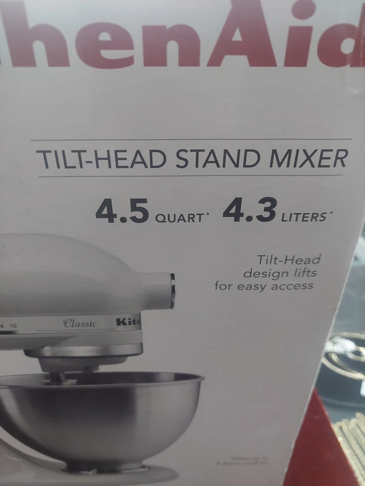 The KitchenAid Tilt-Head Stand Mixer K45SSWH is brand new in the box, there is some minor damage to the box. It comes as shown in the pictures provided. NOTICE WE ONLY SHIP TO THE CONTINENTAL U.S.A.