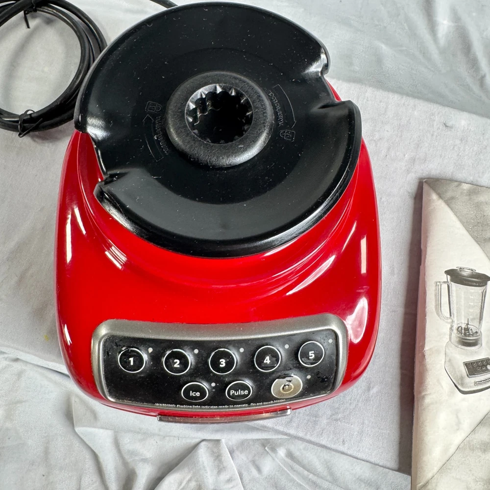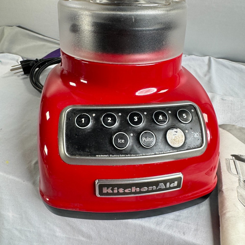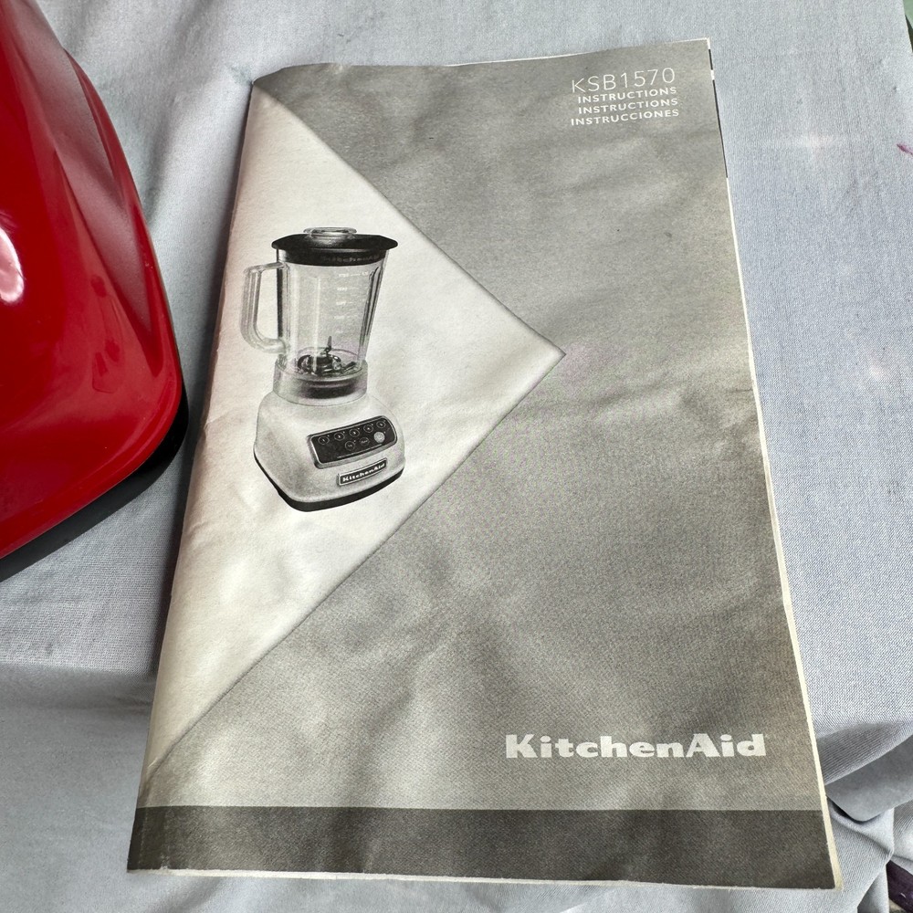 KitchenAid 5-Speed Classic Blender in Empire Red . Model: KSB1570ER. Tested and working fine. Includes: Motor base 56 oz / 1.75 L blending jar with blade Lid Original instruction manual (as shown) Condition: Pre-owned with light cosmetic wear from normal use. Please review all photos for exact condition and included items.