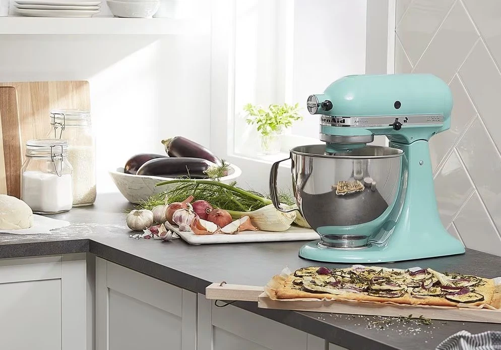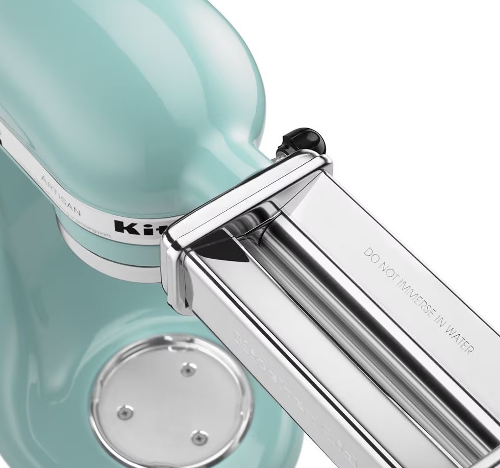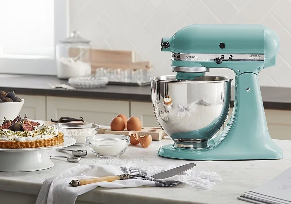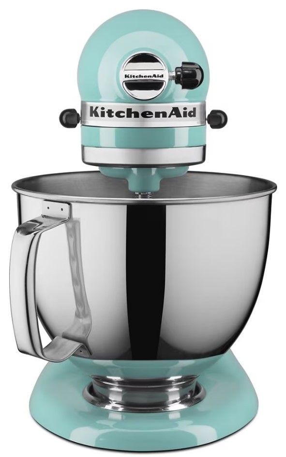 KitchenAid Artisan Series 5-Quart Tilt-Head Stand Mixer – Aqua Sky (Model KSM150PSAQ) The KitchenAid Artisan Series 5-Quart Tilt-Head Stand Mixer in beautiful Aqua Sky is a perfect blend of iconic design, professional performance, and everyday versatility. Built with durable all-metal construction and a powerful direct-drive motor, it provides consistent power across 10 precise speeds—from gentle stirring to high-speed whipping—making it ideal for mixing batters, kneading dough, whipping cream, shredding chicken, or preparing large batches of cookies (up to 9 dozen per bowl using 28g dough with the flat beater). The spacious 5-quart polished stainless steel bowl features a comfortable handle for easy lifting and pouring, and it is dishwasher-safe for quick cleanup. The tilt-head design lifts smoothly to allow easy access for adding ingredients or attaching accessories, then locks securely for stable, hands-free mixing. The front-mounted power hub supports over 10 optional attachments (sold separately), including pasta makers, food grinders, spiralizers, ice cream makers, and vegetable slicers, turning it into a complete kitchen system. Included accessories provide immediate versatility: a coated flat beater for mixing batters and frostings, a coated dough hook for kneading yeast doughs, and a 6-wire whip for incorporating air into whipped cream, meringues, and soufflés. The striking Aqua Sky finish adds a fresh, modern pop of color to any countertop while resisting fingerprints and wear. With 59 touchpoints for thorough mixing and KitchenAid’s legendary reliability, this mixer is engineered for lifelong use and is a favorite among home bakers, culinary enthusiasts, and small business owners who value quality, precision, and style in their kitchen tools.