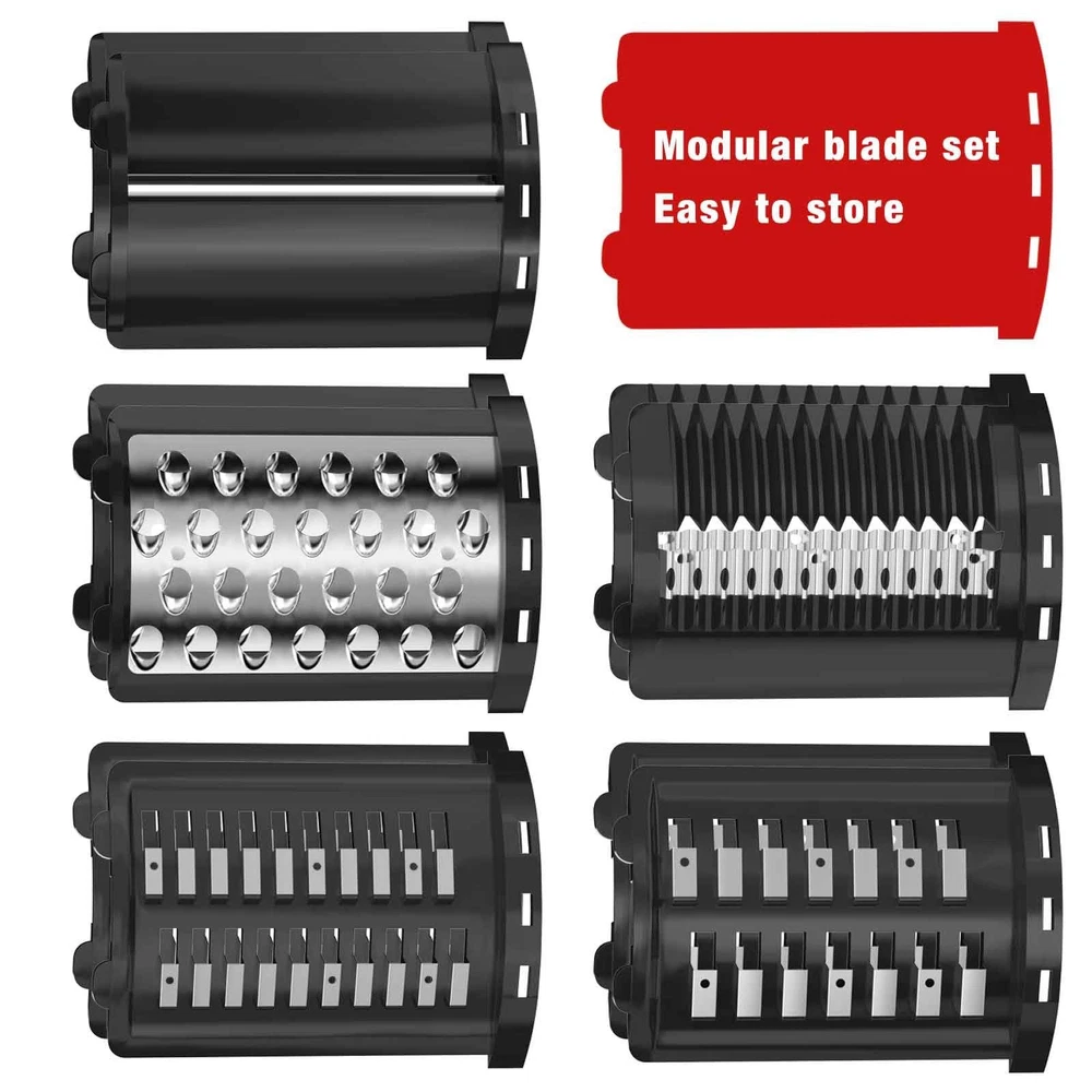 Easily add freshly sliced or shredded ingredients to all of your favorite salads, entrees, sides and more. 360 degree blades, 5 blades satisfied your different needs Slicing blade: Great for slicing cucumber, zucchini, onions, radish; Coarse Shredding blade: Great for cheese, carrot, potato, beetroot, shred root vegetables and fruit for soups and pies; Fine Shredding blade: For root vegetables and green vegetables to be consumed raw, to shred almonds and nuts for baking. compatible with kitchenaid stand mixer attachments kitchen aid kitchenaid mixer accessories kitchenaid attachments for kitchenaid shredder cheese grater attachment food processor kitchen aid stand mixer attachments accessories parts [Fits all Kitchenaid mixers] The high-quality slicer shredder attachment fits all KitchenAid stand mixer, even for the Cuisinart Stand Mixer SM-50, SM-50BC, and SM-50R. Transform your stand mixer into a versatile kitchen appliance that can help you tackle even more culinary tasks, less effort on food prep job (Not belong to the KitchenAid) [5 stainless steel blades]: Slicing blade: Suitable for slicing shaped foods (cucumber slices, etc.). Cutting cone (grater): Suitable for some fragmentary or hard foods (such as cheese, nuts, etc.). Wave stripe blade: Suitable for wave-shaped food (wavy potato chips, etc.). 5mm shredder blade: suitable for thicker shredded food (thick shredder, onion shreds, etc.). 3mm shredder blade: suitable for thin shreds of food (thin shreds, shredded radish, shredded potatoes, etc.). [Material]: This Kitchen Aid stand mixer slicer chopper attachment is BPA-free material, the blade is designed with stainless steel and made of upgraded durable material, making the blade stronger and not easy to deform. Humanized design: This one for kitchen aid accessories. Considering that it is difficult to clean the inside of the traditional roller blade during cleaning, the disassembly design allows the blade to be detached for cleaning. This avoids residual food on the blade. And it can also be cleaned according to the Use different blades to create food according to your own preferences. [Easy to store]: The traditional chopper and slicer drum is an integrated design and takes up a lot of storage space for storage. The detachable blade design takes up little storage space. Say goodbye to many independent salad machines or food processing equipment.