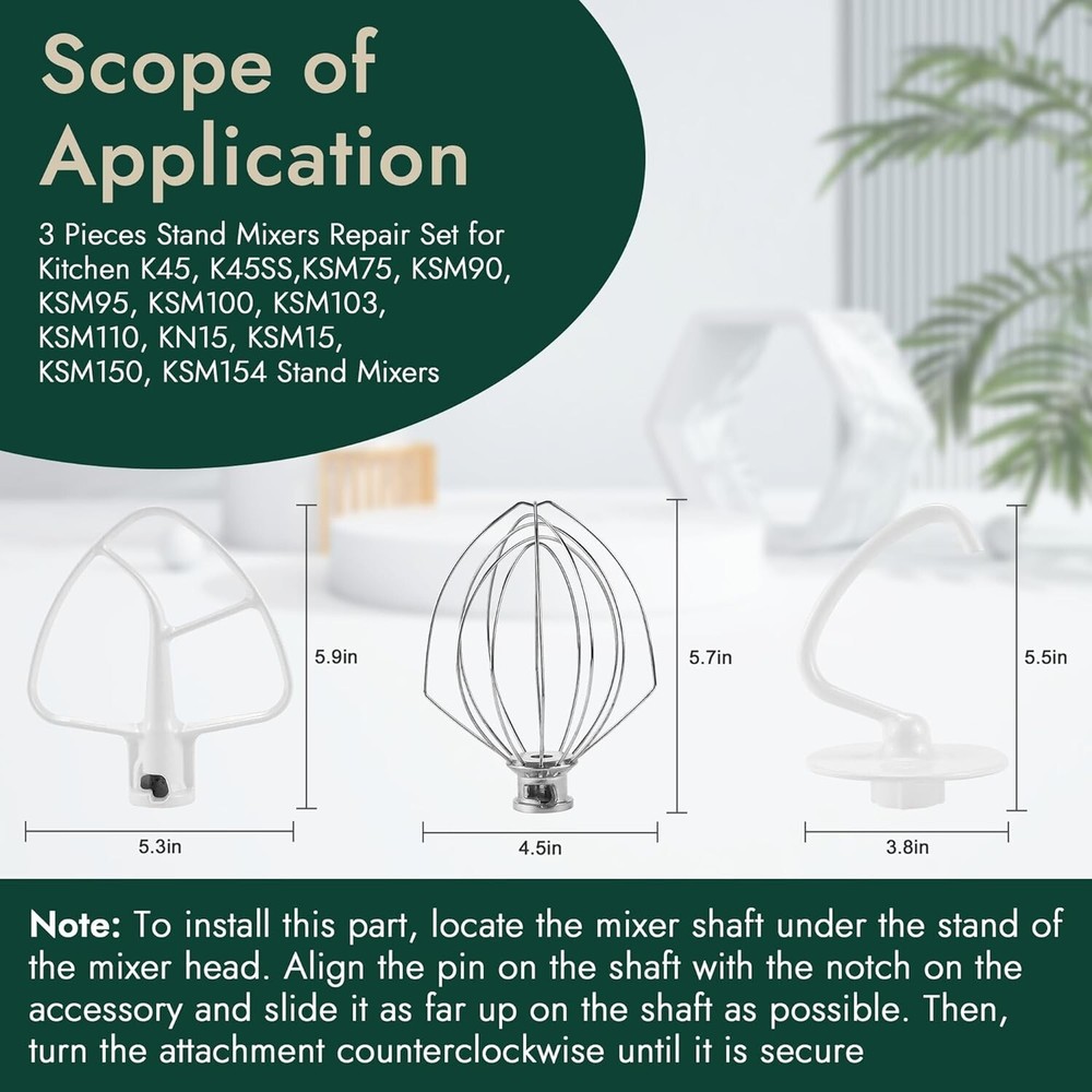 Kitchen aid Mixer Attachments Including K5AB Coated Flat Beater&K5ADH Dough Hook Capacity 4.5 Liters Controls Type Knob Material Type: Aluminum ππ‘ππ'π¬ π’π§ ππ‘π ππ¨π±: 3 piece set of stand mixers,These replacement parts are made of aluminum, stainless steel, manufacturer tested anti-stick nylon coating for long life.1 x K45DH Coated Anti-stick dough hook, 1 x K45WW wire whip and 1 x K45B coated Anti-stickflat beater. For 4.5πΈ Kitchen Tilt-Head Stand Mixers. Not fit Bowl-Lift Stand Mixers ππ’π₯π-ππππ 6-ππ’π«π ππ‘π’π© | Wire Whip's 6-wire whip π45ππ quickly incorporates air into ingredients, creating fluffy whipped cream, perfectly cooked frosting and cakes with whipped egg whites. Fits models KSM155GB, KSM152PS, KSM150PS, KSM95, KSM75 and K45SS. Replace WP9704329, 4162165, 416992, 4176070, 9704329, 9706446, 904973, PS11746928, AP6013701, EAP6013701