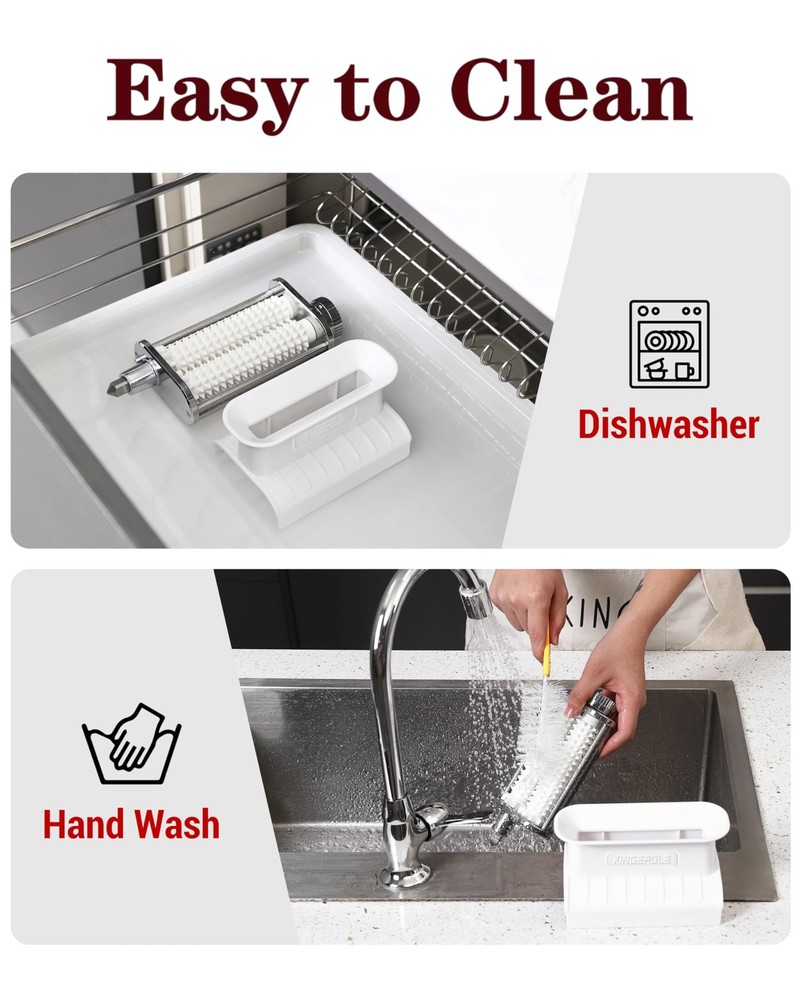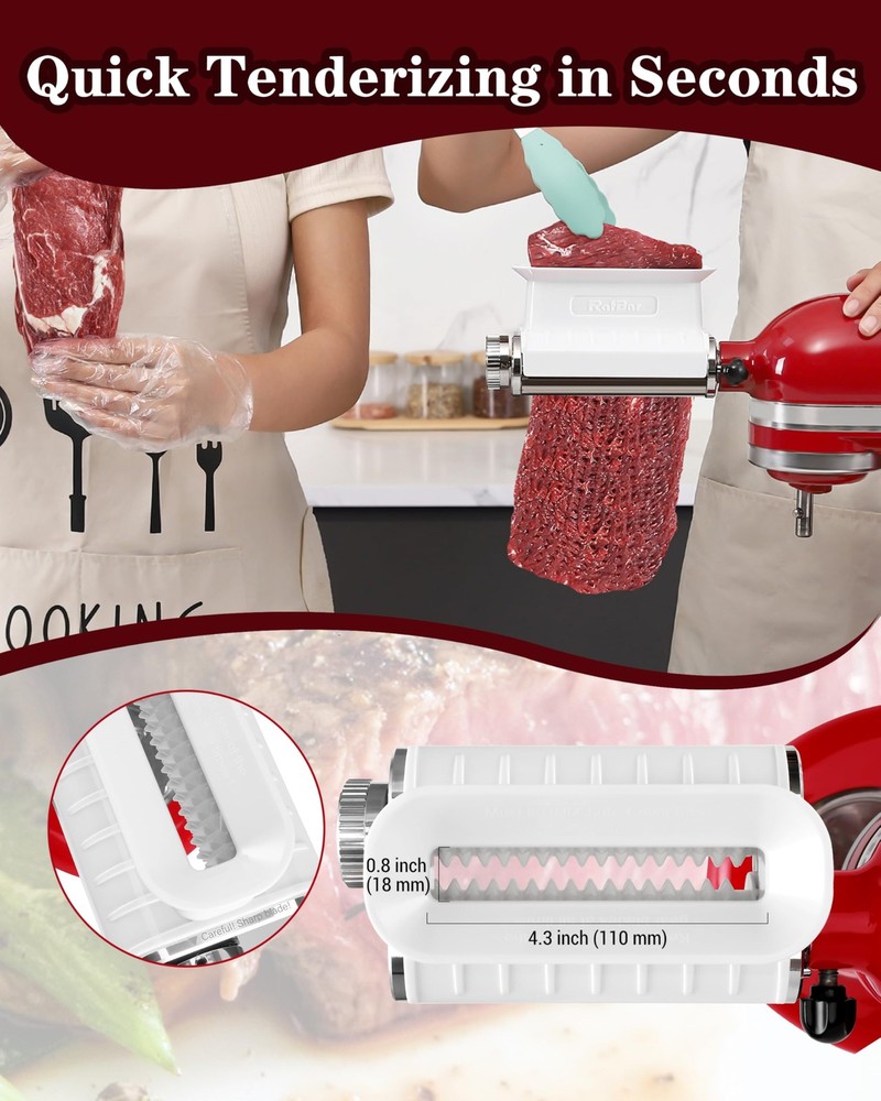 Transform your KitchenAid stand mixer into a powerful meat tenderizer with the Meat Tenderizer Attachment. This useful tool is designed to help you achieve tender, flavorful meat quickly and effortlessly, making it a must-have for home cooks who love preparing delicious, perfectly textured meats. Efficient Tenderizing with Unique Roller Mechanism The meat tenderizer attachment for kitchenaid stand mixers uses a rolling mechanism to process meat between durable rollers with raised, serrated surfaces. Unlike traditional meat hammers, which can take minutes per cut, this attachment works in seconds, producing even results across each piece for ideal flavor and tenderness. Premium Materials and Compact Design Constructed with a robust stainless steel frame and high-quality plastic rollers, the tenderizer machine attachment offers both durability and lightweight ease of use. Designed to handle various meat, it delivers consistent performance, time after time, making it a reliable choice for your kitchen. Key Features Three Adjustable Thickness Settings: Customize the texture and thickness of your meat with an easy-to-use adjustable knob, offering three different settings for tailored results on various cuts. Fast and Efficient: Designed to tenderize meat in seconds, this attachment is ideal for anyone looking to prepare multiple pieces quickly, making it perfect for parties, BBQs, and family meals. Easy Installation: Specifically engineered to fit KitchenAid stand mixers, the attachment snaps on easily, turning your mixer into an efficient meat-tenderizing machine ready to handle beef, pork, lamb, and more. Usage Tips For best results, avoid placing frozen or unthawed meat in the rollers, as this may lead to uneven tenderization and a less desirable texture. Instead, use with fresh or fully thawed meat to ensure optimal tenderness and consistency. Cleaning Instructions The Meat Tenderizer Attachment is dishwasher safe, making it easy to clean. Simply disassemble and place in the dishwasher, or wash by hand with mild soap and warm water. Allow all parts to dry thoroughly before reassembling. Elevate your home cooking with the Meat Tenderizer Attachment, designed to bring tender, restaurant-quality meats to your table in a fraction of the time. ๐๐ผ๐บ๐ฝ๐ฎ๐๐ถ๐ฏ๐น๐ฒ ๐๐ถ๐๐ต ๐๐ถ๐๐ฐ๐ต๐ฒ๐ป๐๐ถ๐ฑ ๐ ๐ถ๐ ๐ฒ๐ฟ๐: This tenderizer attachment is easily attaches to KitchenAid mixers and Cuisinart stand mixers, converting them into a powerful meat tenderizing machine for home use. Yet this product is not belong to KitchenAid and Cuisinart company. ๐ฏ-๐ง๐ต๐ถ๐ฐ๐ธ๐ป๐ฒ๐๐ ๐ฆ๐ฒ๐๐๐ถ๐ป๐ด๐: Customize tenderness with 3 adjustable knob, allowing to customize meat thickness and texture to your liking for perfect results every time, perfect for all types of red meat. ๐ฉ๐ฒ๐ฟ๐๐ฎ๐๐ถ๐น๐ฒ ๐ ๐ฒ๐ฎ๐ ๐ง๐ฒ๐ป๐ฑ๐ฒ๐ฟ๐ถ๐๐ฒ๐ฟ ๐๐๐๐ฎ๐ฐ๐ต๐บ๐ฒ๐ป๐: Effectively handles various meats, including beef, pork, lamb, and more, making it ideal for for tenderizing various meats, improving texture, and enhancing flavor for a more enjoyable meal. Note: Not suitable for chicken, fish, or other white meats as it may tear or shred them during tenderizing. ๐ง๐ถ๐บ๐ฒ-๐ฆ๐ฎ๐๐ถ๐ป๐ด & ๐๐ณ๐ณ๐ถ๐ฐ๐ถ๐ฒ๐ป๐: More effective than hand pounding, our meat tenderizer attachment for kitchenaid stand mixer saves time and effort, making it ideal for gatherings, BBQs, and post-hunt meat preparation. ๐๐ถ๐ด๐ต-๐ค๐๐ฎ๐น๐ถ๐๐ ๐ ๐ฎ๐๐ฒ๐ฟ๐ถ๐ฎ๐น๐: This tenderizer attachment for kitchen aid Made with a sturdy stainless steel frame and durable plastic rollers, this attachment is built to last and is dishwasher safe for easy cleanup.