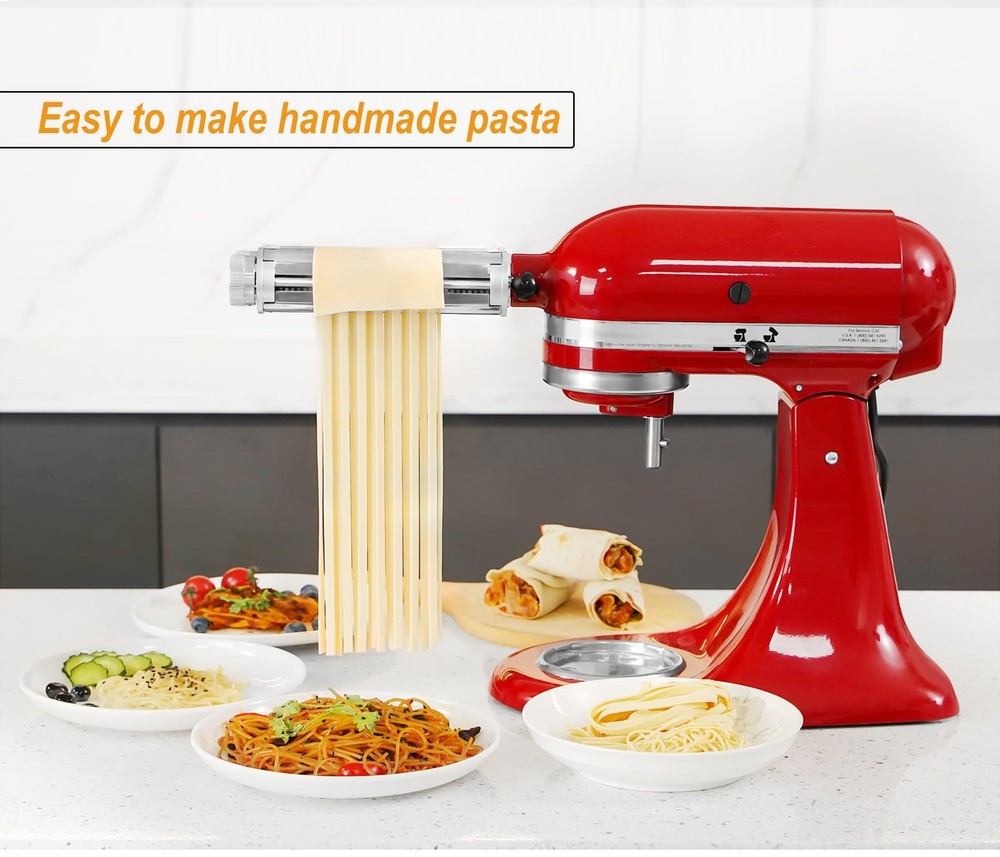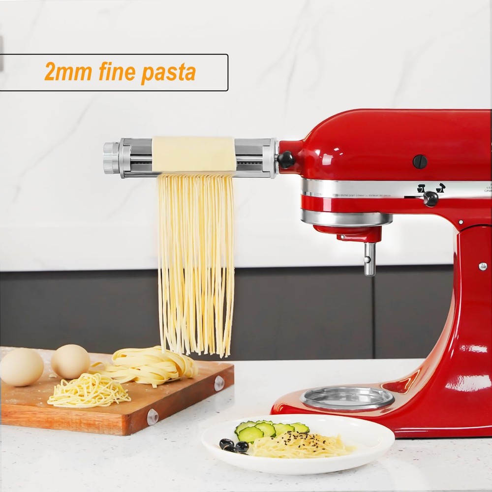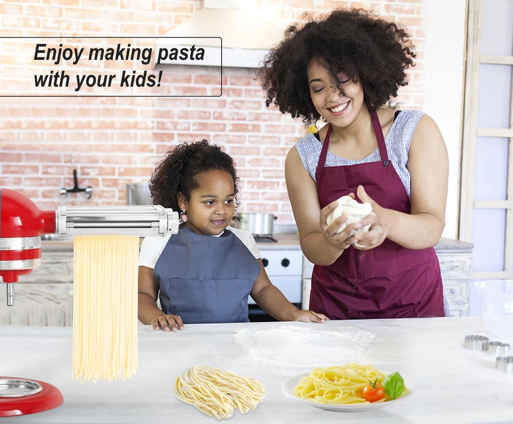 Pasta Roller & Cutter Attachments, fits for Kitchen-Aid Stand Mixers, to work as Professional Pasta Maker. Make fresh pasta in minutes! Saving Kitchen space : 3 in 1 set design, 1 rolling shaft, 1 cutting shaft to control Spaghetti Cutter & Fettuccine Cutter Easy to use ,Easily attach to your stand mixer,then make different pasta: ~ Pasta Roller easily roll 5.7-inch sheets of pasta with 8 thickness settings,adjust to your desired sheet thickness. Help you make different thickness of pasta sheet, for Ravioli, Tortellini , Agnolotti, Dumplings, Empanada, Lasagna, Noodles... ~ Spaghetti Cutter cut pasta sheets into classic Spaghetti noodles, tagliolini ~ Fettuccine Cutter Cuts pasta sheets into hearty Fettuccine noodles, linguini ~ Cleaning Brush included help clean attachments Food Grade Metal Construction for durable long lasting performance and healthier pasta Compatibility Our attachment specially designed for KitchenAid Stand Mixer, all household models. Also fit Cuisinart stand mixer only models SM-50, SM-50BC, SM-50R. Clean & Maintenance : Not Dishwasher Safe! To protect product specially the precise gears inside, Do not Wash or Immerse in Water ! Also Not put into dishwasher! Clean by hand or cleaning brush, or dry soft cloth. Store them in a dry place at room temperature. Any question on product use, feel free to contact us! Fit Properly for Kitchen Aid Stand Mixer: pasta attachment set for kitchenaid stand mixer, as professional pasta maker appliance, easy to attach and use [Note: This attachment NOT Created or Sold by Kitchenaid Pro-Grade Stainless Steel Pasta Maker: All-metal construction with stainless steel housing, rollers, and cutter shaft for lifelong durability. Engineered for ultra-smooth dough rolling and razor-sharp cutting precision, powerful. Built to convenience for you Highly Integrated: The pasta attachment integrates 3 functions, Including Pasta Roller, Fettuccine Cutter and Spaghetti Cutter, 3 in 1 set design for saving money and Kitchen space Easy-use Knob let Pasta Roller Attachment rolls 5.7-inch(144mm) sheets of pasta with 8 thickness settings to make different thickness pasta sheets for various recipes Lightweight Design:Spaghetti Cutter and Fettuccine Cutter are controlled by 1 setting knob, 2mm Setting for Spaghetti Cutter while 6mm for Fettuccine Cutter, newly design in the market. This makes unit only 2.62LBS,definitely convenient for storage and save power from Kitchenaid mixer Enjoy Past Time More Often: The multi-use attachment help make different pasta easily, not only bring healthy and fresh pasta into our home, but also gives more party chances that all family members can get together to prepare dough, make pasta and share delicious dishes