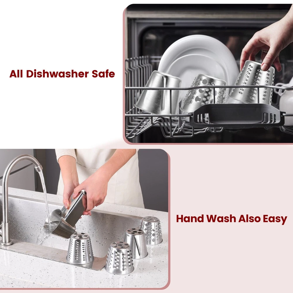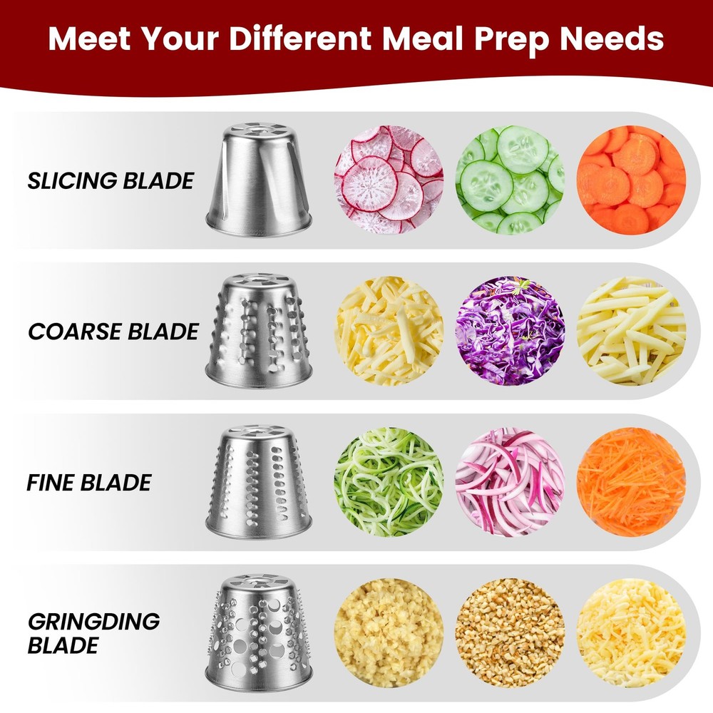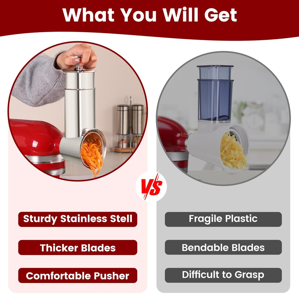 "Food Shredder Attachment for KitchenAid Mixers Introducing the Food Slicer Attachment, the ultimate kitchen companion for effortless and efficient food preparation! This high-quality attachment is designed to fit perfectly with your KitchenAid stand mixer, transforming it into a versatile grating machine that will revolutionize the way you cook. Save Time and Increase Efficiency: With its large feed opening and efficient design, you can grate ingredients in a fraction of the time it would take with manual methods. This allows you to focus on other aspects of meal preparation and spend more time enjoying your cooking. Enhance Your Culinary Creativity: Four different function blades to meet your different meal prep needs in the kitchen. Experiment with new recipes, add professional-looking garnishes to your dishes, and impress your family and friends with your culinary skills. Promote Healthy Eating: Slicing fresh vegetables and fruits is a great way to incorporate more nutrients into your meals. This kitchenaid shredder attachment makes it easy and convenient to prepare healthy ingredients, encouraging you to make healthier food choices. Compatible with Most KitchenAid Mixers: It is compatible with a wide range of KitchenAid stand mixer models,also compatible with Cuisinart stand mixer SM-50 series.Expand the capabilities of your stand mixer to make it a more powerful professional tool. Upgrade your kitchen aid mixers with the Cheese Grater Attachment and take your food preparation to the next level. Whether you're a professional chef or a home cook, this attachment will become an indispensable tool in your kitchen, helping you create delicious and beautifully presented dishes with ease. Order yours today and experience the convenience and versatility of this amazing slicer shredder accessory! Wide Compatibility: It is compatible with most Kitchenaid stand mixer models(include Cuisinart stand mixer SM-50 series), making it a versatile addition to your kitchen arsenal. Non-shaking. No matter which Kitchenaid mixer you own, this attachment is likely to fit, allowing you to make the most of your existing appliance.[NOTE: these attachments not created or sold by Kitchenaid All Stainless Steel Design: Crafted from high-quality materials, the cheese grater attachment is made of Food-grade Stainless steel, Stronger and more durable than plastic. rust- and corrosion-resistant, ensuring lasting performance and consistent grating results. Easy to Use and Dishwasher Safe: Using this attachment is a breeze. Simply attach it to your KitchenAid mixer, and you're ready to start grating, quick-change blades let you switch between grating styles seamlessly. All parts are dishwasher safe for fast cleanup. Versatile Blades for Different Needs: Equipped with 4 interchangeable stainless steel blades, this slicer attachment offers a wide range of shredding functions. Create thin zucchini slices for salads, colorful carrot shreds, hearty cabbage shreds for coleslaw, and finely grated Cheese for baked goods. Time-Saving Efficiency: Say goodbye to the tedious task of manual shredding. This vegetable shredder enables you to slice large quantities of food in a fraction of the time. Slice a whole cabbage in 30 seconds or grate cheese for 10 pizzas in minutes. Transform bulky veggies into delicate garnishes effortlessly!