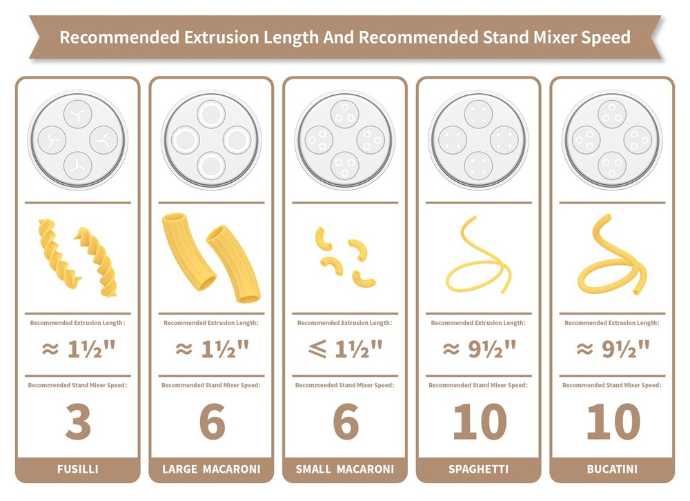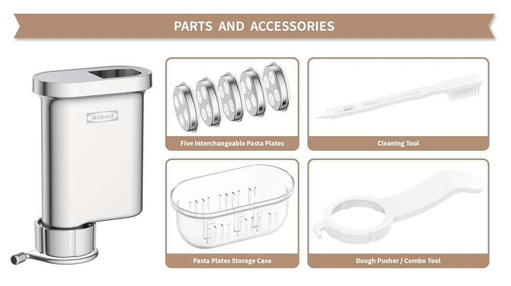 GOURMET PASTA PRESS Taking your pasta game to the next level by using the Kitchenaid pasta attachment, a culinary powerhouse that effortlessly manufactures 5 tantalizing pasta varieties: spaghetti, bucatini, fusilli, large and small macaroni, this versatile attachment guarantees that you will never be short of delicious pasta dishes. WHAT IS INCLUDED IN THE PACKAGE? 1* Pasta press 1* Dough pusher 5* Interchangeable pasta discs 1* Cleaning tool EXCEPTIONAL METAL CONSTRUCTION: Our pasta press is built from high-grade alloy metal material, providing you with a longer-lasting, more durable, and more reliable pasta press than other similar plastic alternatives that may crack with time. SIX QUICK-CHANGE VERSATILE DISCS: Using the pasta plates, you can make fresh spaghetti, bucatini, fusilli, large macaroni, or small macaroni. This is an ideal pasta maker for those who want to prepare a wide range of pasta dishes quickly and easily. EASY TO CLEAN AND STORE: A compact mold storage case is included, allowing you to neatly arrange and access your pasta plates. The included cleaning tool makes it easy to remove dough pieces from the pasta press and discs. The part connected to the main unit should only be wiped with a damp cloth. TASTE THE LOVE IN EVERY BITE: Designed to fit all Kitchenaid mixers, the Kitchenaid Pasta Maker Attachment lets you make fresh pasta from scratch, and its built-in wire cutter lets you customize the length of your pasta for the perfect bite every time.