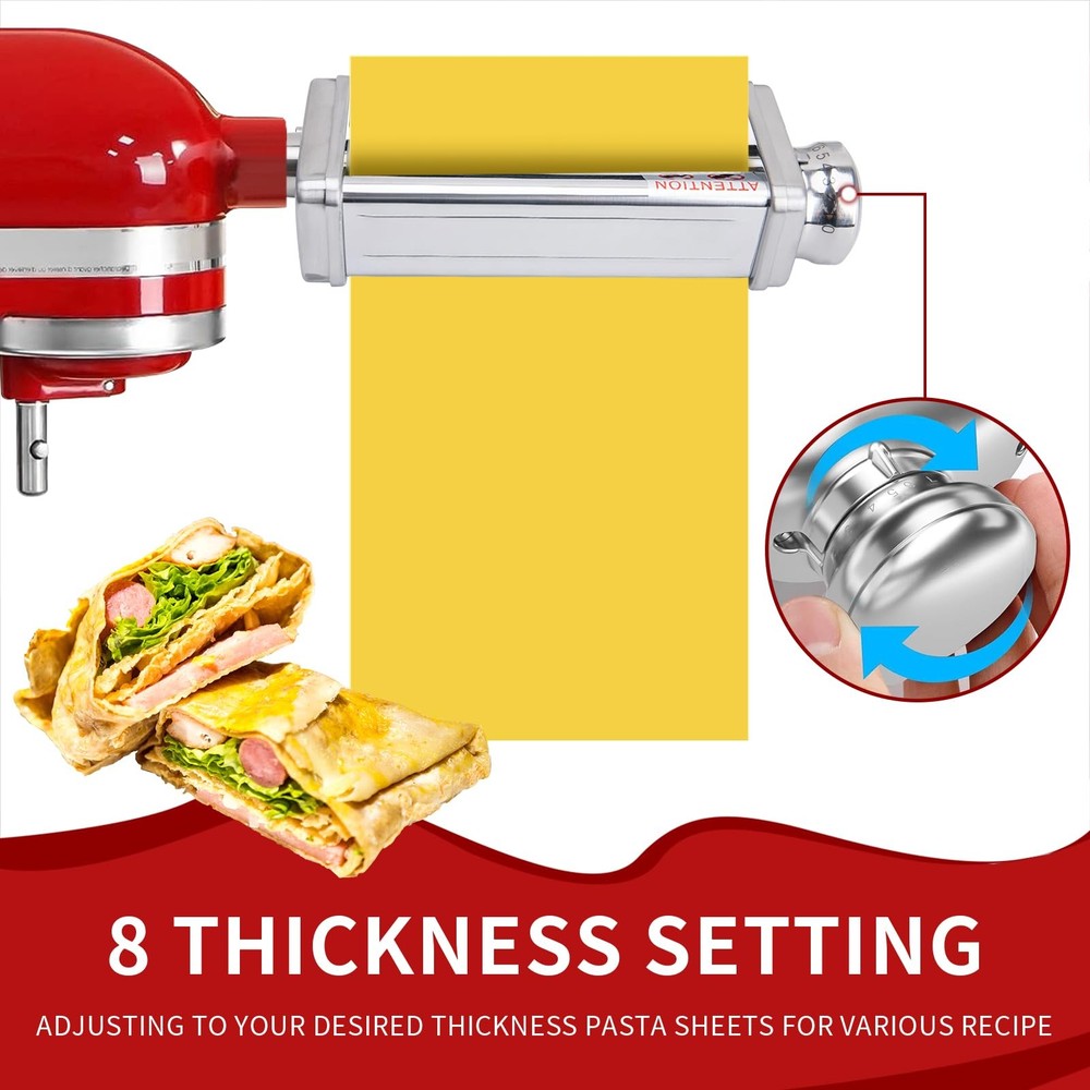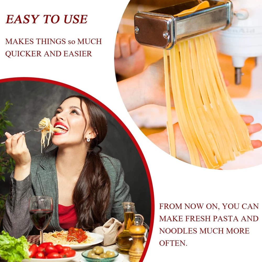 Pasta maker attachment are suitable for All KitchenAid stand mixers, made of 304 stainless steel, including pasta roller, spaghetti cutter and fettuccine cutter. You can enrich your own recipes: Ravioli, Melaleuca, Tortellini, Dumplings, Empanadas, Lasagna, Noodles and more delicious food. The food grade and sturdy stainless steel frame offers high stability and power for making pasta sheet, It's convenient for daily use! The pasta maker attachment set has an 8-gear adjustment knob from 0.4mm/0.016in to 2mm/0.08in to adjust the desired thinness of the pasta in order to change the texture and taste of your pasta. Special design, easy attach and operation, Homemade Fresh pasta noodles easily in minutes. This is a super convenient attachment and makes great pasta. Works great and comes with detailed instructions. Cleaning Tips: It can be washed by water, but don't soak in water long time, not dishwasher safe Cleaning Brush provided to easily remove bits of flour and pasta, you can also clean by dry soft cloth. The package includes: 3 Pieces Pasta maker attachments for KitchenAid stand mixers. Pasta Attachment for Kitchenaid Stand Mixer: This pasta attachment for kitchenaid mixer is specifically designed for all Kitchenaid stand mixer. This pasta attachment for kitchenaid stand mixer enables you to craft the healthiest and most delicious pasta directly in the comfort of your kitchen Food-Grade Pasta Maker Attachment: This food-grade pasta maker attachment for kitchenaid mixer is crafted from high-quality stainless steel, ensuring durability and efficiency. With low noise and superior performance compared to other 3-in-1 pasta maker attachments for kitchenaid stand mixers, it's the top choice for creating healthy, fresh pasta dishes Multi-Purpose Pasta Attachment for Kitchenaid Mixer: This multi-purpose pasta attachment for kitchenaid mixers includes a pasta roller, fettuccine cutter, and spaghetti cutter. Simply attach it to the power hub of any kitchenaid stand mixer to smoothly roll the dough and cut the pasta into spaghetti, fettuccine, and lasagna. It's the ideal choice for pasta maker attachment for kitchenaid pasta attachment Adjustable Pasta Maker Attachment: This adjustable pasta maker attachment rolls 5.5-inch sheets of dough with 8 thickness settings, ranging from 0.4 to 2 mm (0.016 to 0.08 in). The other two pasta cutters can cut pasta sheets into hearty fettuccine noodles, linguine, lasagna, and spaghetti, at widths of 1.6 or 6.3 mm (0.06 in or 0.25 in). It's a great pasta maker machine for your KitchenAid stand mixer, meeting various pasta making needs Easy to Use and Clean: Pasta maker attachment for kitchenaid mixer is easy to use and clean. Perfect for making angel hair pasta spaghetti, fettuccine, lasagna, dumpling skins and more, caters to all your pasta making needs. From now on, you can make fresh pasta and noodles much more often.(Clean tip: Not Dishwasher Safe! Clean the set with a brush or soft cloth by hand.) Worry-Free Shopping: Experience worry-free shopping with our pasta attachment for KitchenAid stand mixer. We provide excellent after-sales service, ensuring a hassle-free pasta-making experience. Add our pasta attachment for kitchenaid mixer to your kitchen tools and enjoy the satisfaction of homemade pasta