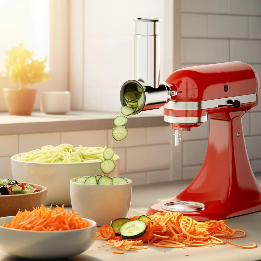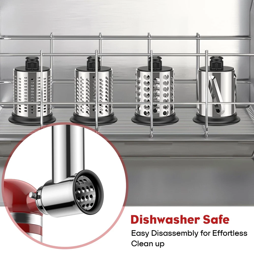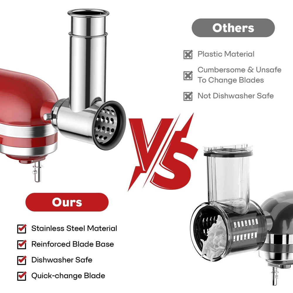 Stainless Steel Slicer Shredder Attachment for Kitchenaid Stand Mixer Fit for All Kitchenaid Stand Mixer: Our's for kitchenaid cheese grater attachment upgrade whole 304 stainless steel material, with 4 interchangeable blades, which can handle a variety of ingredients, such as cheese, vegetables, nuts, more safety and save time for use. Powerful Cutting with 4 Interchangeable Blades: The slicer shredder attachment for kitchenaid stand mixer, comes with 5mm Slicing Blade, 6mm Coarse Shredding Blade, 3mm Fine Shredding Blade, 2.5mm Grinding Powder Blade. Good Helper for Kitchen: For kitchen aid cheese grater attachment for kitchenaid stand mixer, perfect for grating cheese, radish, cucumber, carrot, potato, zucchini, cookie, chocolate, peanuts, almonds, ice, etc. for salad, pizza toppings, taco, smoothie and so on. ( Please use 8 speed for grating, and pressing force should be small, remember not to cut frozen food, all frozen items need to be thawed before cutting them) All Parts Dishwasher Safe: The whole slicer shredder attachment for kitchenaid stand mixer are made of 304 stainless steel material, stonger and durable than plastic, easy to clean with dishwasher, more safety! Best Choice: Our cheese grater attachment for kitchenaid stand mixer is perfect for family, friend, loved, we have cofidence with the quality control of kitchen aid accessories, if you have any questions, please Please do not hesitate to contact us.