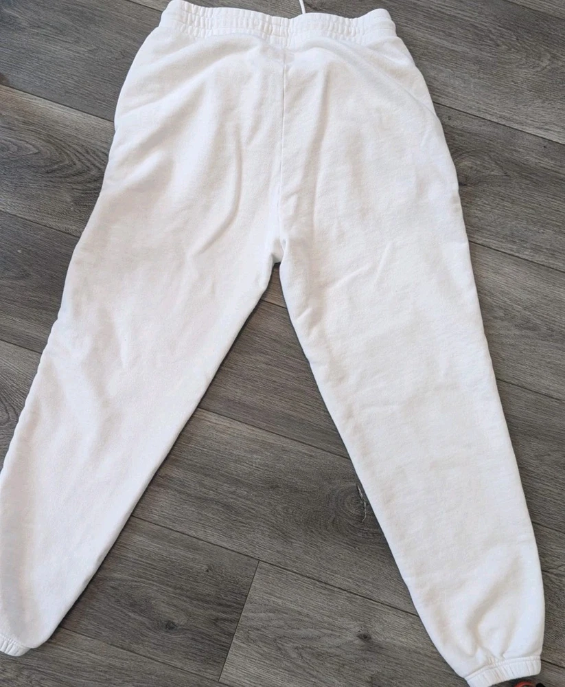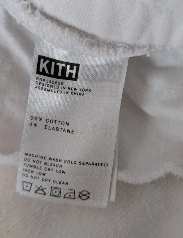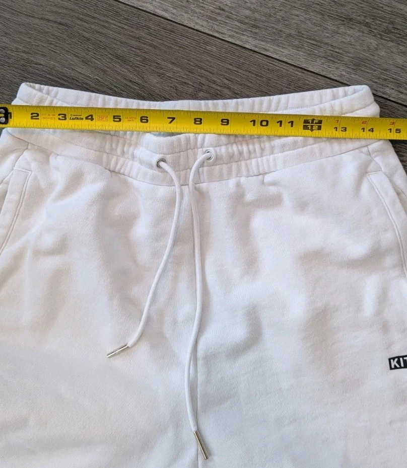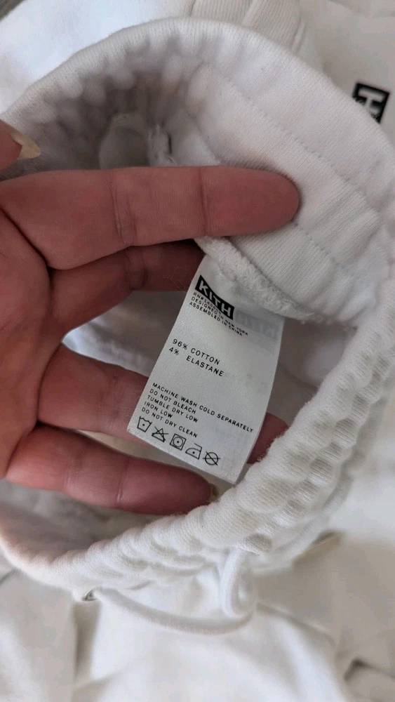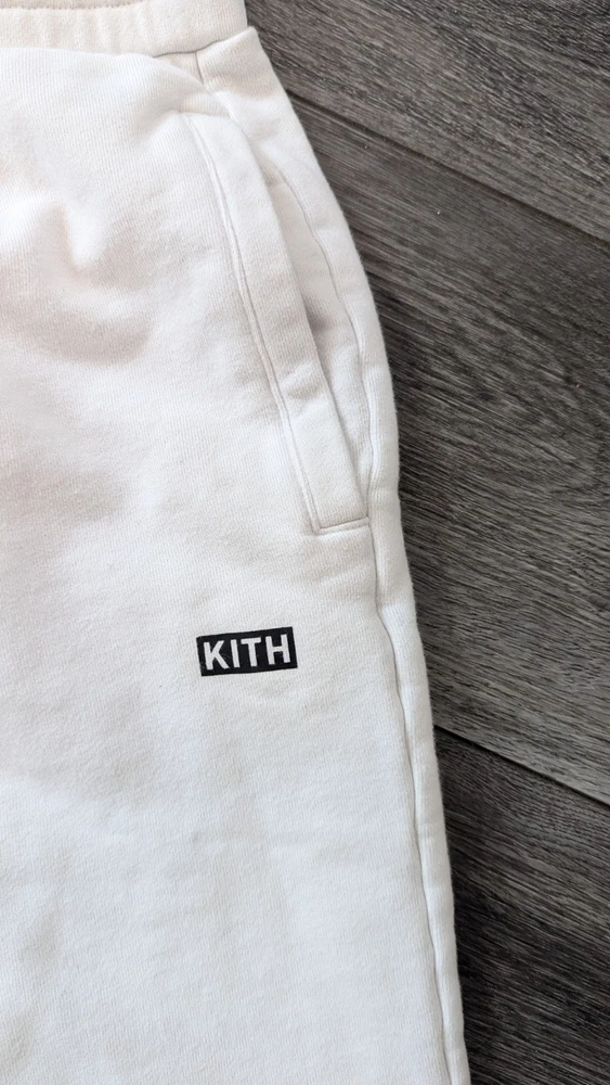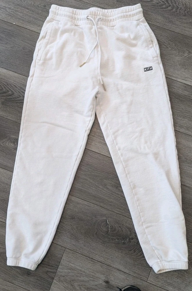 Elevate your activewear with these Kith Jogger Sweatpants in a crisp white color. These pants are perfect for any sport or activity, from running and jogging to gym and training. The drawstring closure and elastic waistband ensure a comfortable and secure fit, while the pockets provide convenience and functionality. The pants are made of a heavy-duty cotton blend knit fabric that is easy to care for and machine washable. The relaxed fit and preppy design make these pants a versatile addition to your wardrobe. The solid pattern and subtle Kith logo add a touch of designer style to your outfit. Whether you're hitting the track or running errands, these sweatpants are the perfect choice for any outdoor activity.