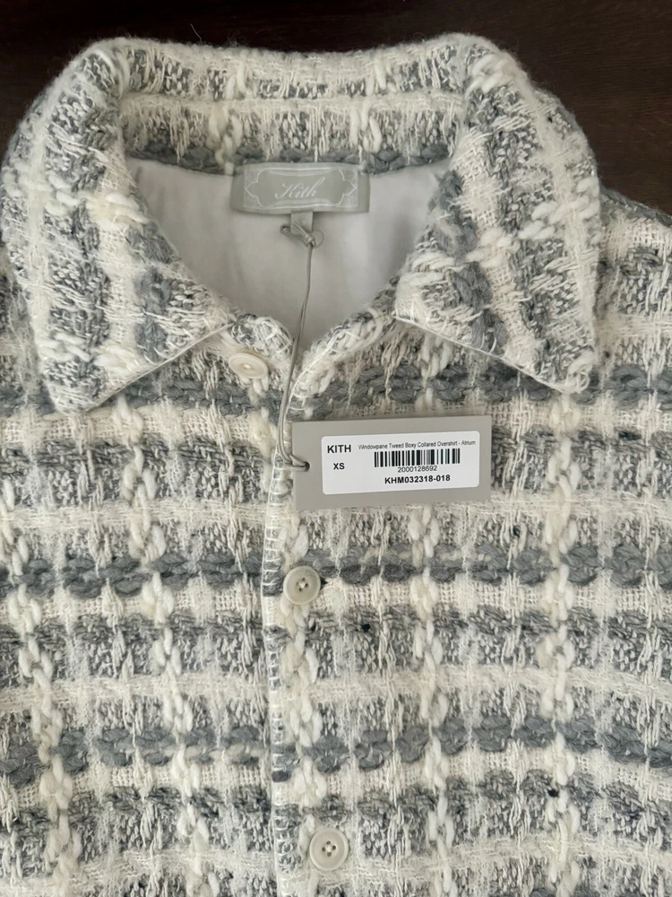 Kith Windowpane Tweed Boxy Collared Overshirt Size XS BRAND NEW SOLD OUT Can ship asap The Windowpane Tweed Boxy Collared Overshirt has a mixed knit composition, featuring an all-over plaid print. It is complete with Kith-branded button closures at the front and blanket-stitch detailing throughout. DETAILS Mixed knit Italian plaid fabric Kith-branded button closures at front and sleeve cuffs All-over blanket stitch detailing Style: khm032318-018 Color: Atrium Material: 30% Cotton / 26% Acrylic / 23% Wool / 18% Polyester / 3% Silk