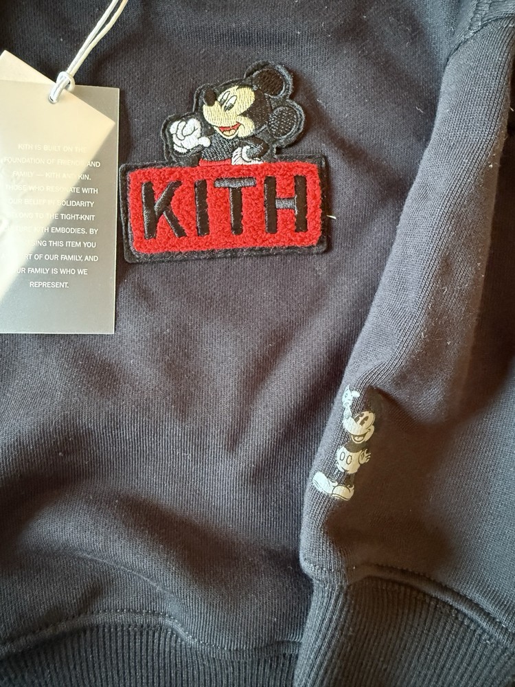 This is a Kith Baby X Disney Mickey Box Logo Hoodie in black, designed for ages 9-12 months. Made of 100% cotton knit fabric, this unisex baby and toddler outfit includes a hoodie featuring the iconic Disney character Mickey Mouse. The hoodie is accented with the KITH logo, making it a stylish and fun addition to any little one's wardrobe.