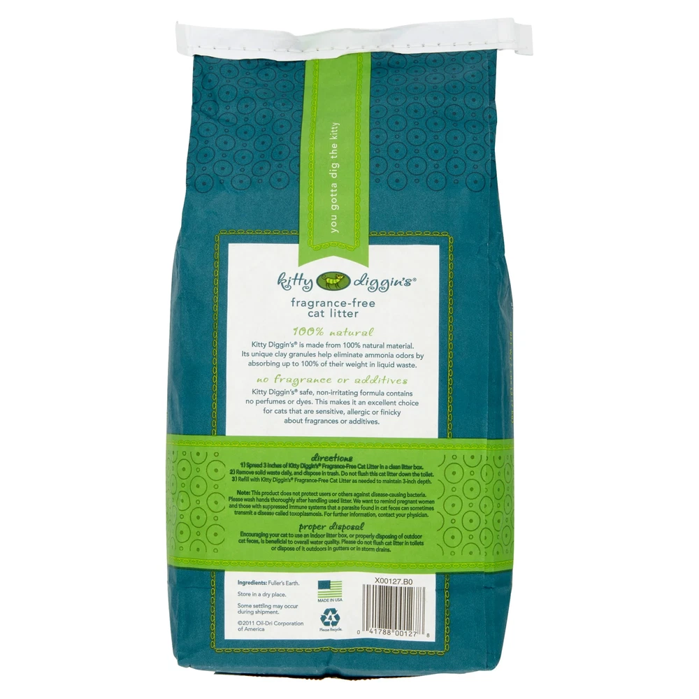 Menu Other Items Feedbacks About Us Contact Us Add To Favorites Kitty Diggins Fragrance-Free Cat Litter 100% natural No perfumes, dyes,additives Kitty Diggins Fragrance-Free Cat Litter is free from both perfumes and dyes, making it a great choice for cats who are sensitive or allergic to regular cat litters. Its unique 100% natural clay granules work to eliminate ammonia odors by absorbing up to 100% of their weight in liquid waste. When your kitty experiences this litter, they're going to dig it. Fragrance-free cat litter: you gotta dig the kitty Kitty Diggins cat litter is 100% natural No perfumes, dyes, or additives Each pack weighs 7lb Non Clumping Cat Litter Item Specification Ingredient preference Fragrance-Free Pet litter feature Odor Control Form Pellets Pet litter material Clay Container type Bag Weight 7.7 lbs Scent FRAGRANCE FREE Primary ingredient Clay Size 7 lbs Animal lifestage All Lifestages, Adult, Juvenile, Kitten, Senior Animal type Cat Dimensions Shipping Returns Additional Info Product Dimensions: . Weight: 7.7 lb