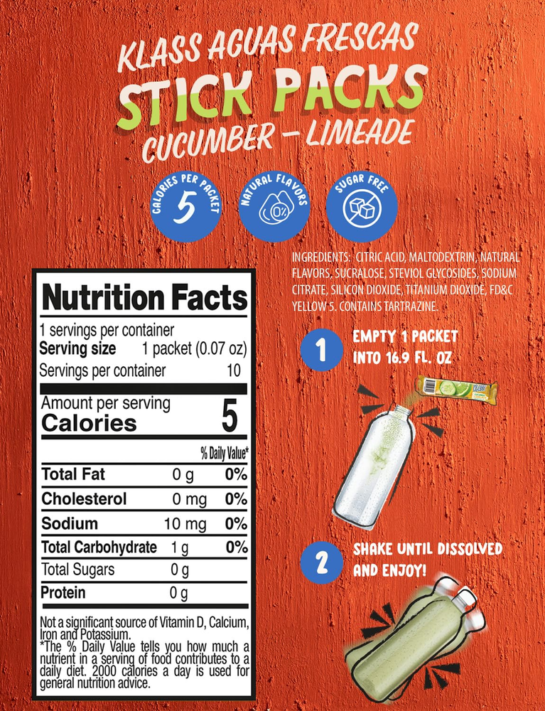 Store New Arrivals Add to Favorite View Feedback Contact Klass Aguas Frescas | Drink Mix Cucumber Limeade | Sugar Free Drinks! (40 Count Powder Stick Packets) Description Brand Klass Aguas Frescas Item Weight 0.07 Ounces Flavor Name Cucumber Limeade Units 2.8 Ounce Package Information Box Protein 0 Grams Manufacturer Klass Aguas Frescas Item Form Powder Package Dimensions 4.61 x 4.61 x 2.44 inches; 0.07 ounces Size 2.8 Ounce (Pack of 1) KLASS ANYTIME, ANYWHERE: The Klass Aguas Frescas brand is known for providing a little taste of our home for every occasion. We’re taking things from the dinner table to anywhere you go. Trips to the movies, gym, park, school or work just became MUY BUENO! With this Cucumber-Limeade Stick Pack you can take your Aguas Frescas on-the-go. AUTHENTIC FLAVORS: Add some variety to your everyday party with this Cucumber Limeade Pack containing 40 servings of Klass Aguas Frescas Stick Packs. Our Cucumber-Limeade Drink Mix is filled with 40 stick packets. CONVENIENT DRINK MIX PACKETS: Take the MUY DELICIOSO taste of Klass Aguas Frescas Stick Packs on-the-go. Add one powdered drink mix packet to 16 ounces of water, shake it up, and enjoy our fun and fresh traditional Mexican flavors. ALTERNATIVE TO SODA & FRUIT JUICE: These packets are a great alternative to soda, fruit juice, or artificially flavored drinks or drink mixes—they're perfect for on-the-go adults and kids alike! Use these powdered drink mix packets as a delicious water flavoring and water flavor enhancer to help you stay hydrated throughout the day. These are a great source of Vitamin D, Calcium, Iron & Potassium. LOW CALORIE, CLEAN INGREDIENTS: Klass Aguas Frescas Stick Packs are completely Sugar-Free. Our drink mixes are sweetened with naturally extracted and purified stevia. Flavored from natural sources. Each powdered drink mix packet contains 5 calories and a total 2 grams of carbohydrates. Take the delicious taste of Klass Aguas Frescas Stick Packs wherever you go. Shake it up anywhere with our fun and fresh traditional Mexican flavors. Klass Aguas Frescas Stick Pack are sugar-free. No artificial colors. Flavored from natural sources. One box of Klass Aguas Frescas Stick Pack contains 10 individual stick packs. Each made to mix with 16.9 fluid ounces (500 ml) of water. Klass Aguas Frescas Stick Pack mixes traditional fruity flavors for a deliciously refreshing taste. Shake it up! The new way to drink Aguas Frescas. ABOUT US We offer the best prices around on high quality products. Our E-store includes media such as books, movies, music and games while offering electronics, toys, sporting apparel, clothing, tools, general home, garden items and more. SHIPPING We are always working hard to ensure your package arrives as soon as possible. Please understand that some factors like weather, high postal traffic, and the performance of shipping companies are outside of our control. We offer free shipping to the lower 48 states and ship within 2 business days of payment, usually sooner. We do not accept P.O. Boxes. Please provide a physical address. RETURNS We offer a 30-Day Return Policy on items which you are not completely satisfied with. You have the option for a full-refund or an exchange of the item. No returns are available on items shipped outside of the USA. PAYMENT We accept PayPal. CONTACT US This page content is yet to come Please ad us to your favorite seller and visit again later Thank You CUSTOMER SATISFACTION We try our very best to make sure every customer is completely satisfied. If there's a problem, message us! We're happy to help.