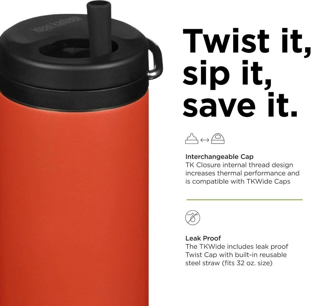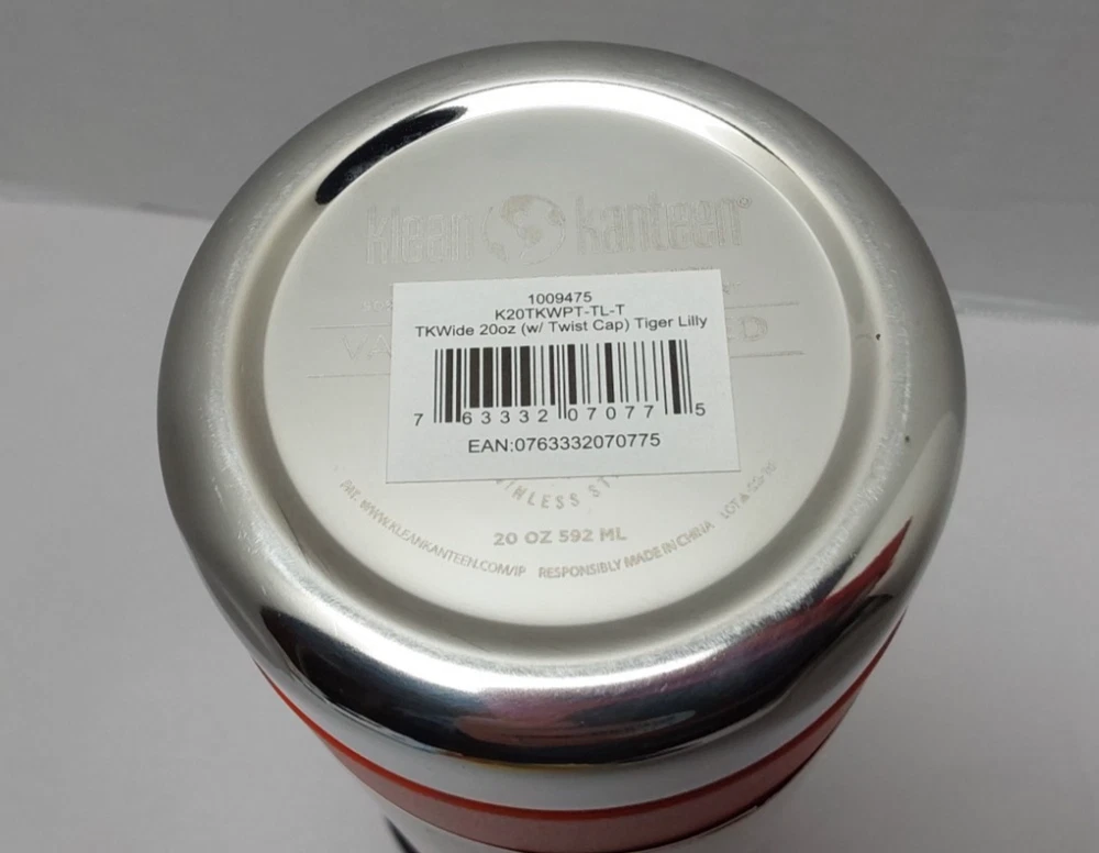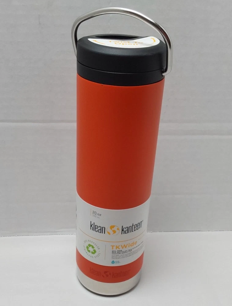Klean Kanteen 20 oz TKWide Insulated Water Bottle Tiger Lily Leak Proof BPA Free Climate Lock vacuum insulation; Made from certified 90 percent post-consumer recycled 18/8 stainless steel Splash proof lid; Ergonomic stainless steel handle Colored mugs come with chip-resistant Klean Coat finish (stainless excluded); Choose from solid colors or laser engraved graphics BPA-free; Easy clean Wash your cup before first use; Hand wash with warm soapy water or diluted vinegar and baking soda; Do not use bleach or cleaners containing chlorine or abrasives