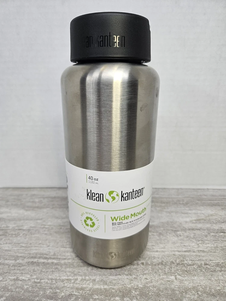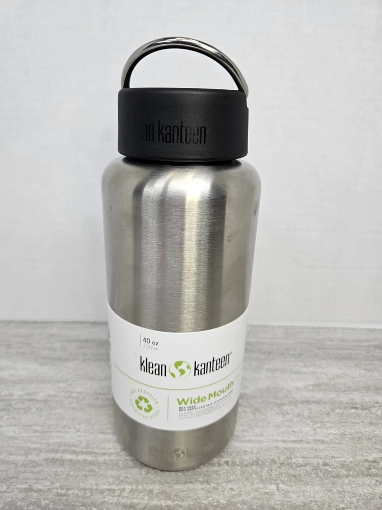 The Klean Kanteen Classic Wide Mouth Stainless Steel Water Bottle is a 40oz silver colored water bottle made of stainless steel. It features a wide mouth design and is branded with the Klean Kanteen logo. Ideal for outdoor activities such as camping and hiking, this water bottle is perfect for staying hydrated on the go.