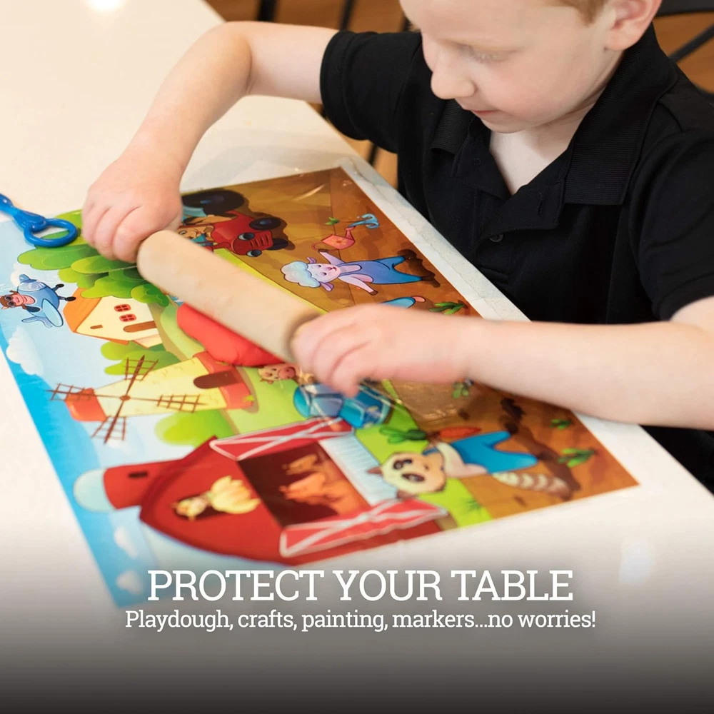 FUN IMAGES KIDS LOVE: This 40-pack set of placemats that stick features vibrant colors and delightful designs that will excite your child and keep them occupied as they explore new, imaginary worlds! STAYS IN PLACE: With a stick on placemat, your children's mat will no longer end up on the floor! Temporary adhesive strips on all 4 sides make it difficult for toddlers to pull them free, and yet they're easy enough for adults to remove when done FULL COVERAGE: The large 12"x18" size means your infant can eat off the mat itself (skip the plate), without concerns about the table cleanliness! Your child will learn independence and self-feeding skills, and you'll enjoy easy clean up later EASY TO GRAB-AND-GO: Unlike some competitors, our placemats are individually folded, which makes them much more convenient to grab and go! Simply grab one from the top of the stack, and you're ready for grandma's house or a restaurant SAFE FOR KIDS: Our sticky placemats for toddlers are tested and verified by third-party labs to ensure that the plastic meets or exceeds all safety requirements (BPA, PVC, and Lead-free). We don't cut corners on children's health and safety Product Description Disposable Placemats for Eating, Crafting and Travel! HomeWorthy is dedicated to providing high quality products that are safety-tested and approved for use by everyone, from infants to adults! We offer a large assortment of disposable placemats that help protect you and your loved ones from lingering yuckiness on public surfaces. With disposable placemats that stick to the surface, you will rest assured that you have a clean surface on-the-go. Protection for Restaurants They provide a clean surface for kids to eat off, and they also protect tables from spills and messes. You'll enjoy easy cleanup afterwards, and your servers will appreciate you! Ditch the plate...just let them eat right on the mat! Multi-Purpose Placemats Your kids will love our 40 pack placemats of various Animal designs! They're easy to slip into your purse for travel, or leave in your glove box for when you're on the go. They also make great airplane tray covers (they fit all tray sizes---simply pull off the sticky strips and fold them over the edges of your tray), traditional meal placemats, and can be used in any social situation when you need a guaranteed clean surface for your child. SAFE EATING SURFACE Whether your child has food allergies, or you just want to protect them from dirty surfaces and more---we have it covered (literally). EASY CLEANUP WHEN CRAFTING Enjoy easy clean up for meals or messy children's crafts. No longer worry about markers, paints or play dough on your delicate tables! STICKY ADHESIVE STRIPS We know those little ones love to pull their placemats to the floor. With 4 adhesive sticky strips on the backside, these mats will stay in place where you put them!