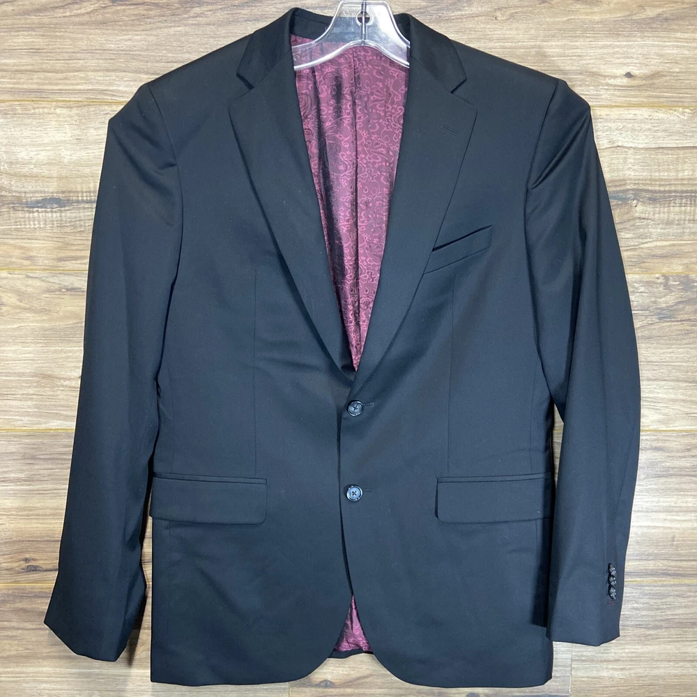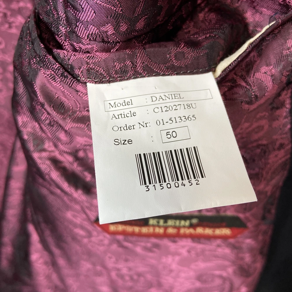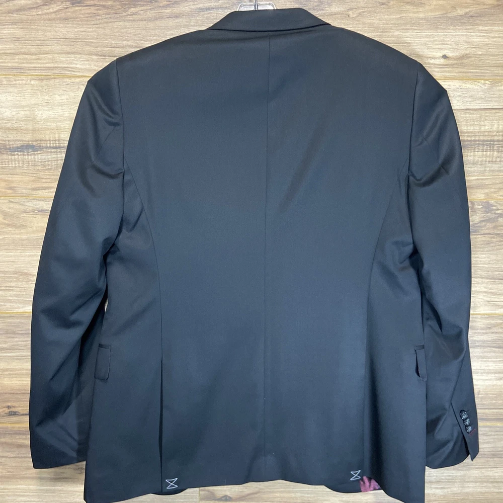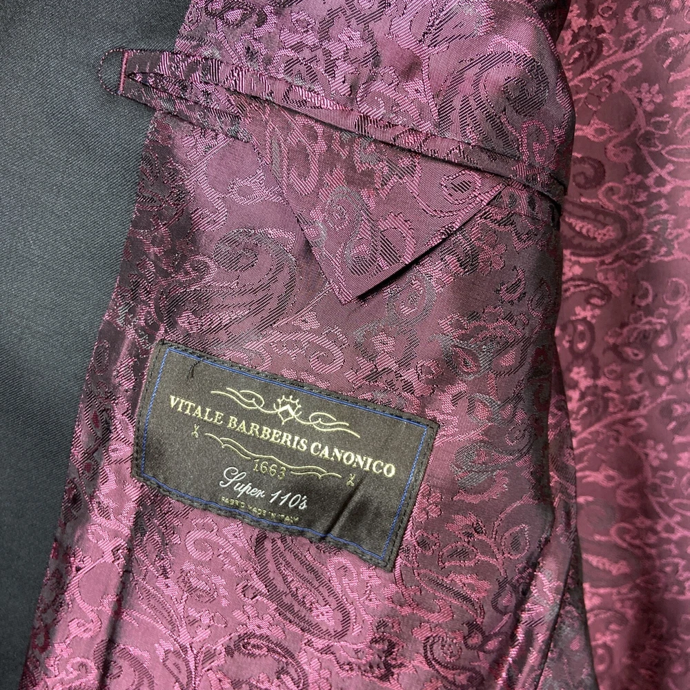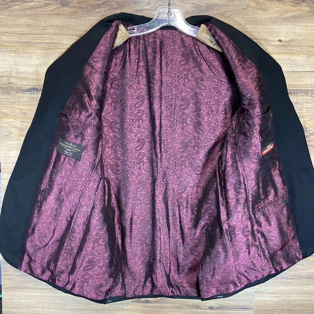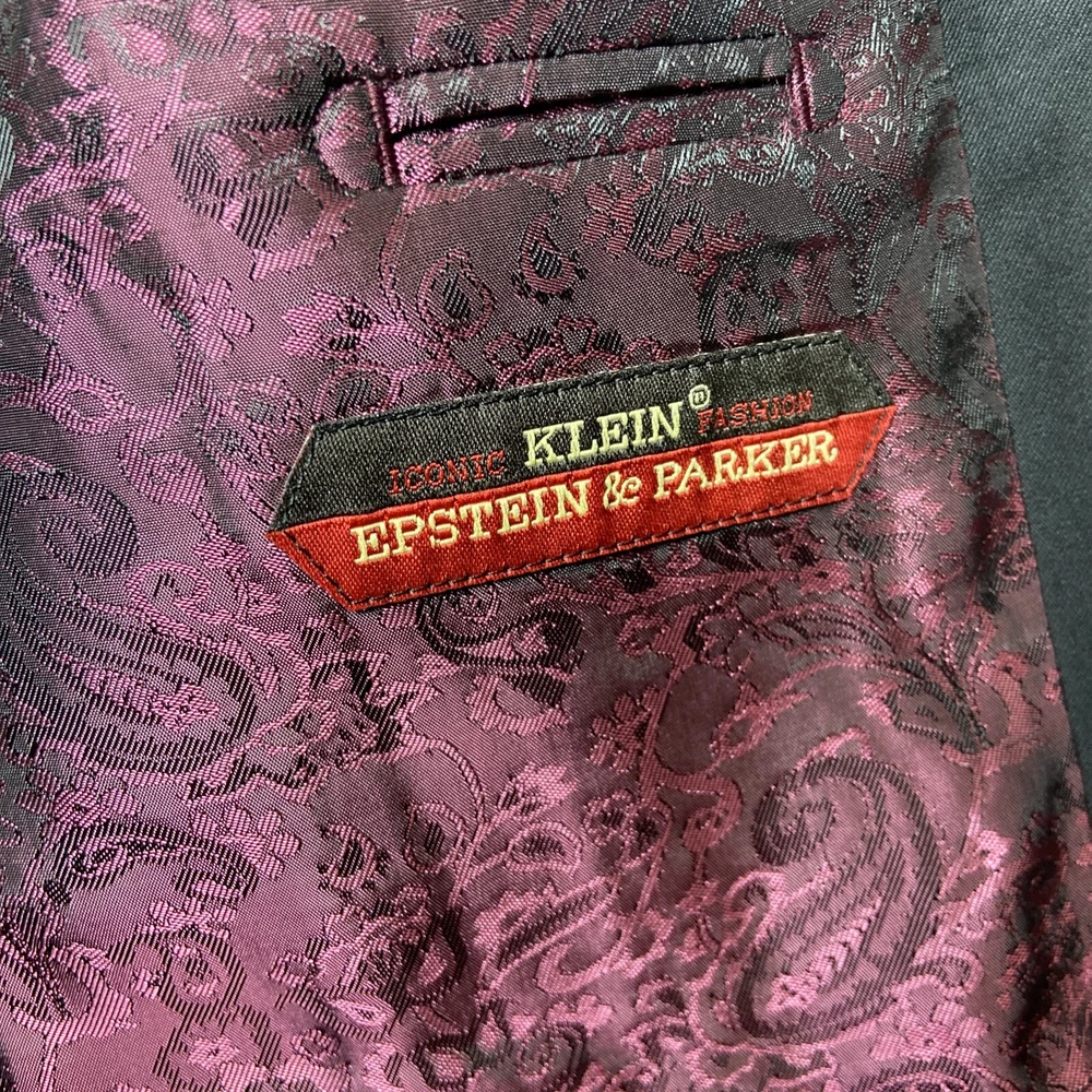 Elevate your style with this exquisite Klein Epstein & Parker blazer, crafted from high-quality Vitale Barberis Canonico Super 110s fabric in classic black. This 2-piece blazer features a peak lapel style, two-button front button style, and double-vented jacket vent style, making it a perfect fit for any occasion, be it casual, formal, business, or even weddings and parties. The blazer comes with inner pockets and custom features, and is handmade to perfection for a regular fit. The blazer is dry clean only and is made of viscose material with a silk lining material. The blazer is a solid pattern and comes in chest size 42 and waist size 42 in. With its sophisticated designer look, this blazer is the perfect addition to any wardrobe. Condition is pre-owned; item has been cleaned per manufacturer instructions. Shipped with USPS Ground Advantage.