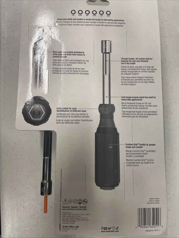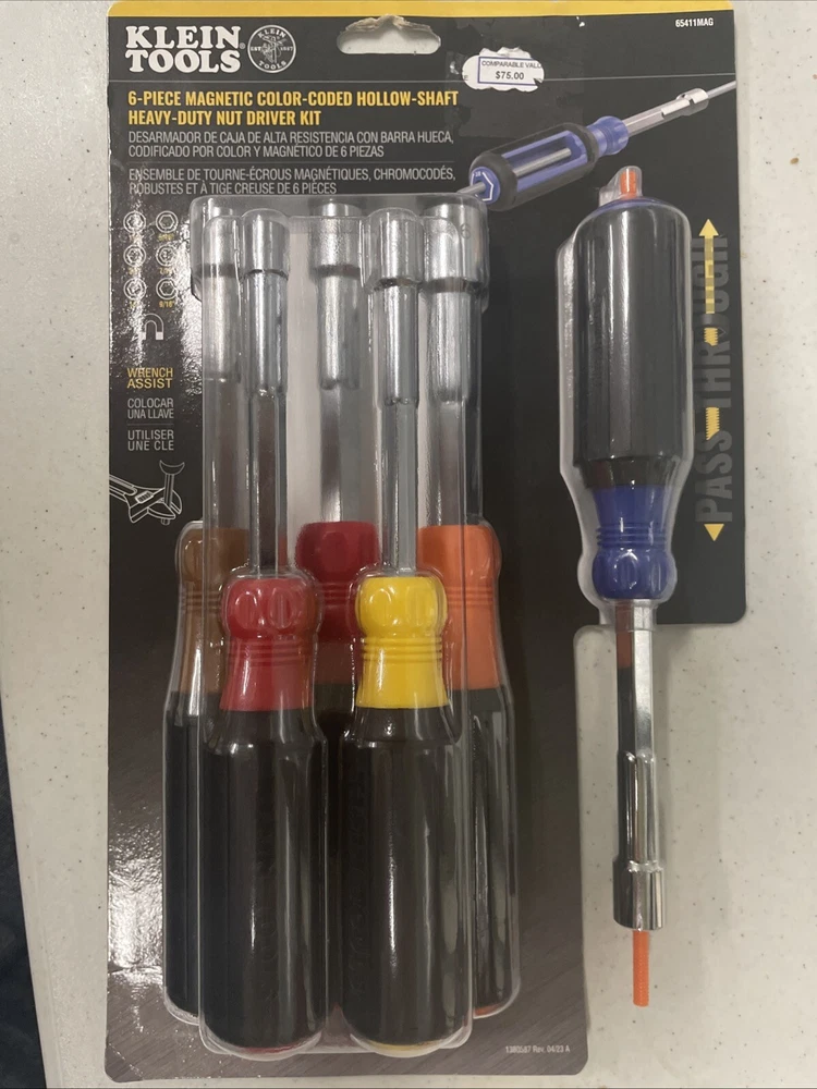Klein Tools 65411 Hollow-Shaft Nut Driver Set, Heavy-Duty, Color-Coded Hex Sizes 1/4 to 9/16-Inch, Cushion-Grip Handles, 6-Piece