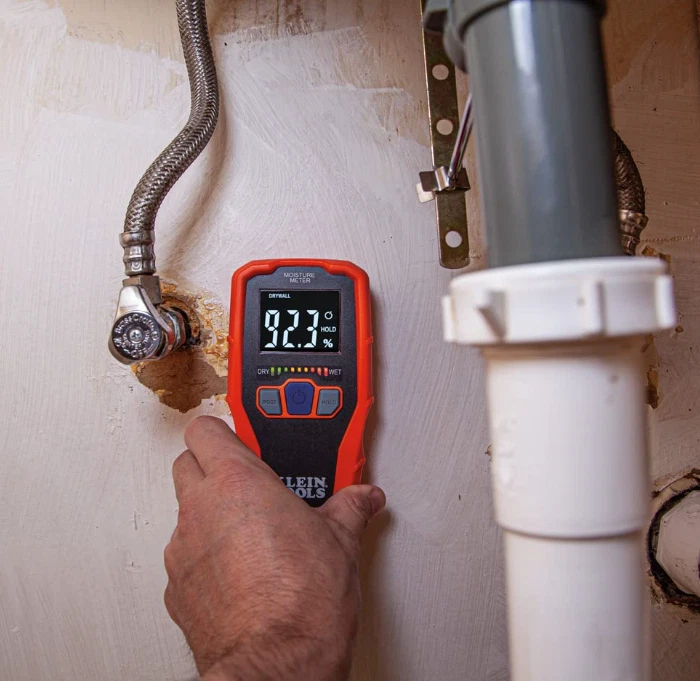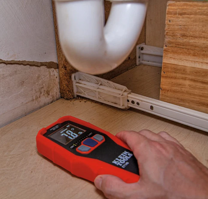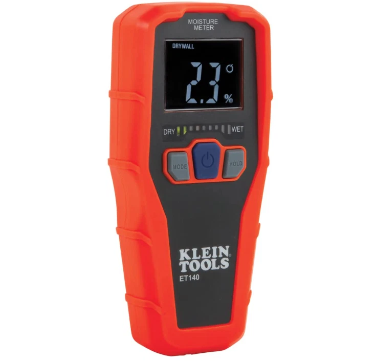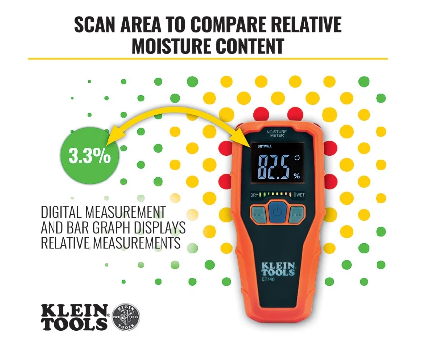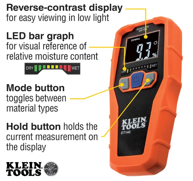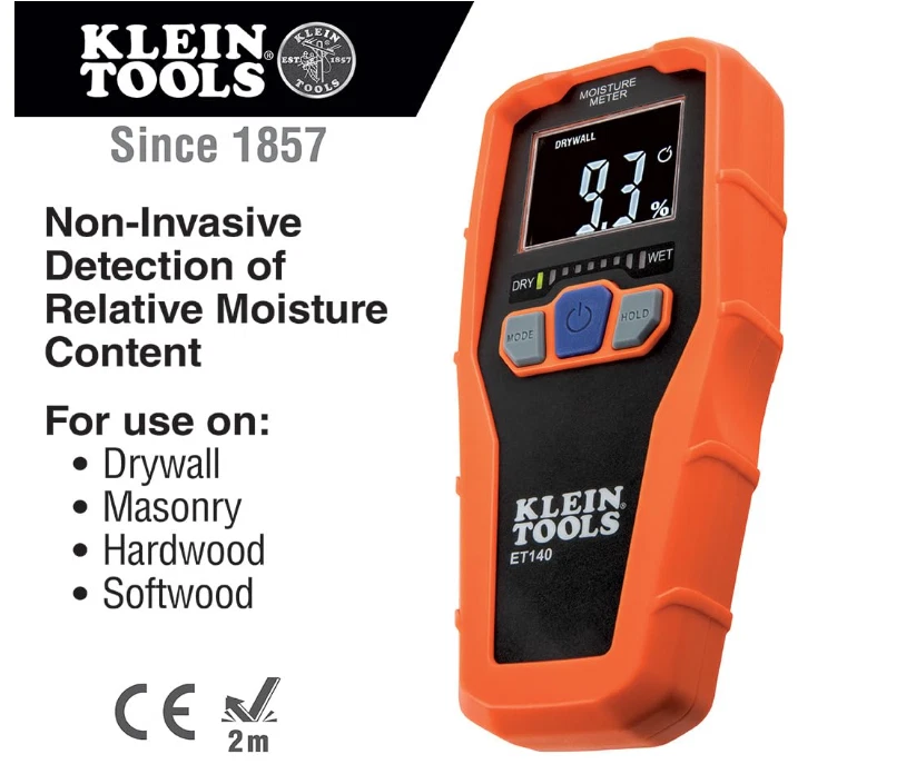 Klein Tools ET140 Pinless Moisture Meter - Detects 3/4"" Below Surface WATER LEAK DETECTOR detects relative moisture content from leaks and flooding PINLESS MOISTURE METER measures relative moisture content in building materials NONDESRUCTIVE DETECTION up to 3/4-Inch deep using Electromagnetic field (EMF) technology USE ON DRYWALL, MASONRY, HARDWOOD, AND SOFTWOOD; calibrated for these materials only REVERSE-CONTRAST DISPLAY for easy viewing of reading and nine LED bars to indicate moisture range FULL FEATURE TOOL includes hold, low battery, and auto-power off functions COMPLETE MOISTURE METER KIT includes meter with 2m drop protection, 9V battery, and instruction manual When you receive your order and have any queries or concerns about the product, feel free to message us. We guarantee 100% resolution for you. Our commitment is to provide high-quality products and exceptional customer service, ensuring your trust and satisfaction.