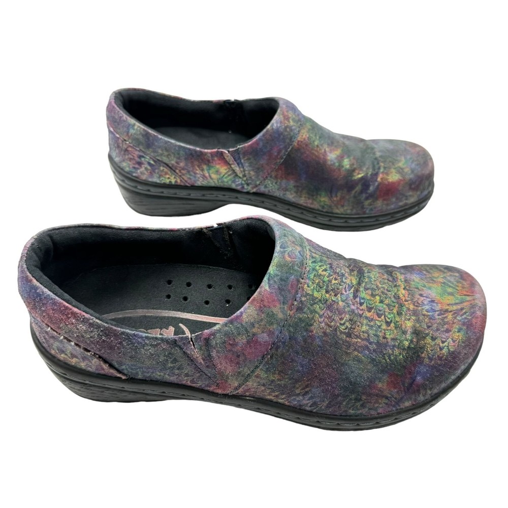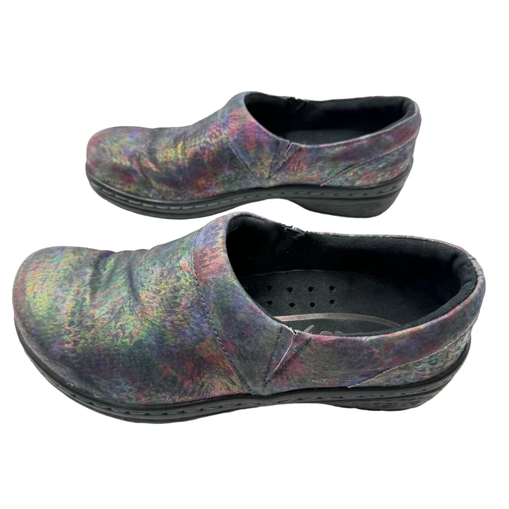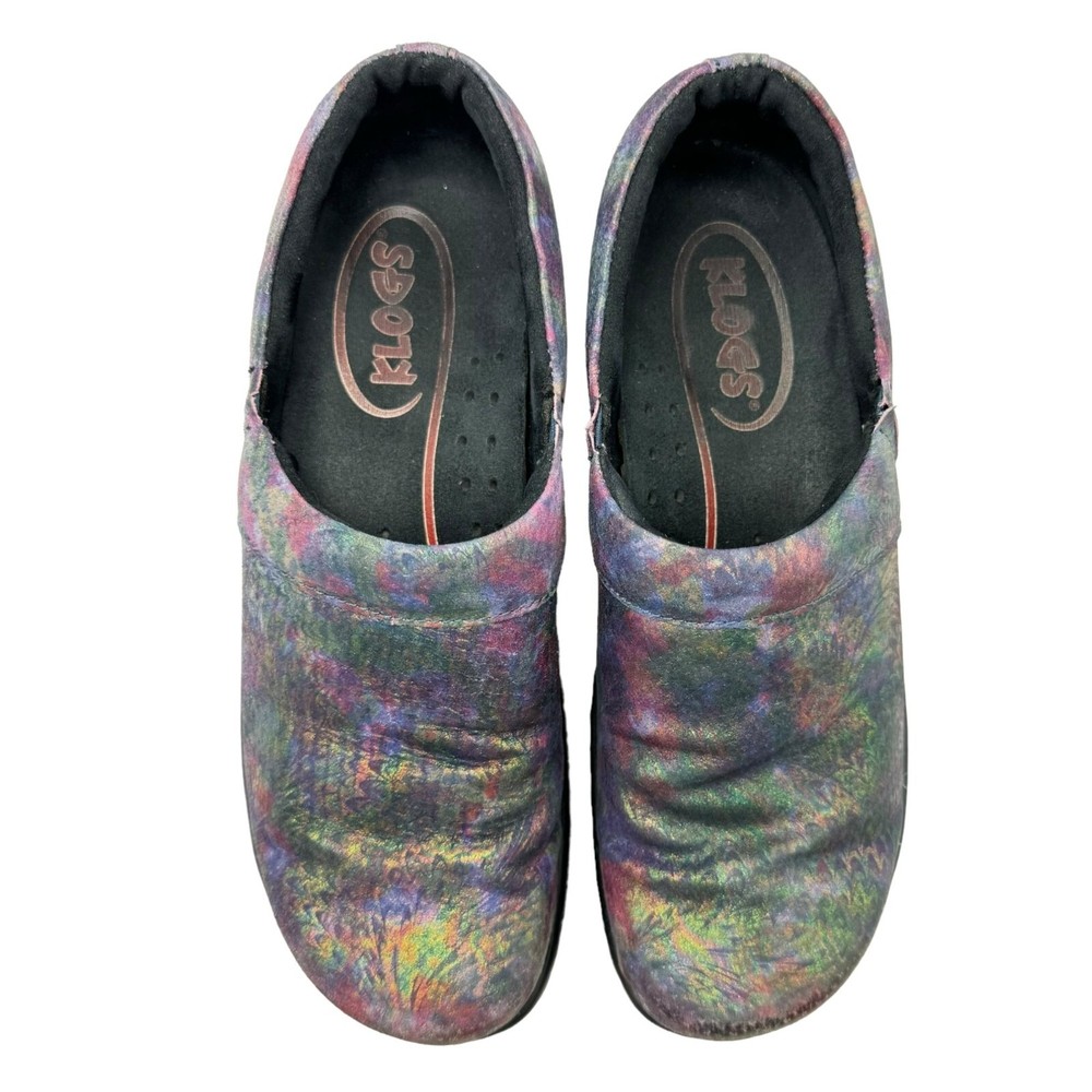 Klogs Mission Pyramid Women's Leather Work Clogs - Women's size 7.5M - Rainbow multi color in a shiny iridescent foil finish - Padded collar - Flexible strobel construction - Shock absorbent midsole - Elastic gore - Removable footbed - Polyurethane Outsole - MARK II ASTM F1677 tested slip-resistant outsole - Non-marking outsole - Anti-microbial microfiber lining - Printed leather upper - Accommodates orthotics - Generous toe box - Impact absorbing arch support and heel cup - 1" low wedge heel Size: Womens 7.5 Condition: Pre-Owned Shoes are in very good preowned condition with no flaws.